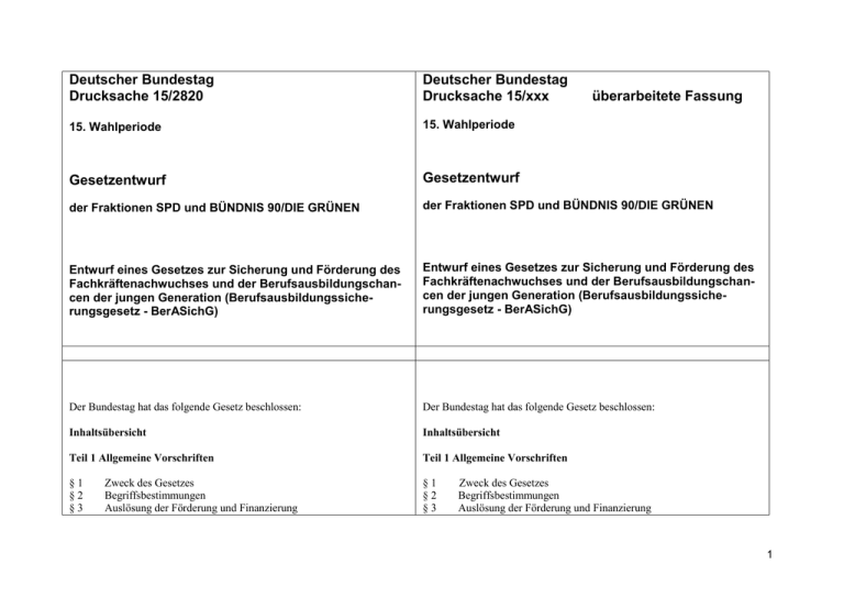 Deutscher Bundestag Drucksache 15/2820 Deutscher Bundestag Drucksache 15/xxx 15. Wahlperiode 15. Wahlperiode Gesetzentwurf Gesetzentwurf der Fraktionen SPD und BÜNDNIS 90/DIE GRÜNEN der Fraktionen SPD und BÜNDNIS 90/DIE GRÜNEN Entwurf eines Gesetzes zur Sicherung und Förderung des Fachkräftenachwuchses und der Berufsausbildungschancen der jungen Generation (Berufsausbildungssicherungsgesetz - BerASichG) Entwurf eines Gesetzes zur Sicherung und Förderung des Fachkräftenachwuchses und der Berufsausbildungschancen der jungen Generation (Berufsausbildungssicherungsgesetz - BerASichG) Der Bundestag hat das folgende Gesetz beschlossen: Der Bundestag hat das folgende Gesetz beschlossen: Inhaltsübersicht Inhaltsübersicht Teil 1 Allgemeine Vorschriften Teil 1 Allgemeine Vorschriften §1 §2 §3 §1 §2 §3 Zweck des Gesetzes Begriffsbestimmungen Auslösung der Förderung und Finanzierung überarbeitete Fassung Zweck des Gesetzes Begriffsbestimmungen Auslösung der Förderung und Finanzierung 1 Teil 2 Förderung Teil 2 Förderung §4 §5 §6 §7 §8 §4 §5 §6 §7 §8 Förderungsmaßnahmen Förderung der Bereitstellung zusätzlicher Ausbildungsplätze Förderung durch Leistungsausgleich Anteilige Reduzierung der Förderbeträge Verfahren der Förderung Förderungsmaßnahmen Förderung der Bereitstellung zusätzlicher Ausbildungsplätze Förderung durch Leistungsausgleich Anteilige Reduzierung der Förderbeträge Verfahren der Förderung Teil 3 Finanzierung Teil 3 Finanzierung §9 § 10 § 11 § 12 § 13 § 14 § 15 §9 Berufsausbildungssicherungsabgabe § 10 Befreiung von der Abgabepflicht § 11 Höhe der Abgabe § 12 Anrechnung finanzieller Leistungen § 13 Vorrang tarifvertraglicher Regelungen § 14 Verfahren der Erhebung [Hinweis: § 15 wird gestrichen – daher neue Nummerierung!] Berufsausbildungssicherungsabgabe Befreiung von der Abgabepflicht Höhe der Abgabe Anrechnung finanzieller Leistungen Vorrang tarifvertraglicher Regelungen Verfahren der Erhebung Vorfinanzierung durch den Bund Teil 4 Berufsausbildungssicherungsfonds Teil 4 Berufsausbildungssicherungsfonds § 16 § 17 § 18 § 19 § 15 § 16 § 17 § 18 § 20 § 21 Errichtung des Fonds und Stellung im Rechtsverkehr Verwendung der Fondsmittel und Verwaltung Finanzierung, Vermögenstrennung und Auflösung des Fonds Wirtschaftsplan, Jahresrechnung und Anwendung der Vorschriften der Bundeshaushaltsordnung Beirat Mitwirkung des Bundesinstituts für Berufsbildung § 19 § 20 Errichtung des Fonds und Stellung im Rechtsverkehr Verwendung der Fondsmittel und Verwaltung Finanzierung, Vermögenstrennung und Auflösung des Fonds Wirtschaftsplan, Jahresrechnung und Anwendung der Vorschriften der Bundeshaushaltsordnung Beirat Mitwirkung des Bundesinstituts für Berufsbildung Teil 5 Gemeinsame Vorschriften Teil 5 Gemeinsame Vorschriften § 22 § 23 § 24 § 25 § 21 § 22 § 23 § 24 Auskunftspflicht Bußgeldvorschriften Verwendung der Daten Inkrafttreten, Außerkrafttreten Auskunftspflicht Bußgeldvorschriften Verwendung der Daten Inkrafttreten, Außerkrafttreten 2 Teil 1 Allgemeine Vorschriften Teil 1 Allgemeine Vorschriften §1 Zweck des Gesetzes §1 Zweck des Gesetzes Zweck dieses Gesetz ist es, den Fachkräftenachwuchs und die Berufsausbildungschancen der jungen Generation zu sichern und zu fördern, um durch Ausschöpfung des gesamten zukünftigen Fachkräftepotentials die Wettbewerbsfähigkeit Deutschlands nachhaltig zu gewährleisten. Dabei wird vorrangig auf die Eigenverantwortung und das Eigeninteresse der Arbeitgeber an qualifizierten Fachkräften gesetzt. Die Förderung greift als Hilfe zur Selbsthilfe nur ein, wenn die Arbeitgeber ihrer besonderen Verantwortung, im eigenen Interesse junge Menschen auszubilden, nicht ausreichend nachkommen. Zweck dieses Gesetz ist es, den Fachkräftenachwuchs und die Berufsausbildungschancen der jungen Generation zu sichern und zu fördern, um durch Ausschöpfung des gesamten zukünftigen Fachkräftepotentials die Wettbewerbsfähigkeit Deutschlands nachhaltig zu gewährleisten und die Ausbildungsleistung der Arbeitgeber in Deutschland zu steigern. Dabei wird vorrangig auf die Eigenverantwortung und das Eigeninteresse der Arbeitgeber an qualifizierten Fachkräften gesetzt. Die Förderung greift als Hilfe zur Selbsthilfe nur ein, wenn die Arbeitgeber ihrer besonderen Verantwortung, im eigenen Interesse junge Menschen auszubilden, nicht ausreichend nachkommen. §2 Begriffsbestimmungen §2 Begriffsbestimmungen (1) Stichtag im Sinne dieses Gesetzes ist der 30. September eines laufenden Jahres. (1) unverändert (2) Bezugsjahr ist das Ausbildungsjahr, das am 1. Oktober des dem jeweiligen Stichtag vorangegangenen Jahres begonnen hat. (2) unverändert (3) Auszubildende im Sinne dieses Gesetzes sind sozialversicherungspflichtig Beschäftigte, mit denen der betreffende Arbeitgeber einen Berufsausbildungsvertrag zur betrieblichen Ausbildung auf der Grundlage einer nach dem Berufsbildungsgesetz, der Handwerksordnung oder einer sonstigen bundesrechtlichen Rechtsvorschrift erlassenen Ausbildungsordnung oder Ausbildungsregelung abgeschlossen hat. (3) Auszubildende im Sinne dieses Gesetzes sind sozialversicherungspflichtig Beschäftigte, mit denen der betreffende Arbeitgeber einen Berufsausbildungsvertrag zur betrieblichen Ausbildung in einem nach dem Berufsbildungsgesetz, der Handwerksordnung oder einer sonstigen bundesgesetzlichen Regelung anerkannten Beruf abgeschlossen hat. (4) Wird in diesem Gesetz auf die Anzahl der bei einem Arbeitgeber sozial- (4) Bei der Feststellung der Anzahl der bei einem Arbeitgeber sozialversi- 3 versicherungspflichtig Beschäftigten abgestellt, sind Teilzeitbeschäftigte mit einer regelmäßigen wöchentlichen Arbeitszeit von nicht mehr als 10 Stunden mit 0,25, von nicht mehr als 20 Stunden mit 0,5 und von nicht mehr als 30 Stunden mit 0,75 zu berücksichtigen. Sozialversicherungspflichtig Beschäftigte mit einer regelmäßigen wöchentlichen Arbeitszeit von mehr als 30 Stunden 
