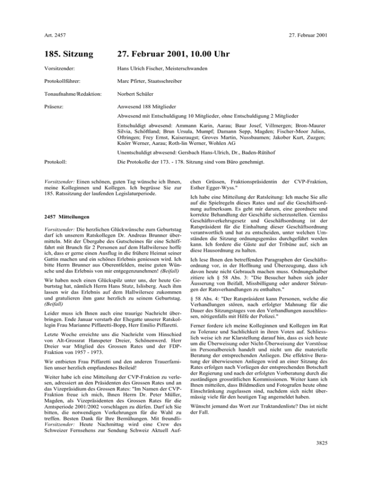 Art. 2457 27. Februar 2001 185. Sitzung 27. Februar 2001, 10.00 Uhr Vorsitzender: Hans Ulrich Fischer, Meisterschwanden Protokollführer: Marc Pfirter, Staatsschreiber Tonaufnahme/Redaktion: Norbert Schüler Präsenz: Anwesend 188 Mitglieder Abwesend mit Entschuldigung 10 Mitglieder, ohne Entschuldigung 2 Mitglieder Entschuldigt abwesend: Ammann Karin, Aarau; Baur Josef, Villmergen; Bron-Maurer Silvia, Schöftland; Brun Ursula, Mumpf; Damann Sepp, Magden; Fischer-Moor Julius, Oftringen; Frey Ernst, Kaiseraugst; Groves Martin, Nussbaumen; Jakober Kurt, Zuzgen; Knörr Werner, Aarau; Roth-lin Werner, Wohlen AG Unentschuldigt abwesend: Gersbach Hans-Ulrich, Dr., Baden-Rütihof Protokoll: Die Protokolle der 173. - 178. Sitzung sind vom Büro genehmigt. Vorsitzender: Einen schönen, guten Tag wünsche ich Ihnen, meine Kolleginnen und Kollegen. Ich begrüsse Sie zur 185. Ratssitzung der laufenden Legislaturperiode. 2457 Mitteilungen Vorsitzender: Die herzlichen Glückwünsche zum Geburtstag darf ich unserem Ratskollegen Dr. Andreas Brunner übermitteln. Mit der Übergabe des Gutscheines für eine Schifffahrt mit Brunch für 2 Personen auf dem Hallwilersee hoffe ich, dass er gerne einen Ausflug in die frühere Heimat seiner Gattin machen und ein schönes Erlebnis geniessen wird. Ich bitte Herrn Brunner aus Oberentfelden, meine guten Wünsche und das Erlebnis von mir entgegenzunehmen! (Beifall) Wir haben noch einen Glückspilz unter uns, der heute Geburtstag hat, nämlich Herrn Hans Stutz, Islisberg. Auch ihm lassen wir das Erlebnis auf dem Hallwilersee zukommen und gratulieren ihm ganz herzlich zu seinem Geburtstag. (Beifall) Leider muss ich Ihnen auch eine traurige Nachricht überbringen. Ende Januar verstarb der Ehegatte unserer Ratskollegin Frau Marianne Piffaretti-Bopp, Herr Emilio Piffaretti. Letzte Woche erreichte uns die Nachricht vom Hinschied von Alt-Grossrat Hanspeter Dreier, Schönenwerd. Herr Dreier war Mitglied des Grossen Rates und der FDPFraktion von 1957 - 1973. Wir entbieten Frau Piffaretti und den anderen Trauerfamilien unser herzlich empfundenes Beileid! Weiter habe ich eine Mitteilung der CVP-Fraktion zu verlesen, adressiert an den Präsidenten des Grossen Rates und an das Vizepräsidium des Grossen Rates: "Im Namen der CVPFraktion freue ich mich, Ihnen Herrn Dr. Peter Müller, Magden, als Vizepräsidenten des Grossen Rates für die Amtsperiode 2001/2002 vorschlagen zu dürfen. Darf ich Sie bitten, die notwendigen Vorkehrungen für die Wahl zu treffen. Besten Dank für Ihre Bemühungen. Mit freundliVorsitzender: Heute Nachmittag wird eine Crew des Schweizer Fernsehens zur Sendung Schweiz Aktuell Auf- chen Grüssen, Fraktionspräsidentin der CVP-Fraktion, Esther Egger-Wyss." Ich habe eine Mitteilung der Ratsleitung: Ich mache Sie alle auf die Spielregeln dieses Rates und auf die Geschäftsordnung aufmerksam. Es geht mir darum, eine geordnete und korrekte Behandlung der Geschäfte sicherzustellen. Gemäss Geschäftsverkehrsgesetz und Geschäftsordnung ist der Ratspräsident für die Einhaltung dieser Geschäftsordnung verantwortlich und hat zu entscheiden, unter welchen Umständen die Sitzung ordnungsgemäss durchgeführt werden kann. Ich fordere die Gäste auf der Tribüne auf, sich an diese Hausordnung zu halten. Ich lese Ihnen den betreffenden Paragraphen der Geschäftsordnung vor, in der Hoffnung und Überzeugung, dass ich davon heute nicht Gebrauch machen muss. Ordnungshalber zitiere ich § 58 Abs. 3: "Die Besucher haben sich jeder Äusserung von Beifall, Missbilligung oder anderer Störungen der Ratsverhandlungen zu enthalten." § 58 Abs. 4: "Der Ratspräsident kann Personen, welche die Verhandlungen stören, nach erfolgter Mahnung für die Dauer des Sitzungstages von den Verhandlungen ausschliessen, nötigenfalls mit Hilfe der Polizei." Ferner fordere ich meine Kolleginnen und Kollegen im Rat zu Toleranz und Sachlichkeit in ihren Voten auf. Schliesslich weise ich zur Klarstellung darauf hin, dass es sich heute um die Überweisung oder Nicht-Überweisung der Vorstösse im Personalbereich handelt und nicht um die materielle Beratung der entsprechenden Anliegen. Die effektive Beratung der überwiesenen Anliegen wird an einer Sitzung des Rates erfolgen nach Vorliegen der entsprechenden Botschaft der Regierung und nach der erfolgten Vorberatung durch die zuständigen grossrätlichen Kommissionen. Weiter kann ich Ihnen mitteilen, dass Bildmedien und Fotografen heute ohne Einschränkung zugelassen sind, nachdem sich nicht übermässig viele für den heutigen Tag angemeldet haben. Wünscht jemand das Wort zur Traktandenliste? Das ist nicht der Fall. 3825 27. Februar 2001 nahmen machen. Dies nicht zum Thema des heutigen Tages, sondern als Bericht zu den Wahlen des kommenden Wochenendes. Regierungsrätliche Vernehmlassungen an Bundesbehörden: 1. Vom 17. Januar 2001 an das Eidg. Departement des Innern, Bern, zum Entwurf eines Bundesgesetzes über den internationalen Kulturgütertransfer (Kulturgütertransfergesetz; KGTG). 2. Vom 24. Januar 2001 an die Geschäftsprüfungskommission des Nationalrates, Bern, zur Aussprache mit den Kantonsregierungen zum Thema "Sekten" und vereinnahmende Bewegungen in der Schweiz. 3. Vom 24. Januar 2001 an das Eidg. Departement für Umwelt, Verkehr, Energie und Kommunikation, Bern, zur Revision des Strassenverkehrsgesetzes; Vernehmlassung betreffend MEDRALEX als Konzept zur Feststellung der Fahrunfähigkeit. Verwaltungsgerichtsbeschwerden gegen Beschlüsse des Grossen Rates: Entscheide: 1. Gemäss Urteil vom 31. Mai 2000 hiess das Verwaltungsgericht die Beschwerde von Robert und Edith Frei-Götschmann, Würenlingen, und Edi Hagenbucher, Oetwil a.d.L., gegen den Beschluss des Grossen Rates betreffend Nutzungsplanung der Gemeinde Würenlingen teilweise - bezüglich des Teilstücks im Umfange von ca. 800 m2, vormals 1. Bautiefe - gut. Soweit die Beschwerden mehr oder anderes verlangten, wurden sie abgewiesen. 2. Gemäss Urteil vom 7. November 2000 wies d