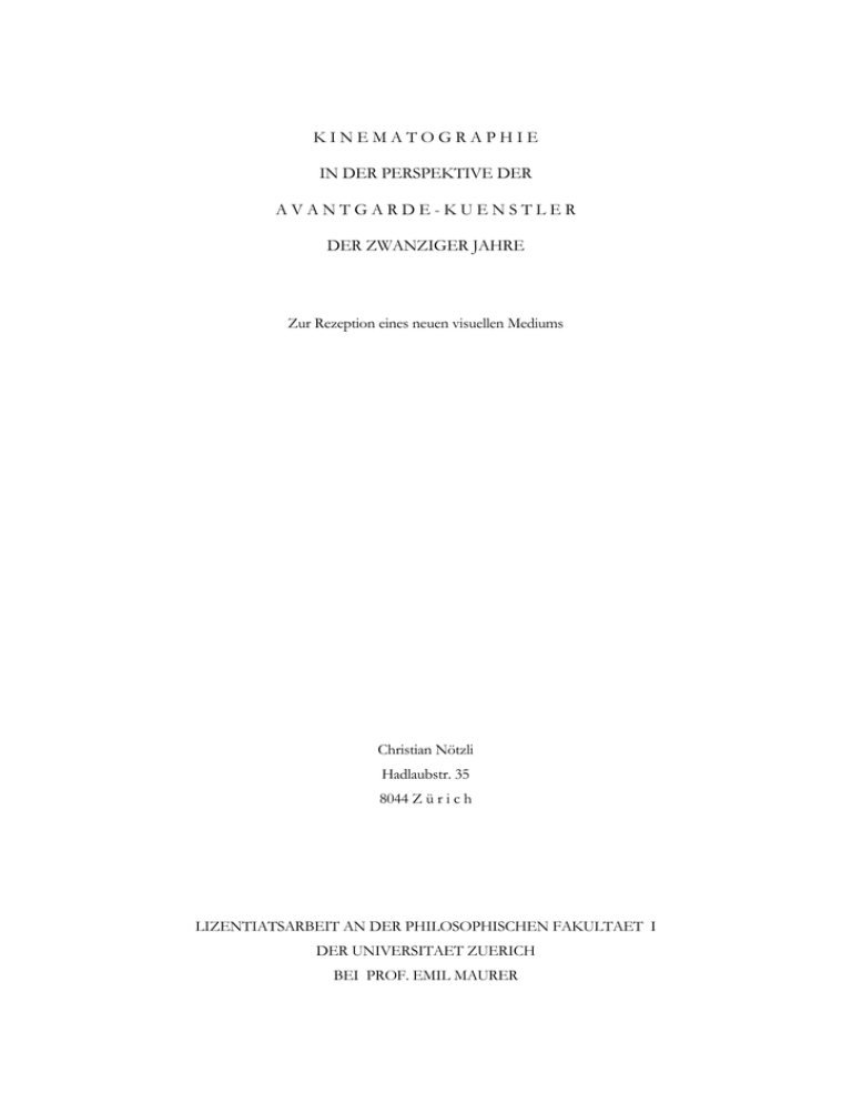 KINEMATOGRAPHIE IN DER PERSPEKTIVE DER AVANTGARDE-KUENSTLER DER ZWANZIGER JAHRE Zur Rezeption eines neuen visuellen Mediums Christian Nötzli Hadlaubstr. 35 8044 Z ü r i c h LIZENTIATSARBEIT AN DER PHILOSOPHISCHEN FAKULTAET I DER UNIVERSITAET ZUERICH BEI PROF. EMIL MAURER ZUSAMMENFASSUNG Zu kaum einer Zeit ist so viel über das Verhältnis von Film und Kunst und über die Möglichkeiten des „Films als Kunst“ reflektiert worden wie in den zwanziger Jahren. Dabei war die Spannweite des Spektrums enorm. Es gibt bis zum heutigen Tag kaum ein Problem, eine Tendenz, eine Möglichkeit, die nicht schon in der frühen Avantgarde-Bewegung erörtert worden wäre: Fragen betreffend Inhalt und Form, Produktion und Reproduktion, narrativen und „absoluten“ Film, Montage, Probleme der Bewegungsdarstellung, Repetitionen, Close up usw. Von der Anwendung der „filmspezifischen“ Gestaltungsmittel über Möglichkeiten der Multi-Projektion bis zum „expanded cinema“ ist nahezu alles antizipiert worden, was spätere Filmemacher ausgeführt haben. Kernpunkt dieser Arbeit ist das Protokoll eines fiktiven Kongesses, an dem sieben Vertreter der damaligen „Avantgarde“—Salvador Dali, Theo van Doesburg, Marcel Duchamp, Fernand Léger, Laszlo Moholy-Nagy, Man Ray und Hans Richter—mit drei Kunsthistorikern—Rudolf Arnheim, André Malraux und Erwin Panofsky—über ihr (damaliges) Filmverständnis diskutieren. Rund 300 Originalzitate sind unter mehreren Diskussions-Topics zusammengefasst und eröffnen auch guten Kennern der Epoche neue Zusammenhänge. Zwei klammernde Theorieblöcke führen einerseits in den Kontext und die zentralen Begriffe Film, Kinematographie, Gestaltung, Bewegung, Mimesis, Produktion und Reproduktion ein und helfen anderseits, die gemachten Aussagen aus einer retrospektiven Sicht zu beurteilen und einzuordnen. ENGLISH ABSTRACT Not likely in any other decade than last century’s „twenties“ there has been so much reflection on the relationship of film and art and on „film as art“. And the scope of topics was enormous. Unto our times there hardly is a problem, a tendency, a possibility, that the early „Avantgarde movement“ would not have had discussed. Questions regarding form & content, production & reproduction, narrative & „absolute“ film, montage, problems in the representation of movement, repetition and so on.. From the „specific“ ways of expression, to all the prospective possibilities ranging from multiscreen projection to the „expanded cinema“ the Avantgarde artists anticipated almost everything that movie makers in later years would experiment with. The core of this paper consists of the record (protocol) of a fictious congress where seven Avantgarde representatives— Salvador Dali, Theo van Doesburg, Marcel Duchamp, Fernand Léger, Laszlo Moholy-Nagy, Man Ray and Hans Richter—and three art historians—Rudolf Arnheim, André Malraux and Erwin Panofsky—dispute on their understanding of film (art). A number of 300 original quotations have been integrated into several discussion topics . This collage might reveal new insights even to the expert of that epoch. Two reflective parts cling to that record, one explaining the context and some of the crucial terms as film, cinematography, „gestaltung”, movement, mimesis, production and reproduction and the concluding part is an assessment of the quotations from a present point of view. The paper is written in German. Kinematographie in der Perspektive der Avangarde-Künstler der zwanziger Jahre (© 1982-2001 Christian Nötzli) Seite ii VORWORT ZUR DIGITALEN AUSGABE 2001 Entstehungsgeschichte „Kinematographie in der Perspektive der Avantgarde-Künstler der zwanziger Jahre“ mit Untertitel „Zur Rezeption eines neues visuellen Mediums“ ist 1981/82 enstanden und im Spätherbst 1982 bei der philosophischen Fakultät I der Universität Zürich als Lizentiatsarbeit eingereicht worden (Kunstgeschichtliches Seminar/Prof. Dr. Emil Maurer). Als ich Mitte der 70er-Jahre mein Studium begann war ich zwar bereits stark am Thema Film interessiert, aber die akademische Landschaft in Zürich war in dieser Hinsicht absolutes Oedland—ein Lehrstuhl für Filmwissenschaft noch eine Utopie in weiter Ferne. Im Rahmen der „neuen Medien“ offerierte das Publizistische Seminar manchmal „Videokurse“, an denen man die Handhabung von tragbaren (oder besser: „transportablen“!) Aufnahmesystemen lernte—schwarz/weiss natürlich, mit Spulenbändern, später Betamax-Kassetten. Am Schluss dieser Kurse sollten die TeilnehmerInnen in der Lage sein, ein Interview, einen kleinen Bericht oder—bevorzugt!—einen kurzen „Agitationsfilm“ zu drehen und mit Hilfe zweier verbundener Systeme „schneiden“ zu können. Dass neben der extensiven Auseinandersetzung auf technischer Ebene Fragen bezüglich der inhaltlichen und formalen Gestaltung da nur noch am Rande Platz fanden, versteht sich von selbst. Einziger Fixpunkt im Leben jeder an Film & Kino interessierten Studentin resp. jedes Studenten waren die filmhistorischen Vorlesungen von Viktor Sidler. Sidlers Vorlesungen, eine Doppelstunde pro Woche, ich glaube Mittwochs oder Donnerstags von 4 bis 6, gehörten vermutlich zu den bestbesuchtesten des ganzen Uni-Lehrbetriebs. Dabei hielt er sie wahrscheinlich im Rahmen eines freien Lehrauftrages—Dr. Sidler war nämlich Mittelschullehrer. Er war von Hause aus Germanist (oder Historiker?), aber seine Lehrveranstaltungen fanden im Rahmen des publizistischen Seminars statt. Das war typisch. Alles was Film oder Kino betraf, musste irgendwo „angehängt“ werden— wo genau war meist mehr oder weniger Zufall. Abhängig von persönlichen Beziehungen, Vorlieben und Interessen der Seminarleiter und der Auslastung von Seminarbudgets. Aber es spielte eigentlich auch keine Rolle. Denn innerhalb der Fakultät durfte man ja an praktisch allen Lehrveranstaltungen teilnehmen. Mit der entsprechenden Begründung konnten einem soga