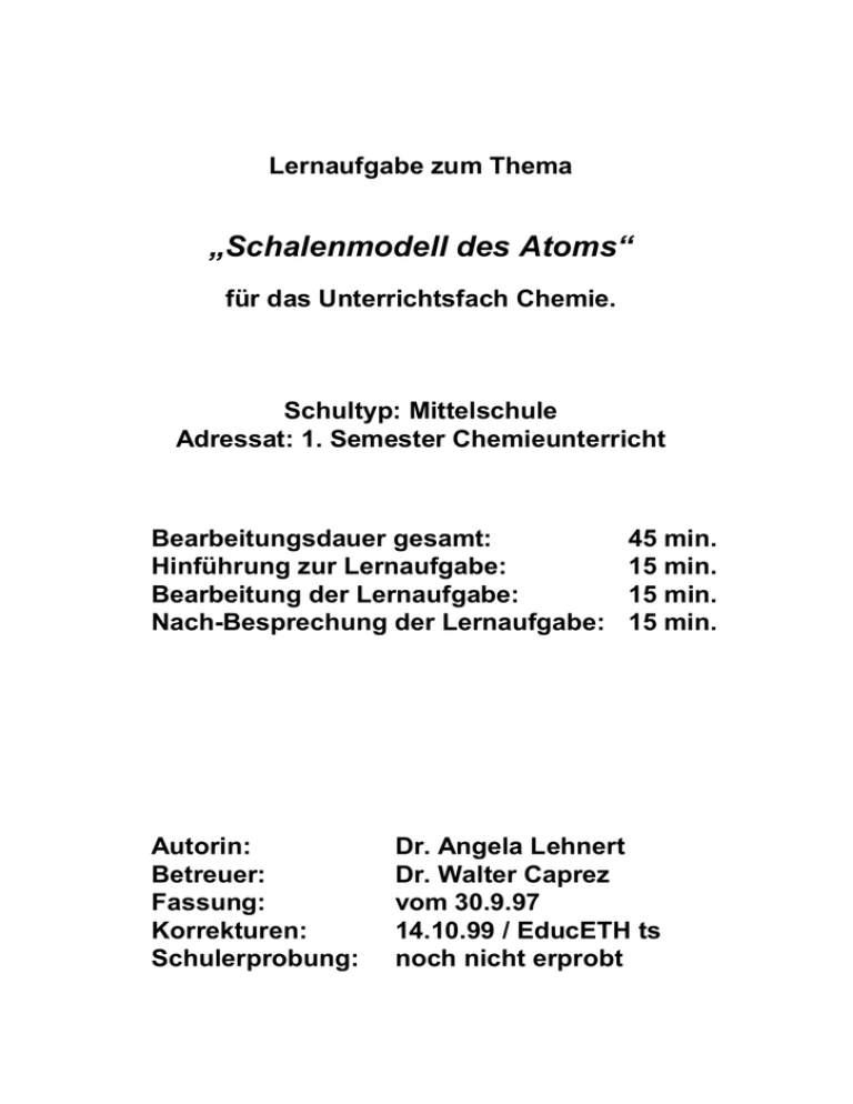 Lernaufgabe zum Thema „Schalenmodell des Atoms“ für das Unterrichtsfach Chemie. Schultyp: Mittelschule Adressat: 1. Semester Chemieunterricht Bearbeitungsdauer gesamt: Hinführung zur Lernaufgabe: Bearbeitung der Lernaufgabe: Nach-Besprechung der Lernaufgabe: Autorin: Betreuer: Fassung: Korrekturen: Schulerprobung: 45 min. 15 min. 15 min. 15 min. Dr. Angela Lehnert Dr. Walter Caprez vom 30.9.97 14.10.99 / EducETH ts noch nicht erprobt Leitidee: Der strukturelle Aufbau von Atomen ist sowohl für die Physik wie auch für chemische Fragestellungen eminent wichtig: Radioaktive Zerfälle sind physikalischer Art und beruhen auf Veränderungen im Atomkern. Chemische Reaktionen dagegen sind durch Veränderungen der Elektronenhülle charakterisiert. Viele Wissenschaftler beschäftigen sich deshalb mit der Entwicklung möglicher Atommodelle. Ziel ist dabei die Erklärung bestimmter Phänomene auf der Ebene der kleinsten Teilchen. Mit einem einzigen Modell können nicht sämtliche Beobachtungen ausreichend gedeutet werden. Man gelangt immer wieder an die Grenzen eines Modells. Durch die Lernaufgabe zum Thema „Schalenmodell des Atoms“ soll den Schülern und Schülerinnen klar werden, dass die Elektronenhülle strukturiert aufgebaut ist, dass mit dem Rutherford’schen Atommodells die unterschiedlichen Ionisierungsenergien nicht erklärt werden können. Dispositionsziele: Die Schülerinnen und Schüler erkennen, wie aus experimentellen Daten (Ionisationsenergien) eine Modellvorstellung entwickelt werden kann. Anhand dieser Lernaufgabe wird ihnen bewusst, dass jedes Modell nur für bestimmte Fragestellungen Gültigkeit besitzt. Sie sehen die Grenzen des Rutherford’schen Atommodells. Operationalisierte Lernziele: Die Schüler und Schülerinnen können den Begriff „Ionisierungsenergie“ definieren. Sie kennen die grundlegenden Annahmen für das Schalenmodell und können den Mitschülern und -schülerinnen dieses Modell erläutern. Vorkenntnisse: Die Schüler und Schülerinnen haben gerade die „erste Tuchfühlung“ mit dem Fach „Chemie“ aufgenommen. Sie haben erste Vorstellungen, wie ein Atom aufgebaut sein könnte. Sie wissen, dass ein Atom aus Protonen, Neutronen und Elektronen aufgebaut ist und kennen das KernHülle-Modell von Rutherford. Sie kennen das Phänomen der elektrostatischen Kräfte und das Coulombgesetz, wenigstens in seiner qualitativen Form. 2 Aufbau der Schulstunde: Die Lernaufgabe soll nach einer 15-minütigen Einführung in die Stunde durchgeführt werden. Sie dauert ca. 15 Minuten. Anschliessend werden ein bis zwei von den Schülern und Schülerinnen entwickelte Modelle vorgestellt. Das Schalenmodell wird als mögliche Lösung der Lernaufgabe eingeführt. Einführung in die Stunde Sie beinhaltet die folgenden Themen: Wiederholung des Rutherford’schen Atommodells: Ein Atom ist nach Rutherford aus einem Atomkern und einer Elektronenhülle aufgebaut. Dabei existieren in der Elektronenhülle genauso viele Elektronen wie Protonen im Kern. Sie werden die Vermutung äussern, dass die Elektronen in der Elektronenhülle nicht einfach „herumschwirren“, sondern dass die Elektronenhülle eine Struktur besitzt. Sie weisen darauf hin, dass es zum Verständnis chemischer Vorgänge wichtig ist, den Aufbau der Elektronenhülle zu kennen. Anschliessend leiten Sie über zur Lernaufgabe. Informationen über den Aufbau der Elektronenhülle erhält man, wenn man die Energien vergleicht, welche zur Abtrennung einzelner Elektronen aus verschiedenen Atomen aufgewendet werden müssen: Führt man einem Atom Energie zu, so können die Elektronen Energie aufnehmen und ihren Abstand vom Kern verändern. Bei genügend grosser Energiezugabe kann man der Elektronenhülle eines Atoms Elektronen entreissen. Dem Atom fehlen dann Elektronen. Es entsteht ein positives Ion. Die zum Entfernen des Elektrons aufzuwendende Energie heisst dann „Ionisierungsenergie“. Man nennt die Energie, die zum Entfernen des ersten Elektrons benötigt wird, 1. Ionisierungsenergie. Wird das zweite Elektron aus der Elektronenhülle abgetrennt, so wird eine Energiemenge, die als 2. Ionisierungsenergie bezeichnet wird, verbraucht. Ebenso lässt sich eine dritte, vierte, fünfte usw. Ionisierungsenergie bestimmen. 3 Durchführung der Lernaufgabe: Die Schüler und Schülerinnen erhalten ein Diagramm, in dem die Ionisierungsenergien eines Schwefelatoms dargestellt sind. Anhand dieses Diagramms sollen Folgerungen über die Anordnung der Elektronen im Atom gezogen werden. Die schnellen Schüler und Schülerinnen überprüfen ihre Modellvorstellung mit Hilfe der Tabelle der ersten 20 Ionisierungsenergien. Die Schüler und Schülerinnen sollen erarbeiten, dass einige Elektronen leichter als die restlichen abgetrennt werden, dass einige Ionisierungsenergien in ihrem Wert vergleichbar sind, andere sprunghaft ansteigen und sie sollen die Schlussfolgerung ziehen, dass sich die Elektronen eines Atoms gruppenweise unterschiedlich weit vom Kern entfernt aufhalten. Das Neue Die Schüler und Schülerinnen sollen anhand dieser Aufgabe nachvollziehen, wie Wissenschaftler Probleme lösen. Sie sollen - als Forscher - ein mögliches Elektronenhüllen-Modell entwerfen. Ihnen soll klar werden, dass die Atomhülle strukturiert aufgebaut ist und dass die Ionisierungsenergien die Struktur der Elektronenhülle widerspiegeln. Sie gelangen zu den Grundzügen des Schalenmodells. 4 Weiterentwicklung des Rutherford’schen Atommodells Lernziel: Sie lernen ein neues Atommodell kennen. Es ist eine Weiterentwicklung des Rutherford’schen Atommodells. Mit diesem Modell können chemische Vorgänge gedeutet werden. Stundenablauf: Einführung: Wiederholung des Rutherford’schen Atommodells. Ionisation von Atomen. Was verstehen wir unter Ionisierungsenergie? Durchführung der Lernaufgabe Vorstellung und Diskussion der Ergebnisse und Klärung offen gebliebener Fragen 5 15 min. 15 min. 15 min. Weiterentwicklung des Rutherford’schen Atommodells Wir haben