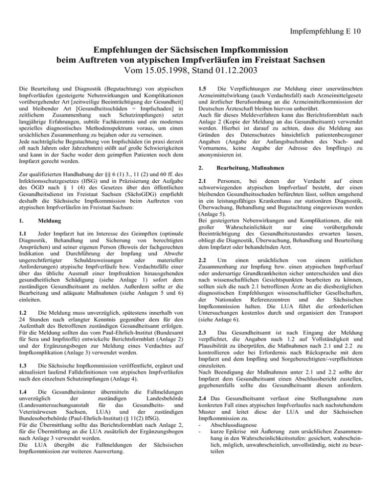 Impfempfehlung E 10 Empfehlungen der Sächsischen Impfkommission beim Auftreten von atypischen Impfverläufen im Freistaat Sachsen Vom 15.05.1998, Stand 01.12.2003 Die Beurteilung und Diagnostik (Begutachtung) von atypischen Impfverläufen (gesteigerte Nebenwirkungen und Komplikationen vorübergehender Art [zeitweilige Beeinträchtigung der Gesundheit] und bleibender Art [Gesundheitsschäden = Impfschaden] in zeitlichem Zusammenhang nach Schutzimpfungen) setzt langjährige Erfahrungen, subtile Fachkenntnis und ein modernes spezielles diagnostisches Methodenspektrum voraus, um einen ursächlichen Zusammenhang zu bejahen oder zu verneinen. Jede nachträgliche Begutachtung von Impfschäden (in praxi derzeit oft nach Jahren oder Jahrzehnten) stößt auf große Schwierigkeiten und kann in der Sache weder dem geimpften Patienten noch dem Impfarzt gerecht werden. 1.5 Die Verpflichtungen zur Meldung einer unerwünschten Arzneimittelwirkung (auch Verdachtsfall) nach Arzneimittelgesetz und ärztlicher Berufsordnung an die Arzneimittelkommission der Deutschen Ärzteschaft bleiben hiervon unberührt. Auch für dieses Meldeverfahren kann das Berichtsformblatt nach Anlage 2 (Kopie der Meldung an das Gesundheitsamt) verwendet werden. Hierbei ist darauf zu achten, dass die Meldung aus Gründen des Datenschutzes hinsichtlich patientenbezogener Angaben (Angabe der Anfangsbuchstaben des Nach- und Vornamens, keine Angabe der Adresse des Impflings) zu anonymisieren ist. 2. Zur qualifizierten Handhabung der §§ 6 (1) 3., 11 (2) und 60 ff. des Infektionsschutzgesetzes (IfSG) und in Präzisierung der Aufgabe des ÖGD nach § 1 (4) des Gesetzes über den öffentlichen Gesundheitsdienst im Freistaat Sachsen (SächsGDG) empfiehlt deshalb die Sächsische Impfkommission beim Auftreten von atypischen Impfverläufen im Freistaat Sachsen: 1. Meldung 1.1 Jeder Impfarzt hat im Interesse des Geimpften (optimale Diagnostik, Behandlung und Sicherung von berechtigten Ansprüchen) und seiner eigenen Person (Beweis der fachgerechten Indikation und Durchführung der Impfung und Abwehr ungerechtfertigter Schuldzuweisungen oder materieller Anforderungen) atypische Impfverläufe bzw. Verdachtsfälle einer über das übliche Ausmaß einer Impfreaktion hinausgehenden gesundheitlichen Schädigung (siehe Anlage 1) sofort dem zuständigen Gesundheitsamt zu melden. Außerdem sollte er die Bearbeitung und adäquate Maßnahmen (siehe Anlagen 5 und 6) einleiten. 1.2 Die Meldung muss unverzüglich, spätestens innerhalb von 24 Stunden nach erlangter Kenntnis gegenüber dem für den Aufenthalt des Betroffenen zuständigen Gesundheitsamt erfolgen. Für die Meldung sollten das vom Paul-Ehrlich-Institut (Bundesamt für Sera und Impfstoffe) entwickelte Berichtsformblatt (Anlage 2) und der Ergänzungsbogen zur Meldung eines Verdachtes auf Impfkomplikation (Anlage 3) verwendet werden. 1.3 Die Sächsische Impfkommission veröffentlicht, ergänzt und aktualisiert laufend Falldefinitionen von atypischen Impfverläufen nach den einzelnen Schutzimpfungen (Anlage 4). 1.4 Die Gesundheitsämter übermitteln die Fallmeldungen unverzüglich der zuständigen Landesbehörde (Landesuntersuchungsanstalt für das Gesundheitsund Veterinärwesen Sachsen, LUA) und der zuständigen Bundesoberbehörde (Paul-Ehrlich-Institut) (§ 11(2) IfSG). Für die Übermittlung sollte das Berichtsformblatt nach Anlage 2, für die Übermittlung an die LUA zusätzlich der Ergänzungsbogen nach Anlage 3 verwendet werden. Die LUA übergibt die Fallmeldungen der Sächsischen Impfkommission zur weiteren Auswertung. Bearbeitung, Maßnahmen 2.1 Personen, bei denen der Verdacht auf einen schwerwiegenden atypischen Impfverlauf besteht, der einen bleibenden Gesundheitsschaden befürchten lässt, sollten umgehend in ein leistungsfähiges Krankenhaus zur stationären Diagnostik, Überwachung, Behandlung und Begutachtung eingewiesen werden (Anlage 5). Bei gesteigerten Nebenwirkungen und Komplikationen, die mit großer Wahrscheinlichkeit nur eine vorübergehende Beeinträchtigung des Gesundheitszustandes erwarten lassen, obliegt die Diagnostik, Überwachung, Behandlung und Beurteilung dem Impfarzt oder behandelnden Arzt. 2.2 Um einen ursächlichen von einem zeitlichen Zusammenhang zur Impfung bzw. einen atypischen Impfverlauf oder andersartige Grundkrankheiten sicher unterscheiden und dies nach wissenschaftlichen Gesichtspunkten bearbeiten zu können, sollten sich die nach 2.1 betroffenen Ärzte an die diesbezüglichen diagnostischen Empfehlungen wissenschaftlicher Gesellschaften, der Nationalen Referenzzentren und der Sächsischen Impfkommission halten. Die LUA führt die erforderlichen Untersuchungen kostenlos durch und organisiert den Transport (siehe Anlage 6). 2.3 Das Gesundheitsamt ist nach Eingang der Meldung verpflichtet, die Angaben nach 1.2 auf Vollständigkeit und Plausibilität zu überprüfen, die Maßnahmen nach 2.1 und 2.2 zu kontrollieren oder bei Erfordernis nach Rücksprache mit dem Impfarzt und dem Impfling und Sorgeberechtigten/-verpflichteten einzuleiten. Nach Beendigung der Maßnahmen unter 2.1 und 2.2 sollte der Impfarzt dem Gesundheitsamt einen Abschlussbericht zustellen, gegebenenfalls sollte das Gesundheitsamt diesen anfordern. 2.4 Das Gesundheitsamt verfasst eine Stellungnahme zum konkreten Fall eines atypischen Impfverlaufes nach nachstehendem Muster und leitet diese der LUA und der Sächsischen Impfkommission zu. Abschlussdiagnose kurze Epikrise mit Äußerung zum ursächlichen Zusammenhang in den Wahrscheinlichkeitsstufen: gesichert, wahrscheinlich, möglich, unwahrscheinlich, unvollständig, nicht zu beurteilen - Fortbildung des Impfarztes in Impffragen in den letzten 3-5 Jahren - Kontraindikationen regelrecht beachtet evtl. Fehler in der Impfdurchführung 2.5 Das Gesundheitsamt berät die betroffenen Personen ausführlich über die Rechtsgrundlagen, insbesondere über die Modalitäten der Antragstellung auf Versorgung gemäß § 60 (1) IfSG bei den Ämtern für F