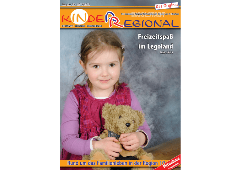 Das Original K IN DE R R EGIONAL Vorwort Nimm die Hand eines deutschen, eines asiatischen, eines dunkelhäutigen und eines behinderten Kindes, lasse sie zusammen im Schlamm mit den Händen spielen, schau diese dann an und sage mir, welche Hand wem gehört... Förderung steht bei der Erziehung eines Kindes manches Mal zu sehr im Vordergrund. Sollen nicht Liebe, Vertrauen, Zuneigung, Sicherheit und Geborgenheit die Wertigkeit aller Dinge sein? Ein Kind das all dies in seiner Kindheit erfährt, wird mit Sicherheit ein vernünftiger und glücklicher Erwachsener, es wird später wissen, was es will im Leben. Das Abitur, eine zweite Fremdsprache, so wie das Spielen eines Instrumentes allein machen nicht glücklich. Ich habe selber drei Kinder und weiss dass, man immer wieder in Versuchung gerät, man sich anzetteln lässt vom Förderwahn, der immer mehr zunimmt. Oft haben Babys schon einen festen Stundenplan... Montag Yoga fürs Baby, Dienstag Babymassage, Mittwoch Babyschwimmen, man könnte die Liste unendlich weiter führen und jedem Alter anpassen. Ist es das, was wir uns für unsere Kinder wünschen? Suchen Sie Alternativen! Wie wäre es einfach mal mit Zeit!!! Zeit haben sich auch meine Experten und Anzeigenpartner genommen, ohne sie könnte ich Ihnen den Familienratgeber K IN DE R R EGIONAL nicht kostenlos zur Verfügung stellen. Hierfür möchte ich mich bei allen Mitwirkenden bedanken. Herzlichst, Ihre Zontar Iris Unser Titelbild zeigt Sophie aus Baar-Ebenhausen K IN DE R R EGIONAL Inhaltsverzeichnis Schwangerschaft + Geburt Finanzen/Recht ab Seite 6 ab Seite 16 • Tipps für die Schwangerschaft • Das Tee-ABC für Schwangere • Webseiten für Familien • Kuren für Schwangere • Errechneter Geburtstermin • Mutterschaftsgeld für Selbstständige Stillen und Ernährung Gesundheit ab Seite 18 ab Seite 22 • Allergieprävention von klein auf • Kinder Regional Kochrezept • Weizenallergie • Keine Angst vor der Notaufnahme • Blitze sehen - Migräne • Babymassage Das besondere Kind Schule/Betreuung/Beratung ab Seite 30 ab Seite 46 • Delphintherapie an der Costa Blanca • Hilfreiche Informationen • Erhöhter Betreuungsbedarf • Flinke Feder • Der richtige Arbeitsplatz • Schuldnerberatung Einkaufen für Eltern + Kind Freizeitspaß ab Seite 52 • Tatort Supermarktkasse • Pädagogisch sinnvoll • Naturfaser fürs Baby ab Seite 56 • Legoland • Freizeit von 0-2 Jahre • Sicher im Internet K IN DE R R EGIONAL Schwangerschaft Schwangerschaft und Geburt EXPERTENTIPP Foto: Sawall Sie erwarten sehnsüchtig die Geburt ihres ersten Kindes? Haben aber viele Fragen und vielleicht auch Ängste? Wir hoffen, dass Sie in unserem Familienratgeber Hilfe und Unterstützung finden, das Sie Informationen erhalten, die Ihnen helfen Ihre neue Lebenssituation leichter zu meistern. Wir haben für Sie in der nachfolgenden Rubrik Gebährmöglichkeiten, eine Reihe von Hebammen und ein Adressenverzeichnis zusammengestellt. Hebamme Frau Kathrin Roshol vom Team der Hebammen Praxis in der Brodmühle Übelkeit und Erbrechen in der Schwangerschaft So können wir vielleicht einen Teil dazu beitragen, dass Sie Ihre Schwangerschaft mit Freude genießen werden. Was sollte zu Hause auf´s Baby warten • Kommt man nach der Geburt nach Hause, sollte auf das Baby inzwischen ein Kinderbettchen oder eine Wiege warten. Man sollte das Baby in einem Schlafsack schlafen lassen und keine Bettdecke benutzen. So ist es warm verpackt und kann keinen Hitzestau erleiden. Weiter sollte das Bett oder die Wiege eine relativ feste Matratze haben, es sollte nicht mit einem Nestchen ausgestattet sein und auch keinen Himmel haben. Diese können dazu führen, dass das Kind weniger Luft bekommt. Es ist zwar für den Laien schwer zu verstehen, aber so lauten die neusten Erkenntnisse. Auf Stofftiere im Bettchen sollte man komplett verzichten. Desweiteren sollte man dafür sorgen, dass das Kinderbettchen nicht wärmer als 18 Grad steht und am besten im Elternschlafzimmer integriert wird. Es ist beruhigend, das Kind gerade in den ersten Monaten bei sich mit am Bett zu haben. Man reagiert eher und problemloser und schläft so auch besser. • Eine Wickelmöglichkeit sollte geschaffen worden sein. Wickeltisch, Wickelaufsatz 6 für die Wanne oder eine von vielen weiteren Alternativen. • Windeln in der kleinsten Größe, Feuchttücher, Fieberthermometer, Badethermometer und Wundschutzcreme sollten vorhanden sein. • Eine Babybadewanne mit einem stabilen Gestell einzeln oder auf der Badewanne, am besten mit einer rutschfesten Unterlage im Badezimmer ist Pflicht. • Ein Heizstrahler ist für die ersten Monate besonders gut geeignet. Schnell kann damit für die passende Temperatur im Bad gesorgt werden. • Babykleidung in den ersten zwei Größen, etwa fünf bis sieben Strampler, dann jeweils ein dazu passendes Jäckchen oder Pulloverchen und ebenso viele Schlafanzüge sollten bereits gewaschen im Schrank liegen. Als Unterwäsche empfehlen sich anfangs Wickelbodys. Das vermeidet Kleidung in den ersten Wochen über den Kopf ziehen zu müssen. Zwei bis drei Jacken mit Mütze sind völlig ausreichend. • Da Babys im Schlafsack schlafen, genügen Bettlaken für Wiege oder Kinderbett. Hierfür sollte man ca. 3 Stück im Schrank haben. Dazu eine wasserdichte Unterlage, falls die Kleinen mal auslaufen. • Handtücher hat man im Grunde meist eh genug. Aber wenn man will, kann man ja noch einige kindgerechte Handtücher mit Kapuze anschaffen. Weiter benötigt man für das Baby unbedingt Waschlappen. Optimal sind Einmalwaschlappen für die ersten Wochen. • Um mit dem Kind nach draußen zu können, sollte der Kinderwagen schon auf den neuen Erdenbürger warten. Dieser sollte leicht zusammenklappbar sein und im Gesamtgewicht nicht zu schwer sein, da man ihn sehr oft auch ins Auto heben muss. Gedanken sollte man sich über die Reifen machen. Eine Beratung im Fachhandel ist empfehlenswert. Für Winterkinder hilft ein Lammfellsack die K