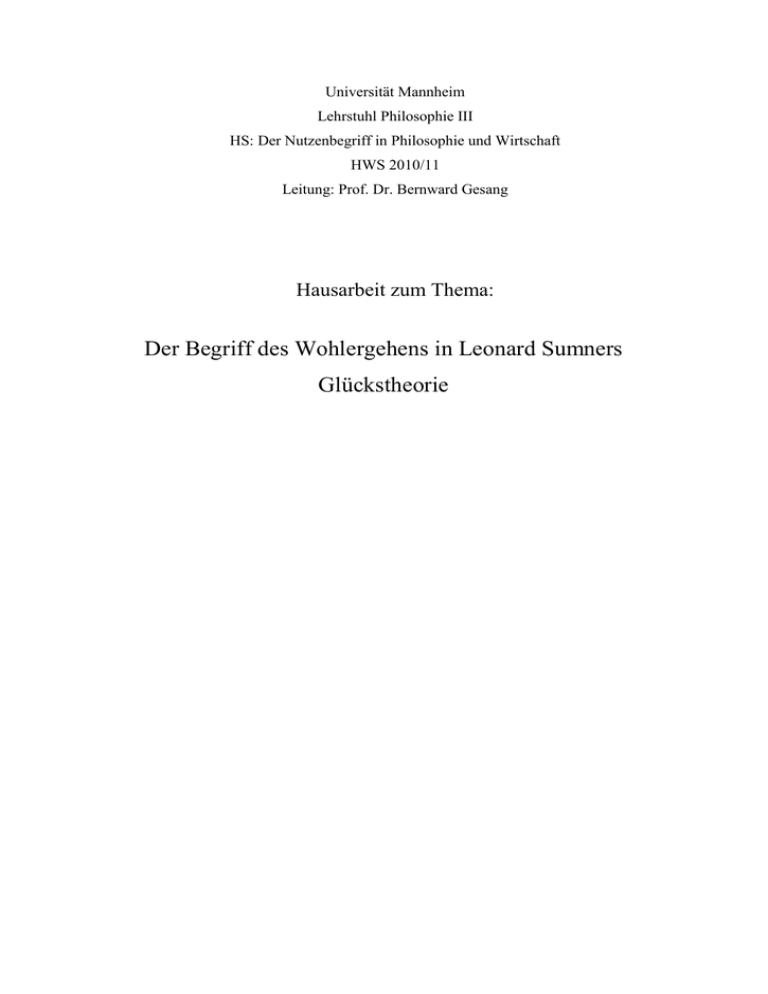 Universität Mannheim Lehrstuhl Philosophie III HS: Der Nutzenbegriff in Philosophie und Wirtschaft HWS 2010/11 Leitung: Prof. Dr. Bernward Gesang Hausarbeit zum Thema: Der Begriff des Wohlergehens in Leonard Sumners Glückstheorie Inhaltsverzeichnis Einleitung ............................................................................................................ 1 Hauptteil Befriedigungstheorie und Wunschtheorie ................................................... 1 Sumners Glückstheorie ............................................................................... 2 Freude und Schmerz.......................................................................... 3 Die vier Dimensionen des Glücks..................................................... 5 Wachstumsethik und Social Indicators Movement........................... 8 Authentizität .................................................................................... 10 Fazit .................................................................................................................... 14 Literaturverzeichnis ........................................................................................ 17 2 Einleitung In seinem Buch Welfare, Happiness and Ethics (1999) nimmt Leonard Sumner sowohl auf subjektive, als auch auf objektive welfaristische Theorien Bezug, verwirft sie und stellt ihnen seine eigene Theorie gegenüber, die zwischen subjektiven und objektiven Ansätzen vermittelt. Die Bezeichnung Welfarismus umfasst alle ethischen Theorien, die einen Wertemonismus postulieren, also davon ausgehen, dass das Wohlergehen der einzige Wert ist, nachdem sich das menschliche Handeln ausrichtet. So hält auch Sumner das Wohlergehen für den einzigen ethischen Wert und verknüpft diesen eng mit Glück und Lebenszufriedenheit. Wie er diese beiden Begriffe genau definiert und zu dem des Wohlergehens in Beziehung setzt, soll im Folgenden erörtert und kritisch reflektiert werden. Hierbei liegt der Schwerpunkt der Analyse auf dem sechsten Kapitel von Welfare, Happiness and Ethics, in welchem Sumner ausgehend vom klassischen Hedonismus seine Glückstheorie entwickelt. Vorab soll zum besseren Verständnis die Befriedigungstheorie, zu der auch der Hedonismus zählt, und die Wunschtheorie, auf die Sumner ebenfalls Bezug nimmt, kurz dargestellt werden. Hauptteil Befriedigungstheorie und Wunschtheorie Die Befriedigungstheorie, oder auch mental state account, ist eine hedonistische Theorie, da sie Wohlergehen als die Vermehrung von subjektiv empfundenen Befriedigungsgefühlen definiert. Je mehr positive Gefühle beziehungsweise Lust mir also eine Tätigkeit verschafft, desto mehr genieße ich sie und umso mehr steigert sie mein Wohlbefinden. Die Gefühlstheorie und die Theorie der positiven Einstellungen sind zwei Varianten der Befriedigungstheorie. Die erste versteht Lust als ein einheitliches Gefühl, dass sich einstellt, wenn eine Tätigkeit oder Situation als lustvoll empfunden wird, wohingegen die zweite Variante unsere Reaktion auf das Lustgefühl für entscheidend hält. Demnach wünschen wir lustvolle Dinge, weil wir eine positive Einstellung gegenüber ihnen entwickelt haben, sie also als befriedigend empfinden und genießen. Nicht der Gefühlston ist also gleich, sondern unsere Reaktion auf Lustgefühle, die zu einer positiven Einstellung ihnen gegenüber führt. Daher hat 3 das Wohlbefinden in der Theorie der positiven Einstellungen auch eine kognitive Komponente. Wie an späterer Stelle noch näher ausgeführt wird, vertritt auch Sumner die These, dass wir zwischen intrinsischen Qualitäten der Gefühle und unseren Einstellungen ihnen gegenüber unterscheiden können. (vgl. Gesang, S. 2-3) Die Wunschtheorie, auch informed desire account genannt, behauptet, dass das Glück beziehungsweise das Wohlergehen1 vermehrt wird, wenn die aufgeklärten Wünsche der Individuen erfüllt werden. Dieser Theorie zufolge ist es nur entscheidend, dass die gewünschten Weltzustände hergestellt werden, unabhängig davon, ob die Individuen die Erfüllung erfahren oder nicht. Ein Standardbeispiel hierfür sind Wünsche für postmortale Ereignisse. Wenn ein Mensch zu seinen Lebzeiten den Wunsch geäußert hat, dass Blumen auf seinem Grab stehen sollen, dann wird der Wunschtheorie zufolge sein Glück dadurch gesteigert, dass seine Angehörigen ihm nach seinem Tod diesen Wunsch erfüllen. Das Glück liegt demnach also nicht in positiven mentalen Zuständen, sondern in der Herstellung von Weltzuständen. (vgl. Gesang, S. 3) Sumners Glückstheorie Welfare, also das Wohlbefinden, ist nach Sumner zweifellos subjektiv, aber die beiden historisch dominanten subjektiven Ansätze, der Hedonismus und die Wunschtheorie, sind seiner Meinung nach inadäquat. Der Hedonismus biete keine Referenz zur Welt außerhalb des mentalen Zustands des Subjekts und in der Wunschtheorie fehle die Verbindung dazu, wie das Subjekt selbst die eigenen Lebensumstände erfährt. Beispiele? Dennoch hält er den Hedonismus für einen vielversprechenden Ausgangspunkt, von dem aus er seine eigenen Theorie entwickeln möchte. Nach Sumner beinhaltet der Hedonismus drei Thesen: 1) Wohlbefinden (welfare) = Glück (happiness) 2) Glück (happiness) = Freude/ Lust (pleasure)/ ≠ Schmerz (pain)2 3) Freude und Schmerz sind Gefühle und somit rein mentaler Natur (vgl. Sumner, S. 138) Da die dritte These laut Sumner unstrittig ist, gilt es, im Folgenden die ersten beiden Thesen zu prüfen. Ausgehend vom Hedonismus soll eine bessere Theorie über die Natur des Glücks entwickelt werden, die das Glück eng mit dem Wohlergehen jetzt gibt es Wohlbefinden und 1 2 Die Begriffe Lust, Glück und Wohlergehen werden häufig synonym verwendet. Im Folgenden werden die Begriffe Freude/Lust/pleasure und die Begriffe Schmerz/pain synonym verwendet. 4 Wohlergehen, das verwirrt verbindet. Er betont, dass er dabei Wohlergehen nicht mit Glück gleichsetzt, (also greift er These 1 an) sondern dass zusätzlich die subjekt