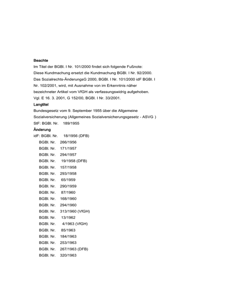 Beachte Im Titel der BGBl. I Nr. 101/2000 findet sich folgende Fußnote: Diese Kundmachung ersetzt die Kundmachung BGBl. I Nr. 92/2000. Das Sozialrechts-ÄnderungsG 2000, BGBl. I Nr. 101/2000 idF BGBl. I Nr. 102/2001, wird, mit Ausnahme von im Erkenntnis näher bezeichneter Artikel vom VfGH als verfassungswidrig aufgehoben. Vgl. E 16. 3. 2001, G 152/00, BGBl. I Nr. 33/2001. Langtitel Bundesgesetz vom 9. September 1955 über die Allgemeine Sozialversicherung (Allgemeines Sozialversicherungsgesetz - ASVG ) StF: BGBl. Nr. 189/1955 Änderung idF: BGBl. Nr. 18/1956 (DFB) BGBl. Nr. 266/1956 BGBl. Nr. 171/1957 BGBl. Nr. 294/1957 BGBl. Nr. 19/1958 (DFB) BGBl. Nr. 157/1958 BGBl. Nr. 293/1958 BGBl. Nr. 65/1959 BGBl. Nr. 290/1959 BGBl. Nr. 87/1960 BGBl. Nr. 168/1960 BGBl. Nr. 294/1960 BGBl. Nr. 313/1960 (VfGH) BGBl. Nr. 13/1962 BGBl. Nr. 4/1963 (VfGH) BGBl. Nr. 85/1963 BGBl. Nr. 184/1963 BGBl. Nr. 253/1963 BGBl. Nr. 267/1963 (DFB) BGBl. Nr. 320/1963 BGBl. Nr. 301/1964 BGBl. Nr. 81/1965 BGBl. Nr. 96/1965 BGBl. Nr. 108/1965 (VfGH) BGBl. Nr. 121/1965 (DFB) BGBl. Nr. 220/1965 BGBl. Nr. 260/1965 (VfGH) BGBl. Nr. 309/1965 BGBl. Nr. 134/1966 (VfGH) BGBl. Nr. 168/1966 BGBl. Nr. 5/1967 BGBl. Nr. 28/1967 (VfGH) BGBl. Nr. 67/1967 BGBl. Nr. 201/1967 BGBl. Nr. 256/1967 BGBl. Nr. 6/1968 BGBl. Nr. 168/1968 (DFB) BGBl. Nr. 282/1968 BGBl. Nr. 303/1968 BGBl. Nr. 313/1968 (VfGH) BGBl. Nr. 17/1969 BGBl. Nr. 353/1969 (VfGH) BGBl. Nr. 446/1969 BGBl. Nr. 385/1970 BGBl. Nr. 120/1971 (VfGH) BGBl. Nr. 373/1971 BGBl. Nr. 473/1971 BGBl. Nr. 162/1972 BGBl. Nr. 31/1973 BGBl. Nr. 23/1974 BGBl. Nr. 178/1974 BGBl. Nr. 399/1974 BGBl. Nr. 775/1974 BGBl. Nr. 303/1975 BGBl. Nr. 381/1975 (DFB) BGBl. Nr. 139/1976 (VfGH) BGBl. Nr. 704/1976 BGBl. Nr. 648/1977 BGBl. Nr. 188/1978 (VfGH) BGBl. Nr. 280/1978 BGBl. Nr. 342/1978 BGBl. Nr. 458/1978 BGBl. Nr. 598/1978 (VfGH) BGBl. Nr. 663/1978 (VfGH) BGBl. Nr. 684/1978 BGBl. Nr. 530/1979 BGBl. Nr. 196/1980 BGBl. Nr. 336/1980 (VfGH) BGBl. Nr. 585/1980 BGBl. Nr. 282/1981 BGBl. Nr. 588/1981 BGBl. Nr. 544/1982 BGBl. Nr. 647/1982 BGBl. Nr. 121/1983 BGBl. Nr. 135/1983 BGBl. Nr. 384/1983 BGBl. Nr. 590/1983 BGBl. Nr. 656/1983 BGBl. Nr. 438/1984 (VfGH) BGBl. Nr. 484/1984 BGBl. Nr. 55/1985 BGBl. Nr. 93/1985 BGBl. Nr. 104/1985 BGBl. Nr. 205/1985 BGBl. Nr. 217/1985 BGBl. Nr. 502/1985 (VfGH) BGBl. Nr. 71/1986 BGBl. Nr. 111/1986 BGBl. Nr. 253/1986 (VfGH) BGBl. Nr. 275/1986 (VfGH) BGBl. Nr. 388/1986 BGBl. Nr. 564/1986 BGBl. Nr. 158/1987 BGBl. Nr. 314/1987 BGBl. Nr. 605/1987 BGBl. Nr. 609/1987 BGBl. Nr. 616/1987 BGBl. Nr. 196/1988 BGBl. Nr. 283/1988 BGBl. Nr. 526/1988 (VfGH) BGBl. Nr. 749/1988 BGBl. Nr. 218/1989 (VfGH) BGBl. Nr. 282/1989 (DFB) BGBl. Nr. 364/1989 BGBl. Nr. 465/1989 (VfGH) BGBl. Nr. 642/1989 BGBl. Nr. 651/1989 BGBl. Nr. 660/1989 BGBl. Nr. 282/1990 (NR: GP XVII IA 366/A AB 1318 S. 143. BR: AB 3864 S. 530.) BGBl. Nr. 294/1990 (NR: GP XVII RV 1277 AB 1320 S. 143. BR: AB 3866 S. 530.) BGBl. Nr. 408/1990 (NR: GP XVII IA 428/A AB 1410 S. 148. BR: 3922 AB 3926 S. 532.) BGBl. Nr. 741/1990 (NR: GP XVIII IA 1/A AB 3 S. 3. BR: AB 3998 S. 534.) BGBl. Nr. 15/1991 (VfGH) BGBl. Nr. 24/1991 (NR: GP XVIII RV 16 AB 30 S. 7. BR: AB 4013 S. 535.) BGBl. Nr. 32/1991 (VfGH) BGBl. Nr. 70/1991 (NR: GP XVIII IA 63/A AB 55 S. 13. BR: AB 4021 S. 537.) BGBl. Nr. 157/1991 (NR: GP XVIII IA 99/A AB 85 S. 19. BR: AB 4028 S. 539.) BGBl. Nr. 243/1991 (VfGH) BGBl. Nr. 627/1991 (NR: GP XVIII IA 225/A AB 251 S. 44. BR: AB 4128 S. 546.) BGBl. Nr. 628/1991 (NR: GP XVIII RV 181 AB 261 S. 44. BR: AB 4130 S. 546.) BGBl. Nr. 676/1991 (NR: GP XVIII RV 284 AB 311 S. 47. BR: 4139 AB 4156 S. 547.) BGBl. Nr. 681/1991 (NR: GP XVIII IA 243/A AB 319 S. 47. BR: 4144 AB 4164 S. 547.) BGBl. Nr. 702/1991 (NR: GP XVIII RV 332 AB 346 S. 53. BR: AB 4187 S. 548.) BGBl. Nr. 474/1992 (NR: GP XVIII IA 362/A AB 631 S. 78. BR: 4337 AB 4328 S. 557.) BGBl. Nr. 833/1992 (NR: GP XVIII RV 735 AB 838 S. 90. BR: 4382 AB 4385 S. 562.) BGBl. Nr. 17/1993 (NR: GP XVIII IA 436/A AB 909 S. 99. BR: AB 4422 S. 563.) BGBl. Nr. 59/1993 (VfGH) BGBl. Nr. 110/1993 (NR: GP XVIII RV 776 AB 908 S. 100. BR: AB 4442 S. 564.) BGBl. Nr. 278/1993 (VfGH) BGBl. Nr. 335/1993 (NR: GP XVIII RV 932 AB 968 S. 114. BR: 4520 AB 4522 S. 569.) (EWR/Anh. XVIII: 379L0007) BGBl. Nr. 502/1993 (NR: GP XVIII RV 1194 AB 1222 S. 130. BR: AB 4617 S. 573.) BGBl. Nr. 917/1993 (K über Idat) BGBl. Nr. 20/1994 (NR: GP XVIII RV 1375 AB 1400 S. 144. BR: AB 4684 S. 578.) BGBl. Nr. 314/1994 (NR: GP XVIII RV 1469 AB 1556 S. 161. BR: AB 4777 S. 583.) BGBl. Nr. 450/1994 (NR: GP XVIII RV 1590 AB 1671 S. 166. BR: AB 4794 S. 587.) (EWR/Anh. XVIII: 378L0610, 380L1107, 388L0642, 391L0322, 382L0605, 383L0477, 391L0382, 386L0188, 388L0364, 389L0391, 389L0654, 389L0655, 389L0656, 390L0269, 390L0270, 390L0394, 390L0679, 391L0383, 392L0057, 392L0058 und 392L0104) BGBl. Nr. 505/1994 (NR: GP XVIII RV 1334 AB 1608 S. 168. BR: AB 4818 S. 588.) BGBl. Nr. 665/1994 (NR: GP XVIII RV 1656 AB 1798 S. 171. BR: AB 4894 S. 589.) BGBl. Nr. 680/1994 (NR: GP XVIII RV 1624 AB 1826 S. 172. BR: AB 4863 S. 589.) BGBl. Nr. 43/1995 (NR: GP XIX RV 45 AB 62 S. 11. BR: 4958 und 4959 AB 4945 S. 593.) BGBl. Nr. 132/1995 (NR: GP XIX IA 126/A AB 82 S. 16. BR: AB 4967 S. 595.) BGBl. Nr. 297/1995 (NR: GP XIX RV 134 AB 149 S. 32. BR: 4996, 4997, 4998 AB 5002 S. 598.) BGBl. Nr. 475/1995 (NR: GP XIX RV 224 AB 257 S. 41. BR: AB 5037 S. 602.) BGBl. Nr. 832/1995 (NR: GP XIX IA 409/A AB 381 S. 57. BR: AB 5117 S. 606.) BGBl. Nr. 853/1995 (NR: GP XIX IA 407/A AB 389 S. 57. BR: AB 5121 S. 606.) BGBl. Nr. 895/1995 (NR: GP XIX IA 437/A AB 382 S. 57. BR: 5109 AB 5118 S. 606.) BGBl. Nr. 153/1996 (NR: GP XX IA 124/A AB 64 S. 10. BR: 5144 AB 5148 S. 611.) BGBl. Nr. 201/1996 (NR: GP XX RV 72 und Zu 72 AB 95 S. 16. BR: 5161, 5162, 5163, 5164 und 5165 AB 5166 S. 612.) BGBl. Nr. 411/1996 (NR: GP XX RV 214 AB 286 S. 35. BR: 5214 AB 5226 S. 616.) BGBl. Nr. 417/1996 (NR: GP XX IA 242/A AB 301 S. 35. BR: AB 5233 S. 616.) BGBl. Nr. 600/1996 (NR: GP XX IA 289/A AB 325 S. 40. BR: 5273 A