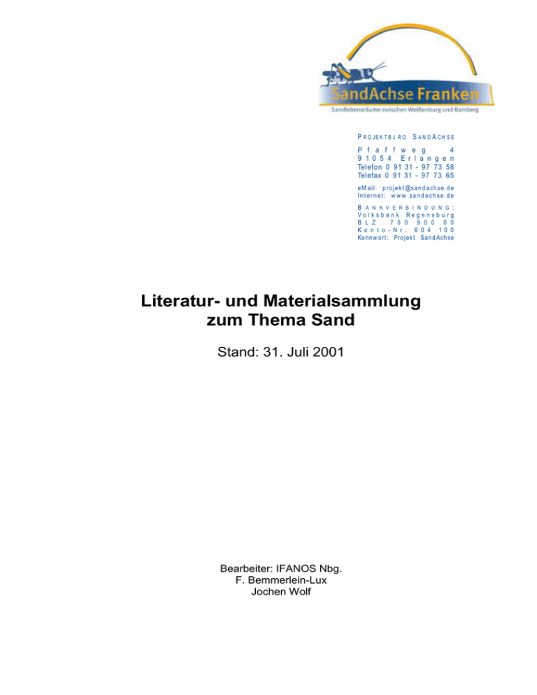 P R O JE K T B ü R O S A N D A C H S E P f a f f w e g 4 9 10 5 4 E r l a n g e n Telefon 0 91 31 - 97 73 58 Telefax 0 9 1 31 - 97 73 65 e M a i l : p r o j e k t @s an d ac h s e .d e In t e r n e t : w w w .s a n d a c h s e . d e B A N K V E R B I N D U N G : Vo l k s b a n k Re g e n s b u rg B L Z 7 5 0 9 0 0 0 0 Ko n t o - N r . 6 0 4 10 0 Ke nn w o rt : Pro j ek t San d Ach se Literatur- und Materialsammlung zum Thema Sand Stand: 31. Juli 2001 Bearbeiter: IFANOS Nbg. F. Bemmerlein-Lux Jochen Wolf Inhalt: Allgemein geologisch ............................................................................................................ 3 Regional ..................................................................................................................................3 International .............................................................................................................................4 Andere Regionen .....................................................................................................................4 Allgemein ökologisch ............................................................................................................. 6 Regional ..................................................................................................................................6 International .............................................................................................................................6 Andere Regionen ................................................................................................................... 10 Beschreibungen ...................................................................................................................12 Regional ................................................................................................................................ 12 International ........................................................................................................................... 18 Andere Regionen ................................................................................................................... 19 Datensammlungen ...............................................................................................................32 Regional ................................................................................................................................ 32 International ........................................................................................................................... 34 Andere Regionen ................................................................................................................... 35 Pflege, Konzepte ..................................................................................................................37 Regional ................................................................................................................................ 37 International ........................................................................................................................... 42 Andere Regionen ................................................................................................................... 43 Literatur- und Materialliste zum Thema Sand 2 Allgemein geologisch Regional BAYERISCHES STAATSMINISTERIUM F. LANDESENTWICKLUNG UND UMWELTFRAGEN (HRSG.) (1979): Ordnung und Sicherung des großflächigen Kies- und Sandabbaus.Zeitschriftenartikel, Seite(n): 80 DÜMMER, M. (1983): Niedrig- und höhermineralisierte Wässer des Benker Sandsteins im Raum NürnbergFürth. Zeitschrift der Deutschen Geologischen Gesellschaft Band: 134, Seite(n): 943-974 EMMERT, U. (1982): Beschreibung der Bohrung Bindlach 1980 (Mittlerer Buntsandstein bis Zechstein) sowie der tektonischen und paläogeographischen Ergebnisse.Geologica Bavarica Band: 83, Seite(n): 195-208 FRINGS, U. (1982): Sedimentologische Untersuchungen im oberen Blasensandstein in Nürnberg. Geologische Blätter für Nordost-Bayern und angrenzende Gebiete Band: 32, Seite(n): 13-34 HABBE, K. (1980): Die äolischen Sandablagerungen vor dem Albtrauf in Franken und ihre Bedeutung für die Rekonstruktion der jungpleistozänen Klimaentwicklung. Konferenzbeitrag, In: 42. Deutscher Geographentag Göttingen, Seite(n): 276-278 HABBE, K. (1997): Die äolischen Sandablagerungen vor dem Stufenhang der Nördlichen Frankenalb Probleme, Beobachtungen, Schlußfolgerungen. Erlanger Geogr. Arbeiten Band: 59, Seite(n): 73ff HÖRAUF, H. (1980): Grundwasserversalzung und Grundwassertemperatur im Sandsteinkeuper bei Hersbruck (Lkr.Nürnberger Land). Zeitschriftenartikel, Geologische Blätter für Nordost-Bayern und angrenzende Gebiete Band: 30, Seite(n): 1-19 KÖRSCHENS, M. (1996): Möglichkeiten und Grenzen einer Humusanreicherung von Sandböden. Zeitschriftenartikel, Mitteilungen der Deutschen Bodenkundlichen Gesellschaft Band: 79, Seite(n): 231-234 LORENZ, J. (1980): Rohstoffsicherung als integrierter Bestandteil der Regionalplanung. Dargestellt am Beispiel des Sand- und Kiesabbaus in der Region München. Zeitschriftenartikel, Raumforschung und Raumordnung Band: 38, Seite(n): 157-163 MADER, D. (1985): Entstehung des germanischen Buntsandsteins.Zeitschriftenartikel, Carolinea Band: 43, Seite(n): 5-60 MIHL,F., HABBE, K.A.., WIMMER, F. (1981): Über zwei 14C-Daten aus fränkischen Dünensanden. Zeitschriftenartikel, Geologische Blätter für Nordost-Bayern und angrenzende Gebiete Band: 31, Seite(n): 208-221 PÖSL, C. (1981): Zur Morphologie und Sedimentologie der Sanddecken am Ostrand des Nördlinger Rieses. Zulassungsarbeit. SACHTELEBEN, J. (1989): Abbaustellen im Landkreis Forchheim, Teil 1:Sandgruben. Gutachten, Seite(n): 93ff Literatur- und Materialliste zum Thema Sand 3 SPÖCKER, R. G. (1964): Die geologischen und hydrologischen Verhältnisse im Untergrund von Nürnberg. Zeitschriftenartikel, Abhandlungen der Naturhistorischen Gesellschaft Nürnberg Band: XXXII