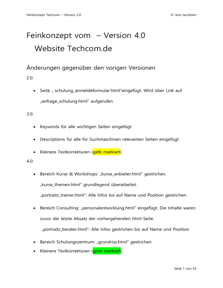 Feinkonzept Techcom – Version 2.0 © Jens Jacobsen Feinkonzept vom – Version 4.0 Website Techcom.de Änderungen gegenüber den vorigen Versionen 2.0: Seite „ schulung_anmeldeformular.html“eingefügt. Wird über Link auf „anfrage_schulung.html“ aufgerufen 3.0: Keywords für alle wichtigen Seiten eingefügt Descriptions für alle für Suchmaschinen relevanten Seiten eingefügt Kleinere Textkorrekturen (gelb markiert) 4.0: Bereich Kurse & Workshops: „kurse_anbieter.html“ gestrichen. „kurse_themen.html“ grundlegend überarbeitet. „portraits_trainer.html“: Alle Infos bis auf Name und Position gestrichen. Bereich Consulting: „personalentwicklung.html“ eingefügt. Die Inhalte waren zuvor der letzte Absatz der vorhergehenden html-Seite. „portraits_berater.html“: Alle Infos gestrichen bis auf Name und Position Bereich Schulungszentrum: „grundriss.html“ gestrichen Kleinere Textkorrekturen (grün markiert) Seite 1 von 55 Feinkonzept Techcom – Version 2.0 © Jens Jacobsen Einleitung Das vorliegende Feinkonzept enthält alle Inhalte der zukünftigen Site Techcom.de. Zunächst ist die Informations-Architektur der Site beschrieben, es folgen die Inhalte aller Seiten, Bilder und Funktionen, welche die Site enthalten soll. Ziele und Zielgruppe der Site können dem Grobkonzept entnommen werden, das geplante Design dem Designkonzept. Informations-Architektur (Im Anhang findet sich eine Sitemap, auf der alle Seiten eingezeichnet sind.) Die Site gliedert sich in die folgenden Bereiche: Schulungen Consulting E-Learning Schulungszentrum Firmenprofil Stellenangebote Diese erscheinen in der senkrechten Navigationsleiste links. Hinzu kommen die übergeordneten Bereiche auf der waagrechten Navigationsleiste: Sitemap Kontakt English Version Mit dieser Aufteilung wird den Bedürfnissen der Benutzer der Site entsprochen. Den Benutzern wird schon mit einem Blick auf die Startseite klar, wo sie Seite 2 von 55 Feinkonzept Techcom – Version 2.0 © Jens Jacobsen Antworten auf die Fragen finden, mit denen sie auf die Site kommen. (Siehe dazu auch die Nutzerszenarien, die zusammen mit dem Grobkonzept erstellt wurden.) Die Aufteilung und die Namen der Bereiche wurden in einem informellem Usability-Test überprüft und daraufhin angepasst. (Der ausführliche Bericht kann auf Wunsch gerne zur Verfügung gestellt werden.) Dabei hat sich beispielsweise gezeigt, dass der Punkt „Raumvermietung“ auf der ersten Ebene nicht günstig ist. Denn dadurch entstand der Eindruck, dass die Kurse keinen festen Veranstaltungsort haben bzw. der Raum zusätzlich angemietet werden muss. Deshalb ist dieser Punkt unter „Schulungszentrum“ eingeordnet. Auf der Startseite im Textbereich wird auf die Raumvermietung hingewiesen, damit die Benutzer auch diese Möglichkeit sofort sehen. Das hat den weiteren Vorteil, dass dieser Punkt sehr leicht wieder entfernt werden kann, falls die Raumauslastung durch eigene Kurse so stark wird, dass die Räume nicht mehr vermietet werden. In dem Test hat sich ferner gezeigt, dass der Begriff „Schulung“ dem allgemeineren „Training“ vorzuziehen ist. Denn unter „Training“ kann man auch ein Coaching oder ähnliches verstehen, wohingegen „Schulungen“ eindeutig ist. Ebenso wurde deutlich, dass „Consulting“ besser ist als „Beratung“. Denn steht „Beratung“ in einer Reihe mit „Schulung“ besteht die Gefahr, dass die Benutzer hier eine Beratung erwarten, welche Kurse für sie geeignet sind. Die Reihenfolge der Bereiche wurde so gewählt, dass die Dienstleistungen von Techcom an erster Stelle stehen. Consulting folgt gleich auf Schulungen, da das Seite 3 von 55 Feinkonzept Techcom – Version 2.0 © Jens Jacobsen die beiden Hauptgeschäftsbereiche sind. Auf den Seiten mit Informationen zu den Schulungen wird auf die Informationen zum Schulungszentrum verlinkt. Eine Anmerkung zu den Texten Die Texte sind so kurz wie möglich gehalten. Tests haben gezeigt, dass die Benutzer längere Texte im Internet so gut wie überhaupt nicht lesen, sondern bestenfalls überfliegen. 75 Prozent der „gelesenen“ Seiten werden nicht gescrollt. Das heißt, die Information, die nicht ohne Scrollen auf einem üblichen Monitor sichtbar ist, hat gar keine Chance, von den meisten Benutzern wahrgenommen zu werden. Doch die Rate des gelesenen Textes lässt sich verbessern durch: starke Gliederung mit Überschriften, Absätzen, Listen kurze, leicht verständliche Sätze mit möglichst wenigen Fremdworten keine Wiederholung von Dingen, die der Benutzer selbst weiß. Vertrauen lässt sich im Internet durch knappe, für den Benutzer wirklich relevante Information herstellen, nicht durch Darstellung des eigenen Wissens. Nach diesen Prinzipien sind die Texte erstellt. Falls Sie noch Dinge finden, die sich streichen lassen, tun Sie dies bitte sofort. Falls Sie meinen, dass noch Informationen fehlen, überlegen Sie bitte zweimal, ob sie tatsächlich einen deutlichen Zusatznutzen für den Benutzer bringen. Eventuell nützliche Informationen können unter Umständen die unbedingt nötigen Informationen so schwer auffindbar machen, dass die Benutzer eine Site verlassen. Seite 4 von 55 Feinkonzept Techcom – Version 2.0 © Jens Jacobsen Die Seiten im Einzelnen Im Folgenden sind alle html-Seiten beschrieben. Neben dem Text und den Bildern, die auf der Seite stehen sollen, gehören zu einer html-Seite Titel (Title) und Kurzbeschreibung (Description). Das sind die Angaben, die jede html-Seite braucht, um von Suchmaschinen im Internet gefunden und in den Trefferlisten gut angezeigt zu werden. Die Stichworte (Keywords) dienen dazu, zu prüfen, ob die relevanten Begriffe auf den Seiten vorkommen. Von den Suchmaschinen werden sie mittlerweile nicht mehr ausgewertet. Titel und Kurzbeschreibung (um die 150 Zeichen) werden oft in der Ergebnisliste angezeigt. Sie müssen aussagekräftig sein, sonst werden die Benutzer die Seite nicht aufrufen. Auf der Site selbst sieht der Benutzer den Title nur i