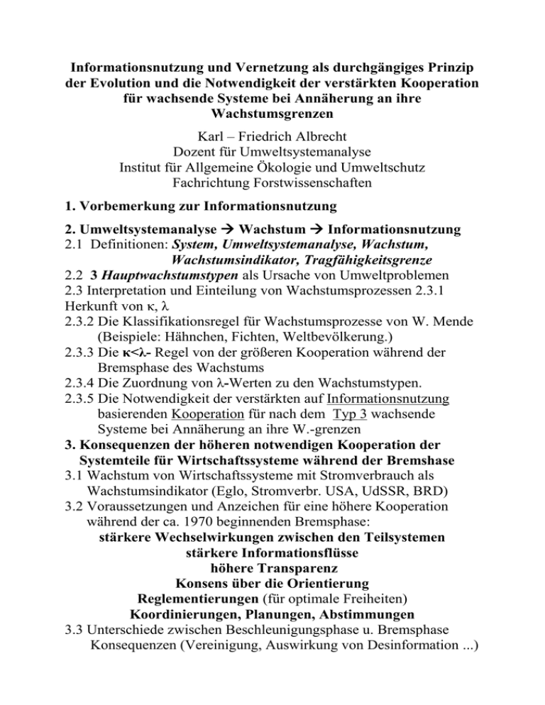 Informationsnutzung und Vernetzung als durchgängiges Prinzip der Evolution und die Notwendigkeit der verstärkten Kooperation für wachsende Systeme bei Annäherung an ihre Wachstumsgrenzen Karl – Friedrich Albrecht Dozent für Umweltsystemanalyse Institut für Allgemeine Ökologie und Umweltschutz Fachrichtung Forstwissenschaften 1. Vorbemerkung zur Informationsnutzung 2. Umweltsystemanalyse Wachstum Informationsnutzung 2.1 Definitionen: System, Umweltsystemanalyse, Wachstum, Wachstumsindikator, Tragfähigkeitsgrenze 2.2 3 Hauptwachstumstypen als Ursache von Umweltproblemen 2.3 Interpretation und Einteilung von Wachstumsprozessen 2.3.1 Herkunft von κ, λ 2.3.2 Die Klassifikationsregel für Wachstumsprozesse von W. Mende (Beispiele: Hähnchen, Fichten, Weltbevölkerung.) 2.3.3 Die κ<λ- Regel von der größeren Kooperation während der Bremsphase des Wachstums 2.3.4 Die Zuordnung von λ-Werten zu den Wachstumstypen. 2.3.5 Die Notwendigkeit der verstärkten auf Informationsnutzung basierenden Kooperation für nach dem Typ 3 wachsende Systeme bei Annäherung an ihre W.-grenzen 3. Konsequenzen der höheren notwendigen Kooperation der Systemteile für Wirtschaftssysteme während der Bremshase 3.1 Wachstum von Wirtschaftssysteme mit Stromverbrauch als Wachstumsindikator (Eglo, Stromverbr. USA, UdSSR, BRD) 3.2 Voraussetzungen und Anzeichen für eine höhere Kooperation während der ca. 1970 beginnenden Bremsphase: stärkere Wechselwirkungen zwischen den Teilsystemen stärkere Informationsflüsse höhere Transparenz Konsens über die Orientierung Reglementierungen (für optimale Freiheiten) Koordinierungen, Planungen, Abstimmungen 3.3 Unterschiede zwischen Beschleunigungsphase u. Bremsphase Konsequenzen (Vereinigung, Auswirkung von Desinformation ...) ((Aus Zeitgründen konnte ich nur den Teil des Vortrags für das Internet vorbereiten, für den ich schnell greifbare Unterlagen hatte. Sollte jemand interessiert sein, sich eingehender mit der Problematik zu befassen kann er gern bei mir meine Folien und weitergehende Literatur einsehen. K.F. Albrecht , Tel 0351 463 31309; [email protected] )) Informationsnutzung und Vernetzung als durchgängiges Prinzip der Evolution und die Notwendigkeit der verstärkten Kooperation für wachsende Systeme bei Annäherung an ihre Wachstumsgrenzen Vorbemerkung: Informationsnutung gibt es seit Leben existiert. Sie hat mit Entwicklung der Biosphäre quantitativ und qualitativ zugenommen. Informationsnutzung hilft beim Sparen von Ressourcenverbrauch (Fisch). Daher wird Informationsnutzung besonders wichtig, wenn Ressourcen knapp werden. F01: Ebeling Kosm. Evolution (s. folgende Seite) Ohne Leben – keine Informationsnutzung; früher nur Informationsaustausch zwischen biologischen Systemen (Zellen, Organen, Individuen, Gemeinschaften {Jagdgemeinschaften}) neuerdings Informationsnutzung zwischen menschlichen und u. technischen Systemen (z.B. Fernsteuerung) Auch Entwicklung der Technosphäre war mit verstärkter Informationsnutzung verbunden. Prof. Haas Informationsübertragung und Nutzung bedarf gemeinsamer abgestimmter Basis „getragenes“, z.B. Geheimcode, Puschkinmuseum Effektive Informationsübertragung bei Säugetieren?: Spielen ergänzt Informationsübertragung auf nächste Generation Problematisch bei schnellem Wechsel der Umweltsituation heute treffen junge Menschen im Vergleich zu Ihren Eltern stark veränderte Situation an Verunsicherung ein Grund für Zunahme von Scheidungen Wie bin ich als Dozent für Umweltsystemanalyse und ehem. Physiker auf die prinzipielle Wichtigkeit der Informationsnutzung gestoßen? Durch Beschäftigung mit Wachstumsprozessen in Systemen. Wachstum tritt prinzipiell in Systemen auf. Daher zunächst Definition von System, Umweltsystemanalyse, Wachstum: DEFINITIONEN System: Ein System besteht aus zusammengehörigen Elementen und der Systemgrenze. Im allgemeinen haben Systeme eine Funktion mit der die Identität des Systems eng verknüpft ist. Die Eigenschaften eines Systems werden wesentlich bestimmt durch die Eigenschaften seiner Elemente und insbesondere durch die Wechselwirkungen dieser Systemelemente untereinander sowie durch die Wechselwirkungen des Systems mit seiner Umwelt. Beispiel: Mensch, Wirtschaftssystem eines Landes… Umweltsystemanalyse: Umweltsystemanalyse untersucht mittels systemanalytischer Methoden die Wechselwirkung zwischen einem belebten System, bevorzugt unter Einschluss des Menschen, und dessen Umwelt. Dazu gehört auch die Untersuchung der Struktur und des Zustandes des belebten Systems sowie des Zustandes seiner Umwelt einschließlich der Untersuchung der zeitlichen Veränderung von System und Umwelt. Diese zeitlichen Veränderungen kommen insbesondere durch die verschiedensten Wechselwirkungen zustande. Das Ziel der Umweltsystemanalyse ist ein besseres Verständnis der realen Existenz und Entwicklungsmöglichkeiten von Systemen als Voraussetzung für die Realisierung der bestmöglichen Varianten. Bei der Umweltsystemanalyse spielt die Betrachtung der Wechselwirkungen mit der Umwelt eine ganz entscheidende Rolle. Beispiel für Umweltwechselwirkungen: Essen, Wärmeabgabe; Außenhandel; Müllabfur... Wegen II. Hauptsatz der Thermodynamik Notwendige Wechselwirkungen Ordnungsstruktur erhaltender Systeme: 1. Entropieexport (z.B. mittels Müllauto) 2. Energieimport (z.B. mittels Tanklaster) Wachstum: Unter Wachstum soll ganz allgemein eine Erscheinung verstanden werden, die bei entsprechenden Bedingungen in unterschiedlichen Systemen auftreten und durch die Vergrößerung eines geeigneten Wachstumsindikators beschrieben werden kann. Die Tabelle enthält beispielhaft Systeme, in denen Wachstum auftreten kann und führt mögliche Wachstumsindikatoren auf. Beispiele für Wachstum in Systemen und für Wachstumsindikatoren: System Wachstumsindikatoren biologisches Individuum Gewicht, Volumen, Länge ... (z.B. Mensch) Population Anzahl der Individuen, Biomasse ... Ökosystem Biomasse, Energieumsatz, ... Wirtschaf