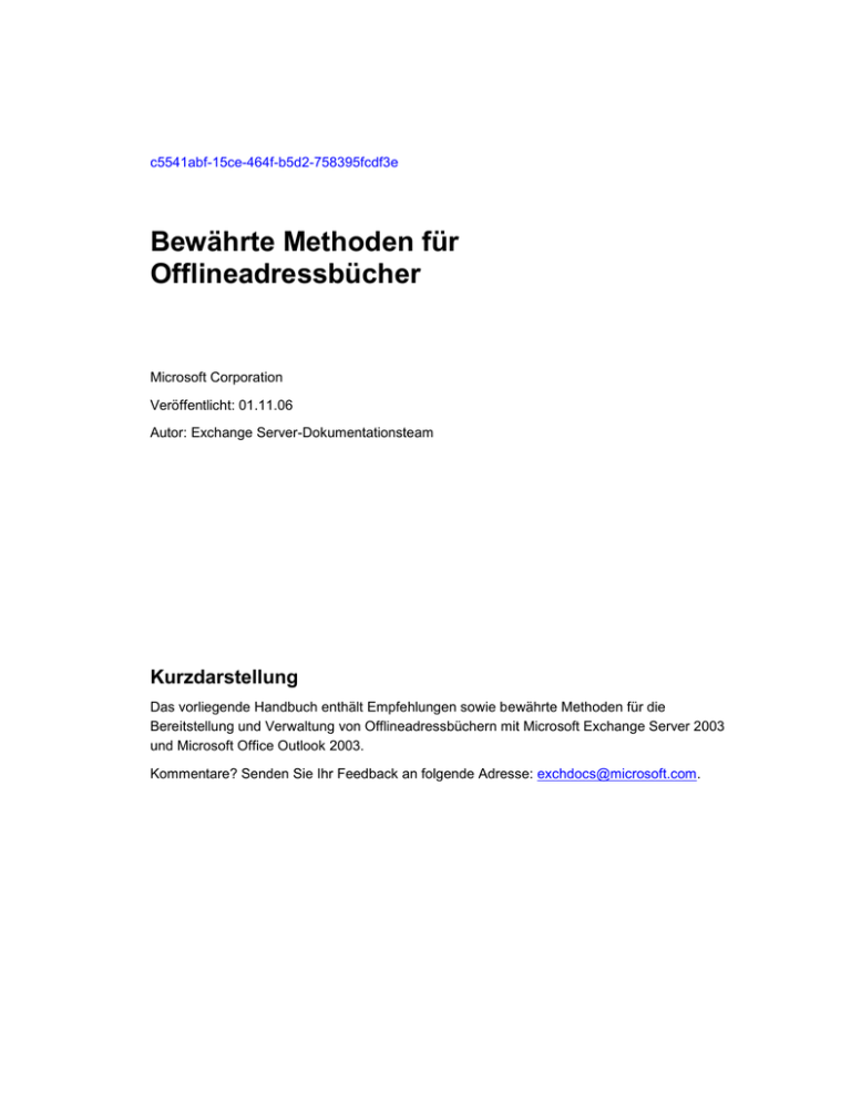 c5541abf-15ce-464f-b5d2-758395fcdf3e Bewährte Methoden für Offlineadressbücher Microsoft Corporation Veröffentlicht: 01.11.06 Autor: Exchange Server-Dokumentationsteam Kurzdarstellung Das vorliegende Handbuch enthält Empfehlungen sowie bewährte Methoden für die Bereitstellung und Verwaltung von Offlineadressbüchern mit Microsoft Exchange Server 2003 und Microsoft Office Outlook 2003. Kommentare? Senden Sie Ihr Feedback an folgende Adresse: [email protected]. Contents Bewährte Methoden für Offlineadressbücher ........................................................................... 7 Einführung in "Bewährte Methoden für Offlineadressbücher" .................................................. 7 Voraussetzungen in diesem Handbuch ................................................................................. 7 Für wen ist dieses Handbuch gedacht? ................................................................................ 8 Terminologie .......................................................................................................................... 8 Technische Übersicht über Offlineadressbücher ...................................................................... 9 Generierung von Offlineadressbüchern ................................................................................. 9 Active Directory-Attribute ..................................................................................................... 11 Anzeigen der Offlineadressbuch-Systemordner im Exchange-System-Manager .................. 12 Verfahren ............................................................................................................................. 12 Weitere Informationen ......................................................................................................... 13 Verbesserungen der Offlineadressbücher .............................................................................. 13 Verbesserungen in Exchange Server 2003 ......................................................................... 13 Verbesserungen in Exchange Server 2003 SP1 ................................................................. 14 Verbesserungen in Outlook 2003 SP1 ................................................................................ 19 Verbesserungen in Exchange Server 2003 SP2 und Outlook 2003 SP2 ........................... 20 Bereitstellungsszenarien für Outlook 2003 ............................................................................. 23 Allgemeine Empfehlungen für das Aktualisieren von Exchange Server- bzw. OutlookVersionen ......................................................................................................................... 24 Aktualisieren von Exchange Server 5.5 ............................................................................... 24 Aktualisieren auf Exchange Server 2003 SP2 und Office Outlook 2003 SP2..................... 26 Standortkonsolidierung ........................................................................................................ 30 Zusammenführen von Verzeichnisdiensten ........................................................................ 32 Bereitstellen von Offlineadressbüchern ............................................................................... 32 Angeben der Versionen des zu generierenden Offlineadressbuchs ................................... 33 Verschieben eines Offlineadressbuchs in Exchange Server 5.5 ............................................ 34 Verfahren ............................................................................................................................. 34 Erstellen von Offlineadressbuch-Dateien auf einem Bereitstellungscomputer ....................... 34 Bevor Sie beginnen ............................................................................................................. 34 Verfahren ............................................................................................................................. 35 Kopieren der Offlineadressbuch-Dateien von einem Testcomputer auf ausgewählte OutlookComputer ............................................................................................................................. 36 Verfahren ............................................................................................................................. 36 Bereitstellen der Sequenznummer für auf dem Testcomputer erstellte OfflineadressbuchDaten ................................................................................................................................... 37 Bevor Sie beginnen ............................................................................................................. 37 Verfahren ............................................................................................................................. 37 Vorgehensweise beim Angeben der Versionen des zu generierenden Offlineadressbuchs .. 38 Bevor Sie beginnen ............................................................................................................. 38 Verfahren ............................................................................................................................. 39 Weitere Informationen ......................................................................................................... 40 Verwenden von Offlineadressbüchern .................................................................................... 40 Auswirkungen der Downloads von Offlineadressbüchern auf das Netzwerk ...................... 40 Hinweise zu Offlineadressbüchern ...................................................................................... 41 Ändern der Ein-Achtel-Regel .................................................................................................. 55 Bevor Sie beginnen ............................................................................................................. 55