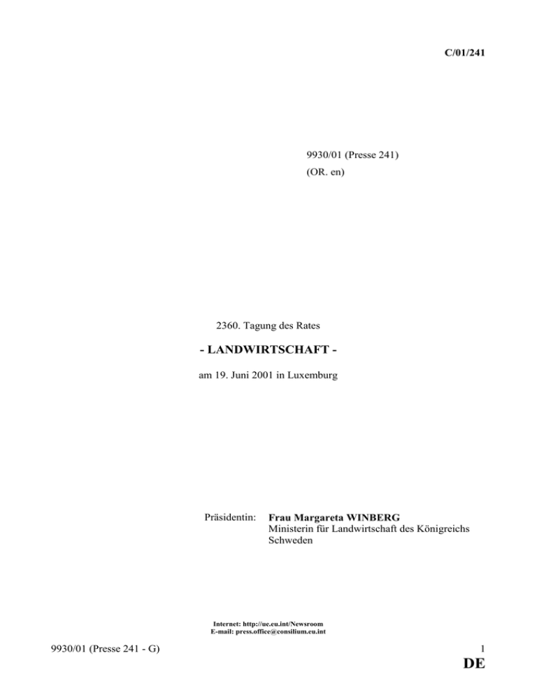 C/01/241 9930/01 (Presse 241) (OR. en) 2360. Tagung des Rates - LANDWIRTSCHAFT am 19. Juni 2001 in Luxemburg Präsidentin: Frau Margareta WINBERG Ministerin für Landwirtschaft des Königreichs Schweden Internet: http://ue.eu.int/Newsroom E-mail: [email protected] 9930/01 (Presse 241 - G) 1 DE INHALT TEILNEHMER .................................................................................................................................. 4 ERÖRTERTE PUNKTE BSE ...................................................................................................................................................... 5 TIERISCHE NEBENPRODUKTE...................................................................................................... 5 SCHUTZ VON SCHWEINEN ............................................................................................................ 6 SCHUTZ VON TIEREN BEIM TRANSPORT - ENTSCHLIESSUNG DES RATES* ................... 7 KLASSISCHE SCHWEINEPEST ...................................................................................................... 9 FUTTERMITTEL - AMTLICHE KONTROLLEN .......................................................................... 10 UNERWÜNSCHTE STOFFE ........................................................................................................... 10 VEREINFACHUNG .......................................................................................................................... 11 GEMEINSCHAFTSREGELN FÜR DIREKTZAHLUNGEN ................................................ 11 INFORMATIONEN ÜBER LAUFENDE ARBEITEN ZUR VEREINFACHUNG .............. 11 OLIVENÖL ....................................................................................................................................... 12 OBST UND GEMÜSE ...................................................................................................................... 12 RINDFLEISCH .................................................................................................................................. 12 HOPFEN ............................................................................................................................................ 13 ÖKOLOGISCH ERZEUGTE LEBENSMITTEL UND ÖKOLOGISCHER LANDBAU SCHLUSSFOLGERUNGEN DES RATES ...................................................................................... 13 SONSTIGES ...................................................................................................................................... 14 RÜCKSTÄNDE VON SCHÄDLINGSBEKÄMPFUNGSMITTELN .................................... 14 BSE-TESTS .............................................................................................................................. 14 MAUL- UND KLAUENSEUCHE .......................................................................................... 15 TIERTRANSPORTE................................................................................................................ 15 CODEX ALIMENTARIUS ..................................................................................................... 15 ZUCKER-EINFUHRREGELUNGEN ..................................................................................... 16 9930/01 (Presse 241 - G) 2 DE OHNE AUSSPRACHE ANGENOMMENE PUNKTE LANDWIRTSCHAFT ............................................................................................................................ I Zuckersektor - Gemeinsame Marktorganisation*..................................................................................................... I Verarbeitungserzeugnisse aus Obst und Gemüse - Gemeinsame Marktorganisation ............................................... I Destillation bestimmter Erzeugnisse des Weinsektors* ........................................................................................... I Aktionsplan zur Erhaltung der biologischen Vielfalt in der Landwirtschaft - Schlussfolgerungen des Rates ......... I FISCHEREI ......................................................................................................................................... II Abkommen mit den Komoren .................................................................................................................................II Verhandlungen mit den AKP-Ländern über Thunfisch ...........................................................................................II AUSSENBEZIEHUNGEN .................................................................................................................. III Beziehungen zu Ägypten ....................................................................................................................................... III _________________ Für weitere Auskünfte: 285.84.15 oder 285.74.59 9930/01 (Presse 241 - G) 3 DE TEILNEHMER Die Regierungen der Mitgliedstaaten und die Europäische Kommission waren wie folgt vertreten: Belgien: Herr Jaak GABRIËLS Dänemark: Frau Ritt BJERREGAARD Herr Poul OTTOSEN Minister der Landwirtschaft und des Mittelstands Ministerin für Ernährung, Landwirtschaft und Fischerei Staatssekretär im Ministerium für Ernährung, Landwirtschaft und Fischerei Deutschland: Frau Renate KÜNAST Bundesministerin für Verbraucherschutz, Ernährung und Landwirtschaft Staatssekretär, Bundesministerium für Verbraucherschutz, Ernährung und Landwirtschaft Herr Martin WILLE Griechenland: Herr Georgios ANOMERITIS Minister für Landwirtschaft Spanien: Herr Miguel ARIAS CAÑETE Minister für Landwirtschaft, Fischerei und Ernährung Frankreich: Herr Jean GLAVANY Minister für Landwirtschaft und Fischerei Irland: Herr Joe WALSH Minister für Landwirtschaft, Ernährung und Entwicklung des ländlichen Raums Italien: Herr Gianni ALEMANNO Minister für Agrar- und Forstpolitik Luxemburg: Herr Fernand BODEN Minister für Landwirtschaft, Weinbau und ländliche Entwicklung Niederlande: Herr Laurens-Jan BRINKHORST Minister für L