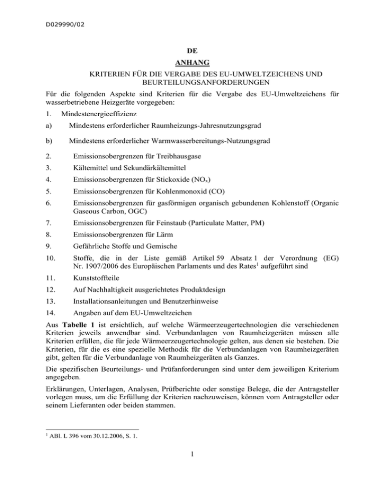 D029990/02 DE ANHANG KRITERIEN FÜR DIE VERGABE DES EU-UMWELTZEICHENS UND BEURTEILUNGSANFORDERUNGEN Für die folgenden Aspekte sind Kriterien für die Vergabe des EU-Umweltzeichens für wasserbetriebene Heizgeräte vorgegeben: 1. Mindestenergieeffizienz a) Mindestens erforderlicher Raumheizungs-Jahresnutzungsgrad b) Mindestens erforderlicher Warmwasserbereitungs-Nutzungsgrad 2. Emissionsobergrenzen für Treibhausgase 3. Kältemittel und Sekundärkältemittel 4. Emissionsobergrenzen für Stickoxide (NOx) 5. Emissionsobergrenzen für Kohlenmonoxid (CO) 6. Emissionsobergrenzen für gasförmigen organisch gebundenen Kohlenstoff (Organic Gaseous Carbon, OGC) 7. Emissionsobergrenzen für Feinstaub (Particulate Matter, PM) 8. Emissionsobergrenzen für Lärm 9. Gefährliche Stoffe und Gemische 10. Stoffe, die in der Liste gemäß Artikel 59 Absatz 1 der Verordnung (EG) Nr. 1907/2006 des Europäischen Parlaments und des Rates1 aufgeführt sind 11. Kunststoffteile 12. Auf Nachhaltigkeit ausgerichtetes Produktdesign 13. Installationsanleitungen und Benutzerhinweise 14. Angaben auf dem EU-Umweltzeichen Aus Tabelle 1 ist ersichtlich, auf welche Wärmeerzeugertechnologien die verschiedenen Kriterien jeweils anwendbar sind. Verbundanlagen von Raumheizgeräten müssen alle Kriterien erfüllen, die für jede Wärmeerzeugertechnologie gelten, aus denen sie bestehen. Die Kriterien, für die es eine spezielle Methodik für die Verbundanlagen von Raumheizgeräten gibt, gelten für die Verbundanlage von Raumheizgeräten als Ganzes. Die spezifischen Beurteilungs- und Prüfanforderungen sind unter dem jeweiligen Kriterium angegeben. Erklärungen, Unterlagen, Analysen, Prüfberichte oder sonstige Belege, die der Antragsteller vorlegen muss, um die Erfüllung der Kriterien nachzuweisen, können vom Antragsteller oder seinem Lieferanten oder beiden stammen. 1 ABl. L 396 vom 30.12.2006, S. 1. 1 D029990/02 Die Prüfungen sind möglichst von Laboratorien durchzuführen, die den allgemeinen Anforderungen der ISO-Norm 17025 oder gleichwertigen Normen entsprechen. Die Prüfverfahren für jedes Kriterium entsprechen, sofern nicht anders angegeben, den in den relevanten Normen beschriebenen Verfahren, die in Tabelle 2 und Tabelle 3 (je nach Anwendbarkeit) aufgeführt sind. Gegebenenfalls können andere als die genannten Prüfverfahren angewandt werden, wenn die den Antrag prüfende zuständige Stelle sie für gleichwertig erachtet. Die Methodik zur Berechnung der Raumheizungs-Jahresemissionen ist in Tabelle 4 dargestellt. Gegebenenfalls können die zuständigen Stellen ergänzende Unterlagen verlangen und unabhängige Prüfungen vornehmen. 2 D029990/02 Tabelle 1. Anwendbarkeit Wärmeerzeugertechnologien Wärmeerzeugertechnologie Kriterien der Heizgeräte mit Gasheizkessel verschiedenen Heizgeräte mit Flüssigbrennstoffheizkessel 1(a) – Mindestens erforderlicher RaumheizungsJahresnutzungsgrad x x 1(b) – Mindestens erforderlicher WarmwasserbereitungsNutzungsgrad (nur für Kombiheizgeräte anwendbar) x x 2 – Emissionsobergrenzen für Treibhausgase x x Heizgeräte mit Festbrennstoffheizkessel x x Kriterien auf die einzelnen Heizgerät mit Elektro heizkessel Mit Brennstoff betriebene Heizgeräte mit Wärme pumpe Elektrisch betriebene Heizgeräte mit Wärmepumpe Heizgeräte mit KraftWärmeKopplung x x x x x x x x x x x x x x 3 – Kältemittel und Sekundärkältemittel 4 – Emissionsobergrenzen für Stickoxide (NOx) x x x x x 5 – Emissionsobergrenzen für Kohlenmonoxid (CO) x x x x x 6 – Emissionsobergrenzen für gasförmigen organisch gebundenen Kohlenstoff (OGC) x 7 – Emissionsobergrenzen für Feinstaub (PM) x x x 8 – Emissionsobergrenzen für Lärm x x x 9 – Gefährliche Stoffe und Gemische x x x x x x x 10 – Stoffe, die in der Liste gemäß Artikel 59 Absatz 1 der Verordnung (EG) Nr. 1907/2006 aufgeführt sind x x x x x x x 3 D029990/02 11– Kunststoffteile x x x x x x x 12– Auf Nachhaltigkeit ausgerichtetes Produktdesign x x x x x x x 13 – Installationsanleitungen und Benutzerhinweise x x x x x x x 14 – Angaben auf dem EUUmweltzeichen x x x x x x x 4 D029990/02 Tabelle 2. Für Prüfverfahren relevante Normen Nummer Titel Heizgeräte mit Gasheizkessel EN 676 Automatische Brenner mit Gebläse für gasförmige Brennstoffe EN 15502-1 Heizkessel für gasförmige Anforderungen und Prüfungen Brennstoffe – Teil 1: Allgemeine Heizgeräte mit Flüssigbrennstoffheizkessel EN 267 Automatische Brenner mit Gebläse für flüssige Brennstoffe EN 303-1 Heizkessel – Teil 1: Heizkessel mit Gebläsebrenner; Begriffe, Allgemeine Anforderungen, Prüfung und Kennzeichnung EN 303-2 Heizkessel – Teil 2: Heizkessel mit Gebläsebrenner; Anforderungen an Heizkessel mit Ölzerstäubungsbrennern EN 303-4 Heizkessel – Teil 4: Heizkessel mit Gebläsebrenner; Spezielle Anforderungen an Heizkessel mit Ölgebläsebrenner mit einer Leistung bis 70 kW und einem maximalen Betriebsdruck von 3 bar; Begriffe, besondere Anforderungen, Prüfung und Kennzeichnung EN 304 Heizkessel - Prüfregeln für Heizkessel mit Ölzerstäubungsbrennern Spezielle Heizgerät mit Festbrennstoffheizkessel EN 303-5 Heizkessel – Teil 5: Heizkessel für feste Brennstoffe, manuell und automatisch beschickte Feuerungen, Nennwärmeleistung bis 500 kW – Begriffe, Anforderungen, Prüfungen und Kennzeichnung EN 14918 Feste Biobrennstoffe - Bestimmung des Heizwertes Heizgerät mit Elektroheizkessel EN 60335-2-35 Sicherheit elektrischer Geräte für den Hausgebrauch und ähnliche Zwecke – Teil 2-35: Besondere Anforderungen für Durchflusserwärmer Mit Brennstoff betriebene Heizgeräte mit Wärmepumpe EN 12309-Reihe Gasbefeuerte Sorptions-Geräte für Heizung und/oder Kühlung mit einer Nennwärmebelastung nicht über 70 kW DIN 4702, Teil 8 Heizkessel; Ermittlung des Norm-Nutzungsgrades und des NormEmissionsfaktors Elektrisch betriebene Heizgeräte mit Wärmepumpe EN 14511-Reihe Luftkonditionierer, Flüssigkeitskühlsätze 5 und Wärmepumpen mit D029990