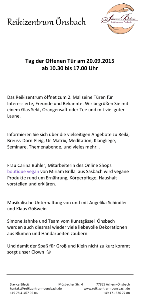 Reikizentrum Önsbach Tag der Offenen Tür am 20.09.2015 ab 10.30 bis 17.00 Uhr Das Reikizentrum öffnet zum 2. Mal seine Türen für Interessierte, Freunde und Bekannte. Wir begrüßen Sie mit einem Glas Sekt, Orangensaft oder Tee und mit viel guter Laune. Informieren Sie sich über die vielseitigen Angebote zu Reiki, Breuss-Dorn-Fleig, Ur-Matrix, Meditation, Klangliege, Seminare, Themenabende, und vieles mehr… Frau Carina Bühler, Mitarbeiterin des Online Shops boutique vegan von Miriam Brilla aus Sasbach wird vegane Produkte rund um Ernährung, Körperpflege, Haushalt vorstellen und erklären. Musikalische Unterhaltung von und mit Angelika Schindler und Klaus Gößwein Simone Jahnke und Team vom Kunstgässel Önsbach werden auch diesmal wieder viele liebevolle Dekorationen aus Blumen und Handarbeiten zaubern Und damit der Spaß für Groß und Klein nicht zu kurz kommt sorgt unser Clown Slavica Bilecić Mösbacher Str. 4 77855 Achern-Önsbach [email protected] www.reikizentrum-oensbach.de +49 78 41/67 95 06 +49 171 576 77 88 Reikizentrum Önsbach Slavica Bilecic / Reiki Meisterin-und Lehrerin Raum 3 Ruhe+Entspannung Zeit : 14.00 Uhr Craniosakral-Balance Anwendung, die besondere Berührung *Spüren*fühlen*lauschen* Andrea C. Barghoorn / Malschuldozentin Raum 3 Ruhe+Entspannung Zeit : 15.00 - 15.30Uhr Farb-Klang-Art +Farbtypbestimmung Welcher Farbtyp sind Sie? Erspüren Sie mit geschlossenen Augen welches Farbton-Spektrum ihr körperliches Wohlbefinden stärkt. Irene Sester / Reikimeisterin Raum 1 Reiki+Klangliege Zeit: 11.30; 14.00 und 16.30 Uhr (jeweils 20-30 Min.) Kleine Einführung - Was ist Reiki? Was bewirkt Reiki? Wem dient Reiki? Wie wird Reiki praktiziert? Andrea C. Barghoorn / Malschuldozentin Raum 1 Reiki+Klangliege Zeit : 12.15 - 12.45Uhr Farb-Klang-Art +meditatives Malen Lassen Sie sich von Klangfarben zum Malen inspirieren. Vertrauen Sie ihrer Intuition und balancieren sie ihre rechte & linke Gehirnhälfte. Klaus Gößwein / Musiktherapeut Raum 1 Reiki+Klangliege Zeit : 13.15 und 15.00 Uhr Vorstellung Klangliege – Was ist eine Klangliege und was bewirkt diese Kerstin Schubert / BewusstSeins-Coaching / QuantumEnergetix-Trainerin Numerologie/Zahlenschau u.v.m Raum 2 / Massageraum Zeit: 11:30 und 15:00 Uhr (jeweils 20-30 Min.) "Einführung in die Numerologie: Sind Zahlen nur Nummern, oder welche Informationen geben sie uns? Welche Rolle spielt z. B. der Geburtstag nur Datum der Geburt oder steckt mehr dahinter?" Dorothea Herzig / Hawaiianische Massagen und Geistiges Heilen Raum 2 / Massageraum Zeit: 12.00 Aroma-Duftreise und 13.00 Uhr Zauber der Berührungen – Hawaiianische Massage (jeweils 20-30 Minuten) Stefanie Ebert / ärtzl. Geprüfte Fußpflegerin / Spirituelle Heilerin nach Heiko Wenig (i.A.) Raum 2 / Massageraum Zeit: 14.00 Uhr Informationen rund um die Füße und 16.00 Uhr Einführung und Information über Aura-Arbeit(jeweils 20-30 Minuten) Slavica Bilecić Mösbacher Str. 4 77855 Achern-Önsbach [email protected] www.reikizentrum-oensbach.de +49 78 41/67 95 06 +49 171 576 77 88