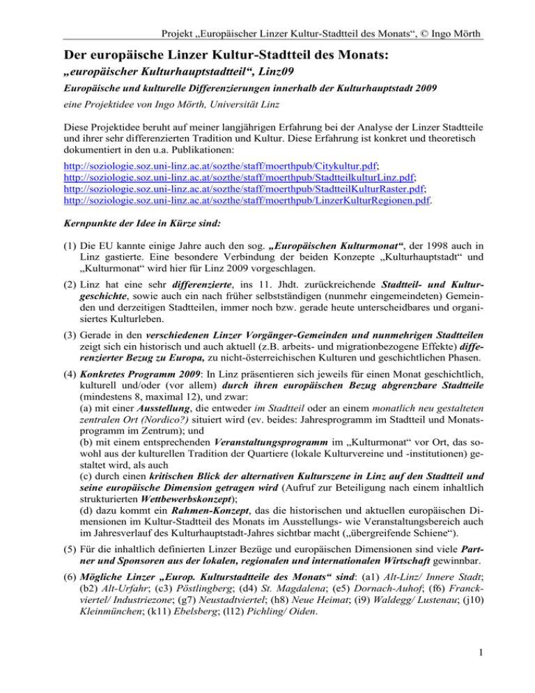 Projekt „Europäischer Linzer Kultur-Stadtteil des Monats“, © Ingo Mörth Der europäische Linzer Kultur-Stadtteil des Monats: „europäischer Kulturhauptstadtteil“, Linz09 Europäische und kulturelle Differenzierungen innerhalb der Kulturhauptstadt 2009 eine Projektidee von Ingo Mörth, Universität Linz Diese Projektidee beruht auf meiner langjährigen Erfahrung bei der Analyse der Linzer Stadtteile und ihrer sehr differenzierten Tradition und Kultur. Diese Erfahrung ist konkret und theoretisch dokumentiert in den u.a. Publikationen: http://soziologie.soz.uni-linz.ac.at/sozthe/staff/moerthpub/Citykultur.pdf; http://soziologie.soz.uni-linz.ac.at/sozthe/staff/moerthpub/StadtteilkulturLinz.pdf; http://soziologie.soz.uni-linz.ac.at/sozthe/staff/moerthpub/StadtteilKulturRaster.pdf; http://soziologie.soz.uni-linz.ac.at/sozthe/staff/moerthpub/LinzerKulturRegionen.pdf. Kernpunkte der Idee in Kürze sind: (1) Die EU kannte einige Jahre auch den sog. „Europäischen Kulturmonat“, der 1998 auch in Linz gastierte. Eine besondere Verbindung der beiden Konzepte „Kulturhauptstadt“ und „Kulturmonat“ wird hier für Linz 2009 vorgeschlagen. (2) Linz hat eine sehr differenzierte, ins 11. Jhdt. zurückreichende Stadtteil- und Kulturgeschichte, sowie auch ein nach früher selbstständigen (nunmehr eingemeindeten) Gemeinden und derzeitigen Stadtteilen, immer noch bzw. gerade heute unterscheidbares und organisiertes Kulturleben. (3) Gerade in den verschiedenen Linzer Vorgänger-Gemeinden und nunmehrigen Stadtteilen zeigt sich ein historisch und auch aktuell (z.B. arbeits- und migrationbezogene Effekte) differenzierter Bezug zu Europa, zu nicht-österreichischen Kulturen und geschichtlichen Phasen. (4) Konkretes Programm 2009: In Linz präsentieren sich jeweils für einen Monat geschichtlich, kulturell und/oder (vor allem) durch ihren europäischen Bezug abgrenzbare Stadtteile (mindestens 8, maximal 12), und zwar: (a) mit einer Ausstellung, die entweder im Stadtteil oder an einem monatlich neu gestalteten zentralen Ort (Nordico?) situiert wird (ev. beides: Jahresprogramm im Stadtteil und Monatsprogramm im Zentrum); und (b) mit einem entsprechenden Veranstaltungsprogramm im „Kulturmonat“ vor Ort, das sowohl aus der kulturellen Tradition der Quartiere (lokale Kulturvereine und -institutionen) gestaltet wird, als auch (c) durch einen kritischen Blick der alternativen Kulturszene in Linz auf den Stadtteil und seine europäische Dimension getragen wird (Aufruf zur Beteiligung nach einem inhaltlich strukturierten Wettbewerbskonzept); (d) dazu kommt ein Rahmen-Konzept, das die historischen und aktuellen europäischen Dimensionen im Kultur-Stadtteil des Monats im Ausstellungs- wie Veranstaltungsbereich auch im Jahresverlauf des Kulturhauptstadt-Jahres sichtbar macht („übergreifende Schiene“). (5) Für die inhaltlich definierten Linzer Bezüge und europäischen Dimensionen sind viele Partner und Sponsoren aus der lokalen, regionalen und internationalen Wirtschaft gewinnbar. (6) Mögliche Linzer „Europ. Kulturstadtteile des Monats“ sind: (a1) Alt-Linz/ Innere Stadt; (b2) Alt-Urfahr; (c3) Pöstlingberg; (d4) St. Magdalena; (e5) Dornach-Auhof; (f6) Franckviertel/ Industriezone; (g7) Neustadtviertel; (h8) Neue Heimat; (i9) Waldegg/ Lustenau; (j10) Kleinmünchen; (k11) Ebelsberg; (l12) Pichling/ Oiden. 1 Projekt „Europäischer Linzer Kultur-Stadtteil des Monats“, © Ingo Mörth Inhaltsverzeichnis 1 HINTERGRÜNDE UND GRUNDLAGEN DER IDEE .................................................................... 4 1.1 DIE EINSTIGE „EUROPÄISCHE-KULTURMONAT-IDEE“ VOR ORT TRANSFORMIERT ...................... 4 1.2 DIE EIGENSTÄNDIGE TRADITION DER LINZER STADTTEILE ALS SELBSTSTÄNDIGE GEMEINDEN 4 1.2.1 1.2.1.1 1.2.2 1.2.2.1 1.2.3 1.2.3.1 1.2.4 1.2.4.1 1.2.5 1.2.5.1 EHEMALIGE GEMEINDE WALDEGG (= EINGEMEINDET ZU LINZ 1873)............................................ 4 Europäische Dimensionen „Waldegg“.......................................................................................... 4 EHEMALIGE GEMEINDE LUSTENAU (= EINGEMEINDET ZU LINZ 1873) ........................................... 5 Europäische Dimensionen „Lustenau“ ......................................................................................... 5 EHEMALIGE GEMEINDE SANKT PETER IN DER ZIZLAU (= EINGEMEINDET ZU LINZ 1915).............. 5 Europäische Dimensionen „St. Peter/ Zizlau“ .............................................................................. 6 EHEMALIGE GEMEINDE PÖSTLINGBERG (= EINGEMEINDET ZU LINZ 1919) .................................... 6 Europäische Dimensionen „Pöstlingberg“ .................................................................................... 6 EHEMALIGE STADTGEMEINDE URFAHR (= EINGEMEINDET ZU LINZ 1919)..................................... 7 Europäische Dimesionen „(Alt-)Urfahr“ ...................................................................................... 7 1.2.6 EHEMALIGE GEMEINDE KLEINMÜNCHEN (= EINGEMEINDET ZU LINZ 1923) .................................. 7 1.2.6.1 Teile von Kleinmünchen als österr. Knotenpunkt europäischen „Displacements“ ...................... 8 1.2.6.2 Dauer-Lagerplatz der Sinti bis heute ............................................................................................ 8 1.2.6.3 Europäische Dimensionen „Kleinmünchen“ insgesamt ............................................................... 8 1.2.7 1.2.7.1 1.2.8 1.2.8.1 HEUTIGE STADTGEMEINDE STEYREGG (= TEILE EINGEMEINDET ZU LINZ 1934/1938) .................. 9 Europäische Dimensionen „Steyregg“ .......................................................................................... 9 EHEMALIGE GEMEINDE ST. MAGDALENA (= EINGEMEINDET ZU LINZ 1938) ................................. 9 Europäische Dimensionen „St. Magdalena“ ................................................................................. 9 1.2.9 EHEMALIGE GEMEINDE EBELSBERG (= EING