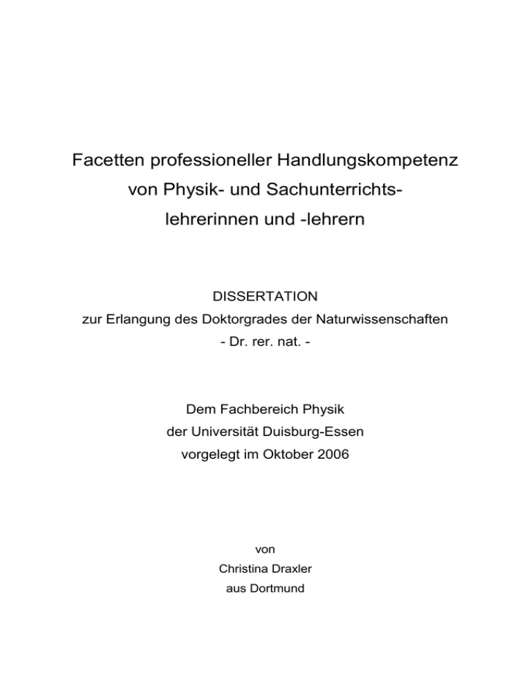 Facetten professioneller Handlungskompetenz von Physik- und Sachunterrichtslehrerinnen und -lehrern DISSERTATION zur Erlangung des Doktorgrades der Naturwissenschaften - Dr. rer. nat. - Dem Fachbereich Physik der Universität Duisburg-Essen vorgelegt im Oktober 2006 von Christina Draxler aus Dortmund Erstgutachter: Prof. Dr. H. E. Fischer Zweitgutachter: Prof. Dr. G. Born Tag der Disputation: 12.04.2007 Danksagung Ich bedanke mich herzlich bei Herrn Prof. Dr. Hans E. Fischer für die Gelegenheit zu dieser Arbeit, seine stetige Unterstützung und wertvollen Hinweise. Er war jederzeit ansprechbar und offen für die Diskussion von Problemen und offenen Fragen. Insbesondere bedanke mich bei Herrn Dr. Georg Trendel und Herrn Dr. Thomas Reyer für die hervorragende Zusammenarbeit, zahlreichen Tipps und anregenden Diskussionen. Bei Herrn Dr. Thomas Reyer möchte ich mich zusätzlich für seine nützlichen Hinweise und Anregungen bezüglich der Datenauswertung bedanken. Ich danke auch den studentischen Hilfskräften Nina Buchert und Julia Rüding, die viele Stunden mit der Dateneingabe der zahlreichen Fragebögen verbrachten und ihre Aufgaben stets zuverlässig und gewissenhaft erfüllten. Mein Dank gilt auch den an dieser Untersuchung teilnehmenden Lehrerinnen und Lehrern, die sich die Zeit genommen haben, den Fragebogen auszufüllen. Ich danke all denen, die die vorliegende Arbeit auf Rechtschreibfehler hin Korrektur gelesen haben. Mein abschließender Dank gilt meinem ehemaligen Arbeitskollegen und heutigem Ehemann Dennis Draxler, der mich während des Verfassens dieser Arbeit stets unterstützt hat und mich immer wieder zur Weiterarbeit motiviert hat. INHALTSVERZEICHNIS EINLEITUNG 1 THEORETISCHER TEIL KAPITEL 1 LERNTHEORETISCHE GRUNDLAGEN 1-1 1-2 1-3 1-4 BEHAVIORISMUS KOGNITIVISMUS KONSTRUKTIVISMUS ZUSAMMENFASSUNG KAPITEL 1 5 6 9 12 21 KAPITEL 2 DIE OSERSCHE BASISMODELLTHEORIE 23 2-1 2-2 2-3 24 26 32 DIE BASISMODELLTHEORIE NACH OSER AUSWAHL UND MODIFIKATION DER OSERSCHEN BASISMODELLE NACH REYER 2003 ZUSAMMENFASSUNG KAPITEL 2 KAPITEL 3 ÜBERGEORDNETE LEHRZIELE: NATURWISSENSCHAFTLICHE ARBEITSMETHODEN UND SCIENTIFIC LITERACY 33 3-1 SCIENTIFIC LITERACY 3-2 NATURWISSENSCHAFTLICHE ARBEITSMETHODEN ZUSAMMENFASSUNG KAPITEL 3 35 41 44 KAPITEL 4 IMPLIZITE PERSÖNLICHKEITSTHEORIEN UND SUBJEKTIVE THEORIEN VON LEHRERN 45 4-1 4-2 4-3 IMPLIZITE (PERSÖNLICHKEITS-) THEORIEN SUBJEKTIVE THEORIEN ZUSAMMENFASSUNG KAPITEL 4 47 50 63 EMPIRISCHER TEIL KAPITEL 5 ZIELE DER UNTERSUCHUNG 65 5-1 5-2 66 66 FORSCHUNGSFRAGEN AUFBAU DES EMPIRISCHEN TEILS DIESER ARBEIT KAPITEL 6 UNTERSUCHUNGSDESIGN UND HYPOTHESEN 69 6-1 6-2 6-3 69 70 74 ZIELGRUPPE HYPOTHESEN UNTERSUCHUNGSDESIGN KAPITEL 7 ERHEBUNGSMETHODE 77 7-1 7-2 77 77 ANFORDERUNGEN AN DAS INSTRUMENT ZUR DATENERHEBUNG KONSTRUKTIONSKRITERIEN DER EINZELNEN FRAGEBOGENTEILE KAPITEL 8 ENTWICKLUNG DES FRAGEBOGENS 83 8-1 8-2 8-3 8-4 83 84 90 90 VORÜBERLEGUNGEN VORUNTERSUCHUNG EXPERTENRATING ZUSAMMENFASSUNG KAPITEL 9 HAUPTUNTERSUCHUNG 91 9-1 DESIGN 9-2 BESCHREIBUNG DER DATENANALYSE 9-3 BESCHREIBUNG DER STICHPROBE 9-4 EVALUATION DES MESSINSTRUMENTS 9-5 DARSTELLUNG DER ERGEBNISSE 9-6 ZUSAMMENFASSENDE DARSTELLUNG DER SCHULFORMSPEZIFISCHEN ERGEBNISSE 9-7 IDENTIFIKATION VON SCHULFORM-, ALTERS- UND GESCHLECHTS-ÜBERGREIFENDEN LEHRERTYPEN 91 92 93 95 100 159 KAPITEL 10 HYPOTHESENDISKUSSION 171 10-1 10-2 10-3 10-4 10-5 DISKUSSION HYPOTHESE 1 DISKUSSION HYPOTHESE 2 DISKUSSION HYPOTHESE 3 DISKUSSION HYPOTHESE 4 DISKUSSION HYPOTHESE 5 171 173 175 177 178 KAPITEL 11 ZUSAMMENFASSUNG 179 11-1 11-2 11-3 11-4 11-5 179 179 180 181 183 THEORETISCHE GRUNDLAGEN UNTERSUCHUNGSDESIGN UNTERSUCHUNGSINSTRUMENT HYPOTHESEN UND ERGEBNISSE AUSBLICK 167 ABKÜRZUNGS- UND LITERATURVERZEICHNIS 187 ABKÜRZUNGSVERZEICHNIS LITERATURVERZEICHNIS 187 189 ANHANG 197 Abbildungsverzeichnis Abbildung 1: Professionelle Handlungskompetenz von Mathematiklehrkräften, Krauss et al. 2004, S.6.................................................................................................... 1 Abbildung 2: Professionelle Handlungskompetenz von Physiklehrkräften ............................................. 2 Abbildung 3: Professionelle Handlungskompetenz von Physiklehrkräften – Pädagogisches Wissen.... 5 Abbildung 4: Schematische Darstellung einer klassischen Konditionierung ........................................... 7 Abbildung 5: Professionelle Handlungskompetenz von Physiklehrkräften – Fachdidaktisches und pädagogisches Wissen ................................................................................................... 23 Abbildung 6: Professionelle Handlungskompetenz von Physiklehrkräften - Fachwissen und Fachdidaktisches Wissen ............................................................................................... 34 Abbildung 7: Schematische Darstellung des hypothetisch-deduktiven Erkenntnisprozesses nach Kircher et al. 2001, S. 150 .............................................................................................. 43 Abbildung 8: Professionelle Handlungskompetenz von Physiklehrkräften – Überzeugungen/ Werthaltungen und Motivationale Orientierungen .......................................................... 45 Abbildung 9: Studiendesign ................................................................................................................... 75 Abbildung 10: Professionelle Handlungskompetenz von Physiklehrkräften ......................................... 78 Abbildung 11: Item discrimination Teil E ............................................................................................... 89 Abbildung 12: Alterstruktur der Stichprobe nach Schulformen ............................................................. 93 Abbildung 13: Darstellung der geschlechtsspezifischen Struktur der Schulformen .............................. 94 Abbildung 14 Item discrimination Teil E ................................................................................................ 97 Abbildung