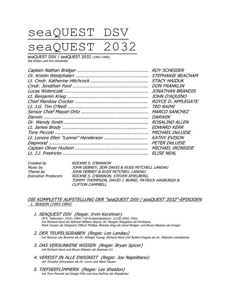 seaQUEST DSV seaQUEST 2032 seaQUEST DSV / seaQUEST 2032 (1993-1996) Die Rollen und ihre Darsteller Captain Nathan Bridger ................................................... Dr. Kristin Westphalen .................................................... Lt. Cmdr. Katherine Hitchcock ......................................... Cmdr. Jonathan Ford ...................................................... Lucas Wolenczak ............................................................ Lt. Benjamin Krieg .......................................................... Chief Manilow Crocker .................................................... Lt. J.G. Tim O’Neill ......................................................... Sensor Chief Miquel Ortiz ................................................ Darwin ........................................................................... Dr. Wendy Smith ............................................................ Lt. James Brody ............................................................. Tony Piccolo ................................................................... Lt. Lenore Ellen "Lonnie" Henderson ............................... Dagwood ....................................................................... Captain Oliver Hudson .................................................... Lt. J.J. Fredricks ............................................................. Created by Music by Theme by Executive Producers ROY SCHEIDER STEPHANIE BEACHAM STACY HAIDUK DON FRANKLIN JONATHAN BRANDIS JOHN D’AQUINO ROYCE D. APPLEGATE TED RAIMI MARCO SANCHEZ DARWIN ROSALIND ALLEN EDWARD KERR MICHAEL DeLUISE KATHY EVISON PETER DeLUISE MICHAEL IRONSIDE ELISE NEAL ROCKNE S. O’BANNON JOHN DEBNEY, DON DAVIS & RUSS MITCHELL LANDAU JOHN DEBNEY & RUSS MITCHELL LANDAU ROCKNE S. O’BANNON, STEVEN SPIELBERG, TOMMY THOMPSON, DAVID J. BURKE, PATRICK HASBURGH & CLIFTON CAMPBELL DIE KOMPLETTE AUFSTELLUNG DER "seaQUEST DSV / seaQUEST 2032"-EPISODEN 1. SEASON (1993-1994) 1. SEAQUEST DSV (Regie: Irvin Kershner) (RTL Television: 19.01.1994 / US-Erstsendedatum: 12.09.1993; Film) mit Richard Herd als Admiral William Noyce, W. Morgan Sheppard als Professor, Mark Fauser als Weapons Officer Phillips, Brenda King als Carol Bridger und Bruce Klassen als Ensign 2. DER TEUFELSGRABEN (Regie: Les Landau) mit Roscoe Lee Browne als Dr. Raleigh Young, Richard Herd und Robert Engels als Dr. Malcolm Lansdowne 3. DAS VERSUNKENE WISSEN (Regie: Bryan Spicer) mit Richard Herd und Bruce Klassen als Seaman #1 4. VEREIST IN ALLE EWIGKEIT (Regie: Joe Napolitano) mit Timothy Omundson als Dr. Levin und Mark Fauser 5. TIEFSEEFLIMMERN (Regie: Les Sheldon) mit Tom Provost als Ensign Filie und Ava DuPree als Dispatcher 6. DIE VERGESSENEN KINDER (Regie: Bill L. Norton) 7. TÖDLICHE GENE (Regie: Bill L. Norton) mit Timothy Omundson, Bruce Klassen als Military Person #1 und Mark Fauser 8. DAS GEISTERSCHIFF (Regie: Helaine Head) mit W. Morgan Sheppard und Timothy Omundson 9. S.O.S. IM SARGASSOMEER (Regie: Bryan Spicer) mit Timothy Omundson 10. DER REGULATOR (Regie: Les Sheldon) mit W. Morgan Sheppard, Andre Dukes als Mars, Ava DuPree als Non-Com #1 und Tom Provost 11. GOLDRAUSCH (Regie: Gabrielle Beaumont) mit W. Morgan Sheppard 12. KAMPF GEGEN DIE WELT (Regie: Steve Dubin) mit Sarah Koskoff als Julianna 13. DUELL DER ENTDECKER (Regie: John T. Kretchmer) mit Kent McCord als Commander Scott Keller, James Shigeta als President Hoi Chi und Richard Herd 14. GEFÄHRLICHES EXPERIMENT (Regie: Les Sheldon) mit W. Morgan Sheppard und Thom Sherman als Sheppard 15. DIE SCHATZINSEL (Regie: James A. Contner) mit Roscoe Lee Browne, W. Morgan Sheppard, Richard Herd, Mark Fauser und Andre Dukes 16. DER RÄCHER DER WALE (Regie: Bryan Spicer) mit Robert Engels, Peter DeLuise als Wiggins, Jesse Doran als General Frank Thomas und Richard Herd 17. TURBULENZEN (Regie: Jonathan Singer) mit Richard Herd und Mimi Lieber als Kellog 18. DER ALPTRAUM (Regie: Lindsley Parsons III) mit Robert Engels und Richard Herd 19. IN LETZTER SEKUNDE (Regie: Bryan Spicer) mit James Shigeta und Richard Herd 20. DIE MEERJUNGFRAU (Regie: Les Sheldon) mit Sarah Koskoff und Dustin Nguyen als Chief William Shan 21. ENDLOSE GEDULD (Regie: Bryan Spicer) mit Kent McCord, W. Morgan Sheppard, Jesse Doran, Dustin Nguyen, Thom Sherman und Karyn Malchus als Alien 22. DIE SCHWESTERN VOM GUTEN TOD (Regie: David J. Burke) mit Dustin Nguyen, Richard Herd und Christopher M. Brown als Obatu 23. DAS ENDE DER SEAQUEST (Regie: John T. Kretchmer) letzte feste Episode mit John D’Aquino; letzte Episode mit Stacy Haiduk, Royce D. Applegate und Stephanie Beacham; mit Dustin Nguyen, Richard Herd, Christopher M. Brown und Brenda King 2. SEASON (1994-1995) 24. SEAQUEST DSV - TEIL 1 (Regie: Bryan Spicer) erste feste Episode mit Peter DeLuise; erste Episode mit Rosalind Allen, Edward Kerr, Michael DeLuise und Kathy Evison; mit Sam Jenkins als Maria, Jesse Doran und Lehua Reid als Crew Person 25. SEAQUEST DSV - TEIL 2 (Regie: Bryan Spicer) mit Sam Jenkins, Jesse Doran und Lehua Reid 26. DIE ANGST IM NACKEN (Regie: Robert Wiemer) mit Kent McCord, Jesse Doran, Karyn Malchus als Lemus, Christina Chauncey als Booa und Michael Costello als UEO General McGath 27. IM RAUSCH DER TIEFE (Regie: Bruce Seth Green) mit Jim Vickers als Looter #2 28. LANDURLAUB (Regie: Les Sheldon) 29. HILFERUFE AUS DER ZUKUNFT (Regie: Robert Wiemer) 30. BEGEGNUNG MIT DER VERGANGENHEIT (Regie: Jesus S. Trevino) mit Richard Herd, Mimi Lieber, W. Morgan Sheppard und Michael Costello 31. SCHLINGEN DES TODES (Regie: Burt Brinckerhoff) mit Michael Costello 32. WENN TOTE ERWACHEN (Regie: Annette Hayward-Carter) mit Jesse Doran, Lehua Reid als Lt. Marge und Peggy O’Neal als Anita 33. FAMILIENBANDE (Regie: Gus Trikonis) mit Brittany Snow als Young Girl 34. EIN MANN ZUVIEL (Regie: Steven Robman) 35. GRÜSSE AUS DER STEINZEIT (Regie: Anson Williams) mit Dorian Field als Jenna 36. AUF DER SUCHE NACH ATLANTIS (Regie: Bruce Seth Green) mit Michael 