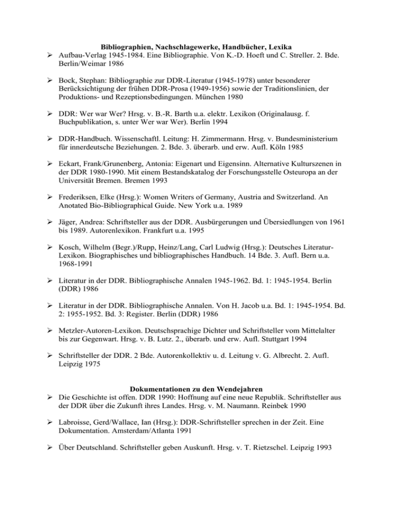 Bibliographien, Nachschlagewerke, Handbücher, Lexika Aufbau-Verlag 1945-1984. Eine Bibliographie. Von K.-D. Hoeft und C. Streller. 2. Bde. Berlin/Weimar 1986 Bock, Stephan: Bibliographie zur DDR-Literatur (1945-1978) unter besonderer Berücksichtigung der frühen DDR-Prosa (1949-1956) sowie der Traditionslinien, der Produktions- und Rezeptionsbedingungen. München 1980 DDR: Wer war Wer? Hrsg. v. B.-R. Barth u.a. elektr. Lexikon (Originalausg. f. Buchpublikation, s. unter Wer war Wer). Berlin 1994 DDR-Handbuch. Wissenschaftl. Leitung: H. Zimmermann. Hrsg. v. Bundesministerium für innerdeutsche Beziehungen. 2. Bde. 3. überarb. und erw. Aufl. Köln 1985 Eckart, Frank/Grunenberg, Antonia: Eigenart und Eigensinn. Alternative Kulturszenen in der DDR 1980-1990. Mit einem Bestandskatalog der Forschungsstelle Osteuropa an der Universität Bremen. Bremen 1993 Frederiksen, Elke (Hrsg.): Women Writers of Germany, Austria and Switzerland. An Anotated Bio-Bibliographical Guide. New York u.a. 1989 Jäger, Andrea: Schriftsteller aus der DDR. Ausbürgerungen und Übersiedlungen von 1961 bis 1989. Autorenlexikon. Frankfurt u.a. 1995 Kosch, Wilhelm (Begr.)/Rupp, Heinz/Lang, Carl Ludwig (Hrsg.): Deutsches LiteraturLexikon. Biographisches und bibliographisches Handbuch. 14 Bde. 3. Aufl. Bern u.a. 1968-1991 Literatur in der DDR. Bibliographische Annalen 1945-1962. Bd. 1: 1945-1954. Berlin (DDR) 1986 Literatur in der DDR. Bibliographische Annalen. Von H. Jacob u.a. Bd. 1: 1945-1954. Bd. 2: 1955-1952. Bd. 3: Register. Berlin (DDR) 1986 Metzler-Autoren-Lexikon. Deutschsprachige Dichter und Schriftsteller vom Mittelalter bis zur Gegenwart. Hrsg. v. B. Lutz. 2., überarb. und erw. Aufl. Stuttgart 1994 Schriftsteller der DDR. 2 Bde. Autorenkollektiv u. d. Leitung v. G. Albrecht. 2. Aufl. Leipzig 1975 Dokumentationen zu den Wendejahren Die Geschichte ist offen. DDR 1990: Hoffnung auf eine neue Republik. Schriftsteller aus der DDR über die Zukunft ihres Landes. Hrsg. v. M. Naumann. Reinbek 1990 Labroisse, Gerd/Wallace, Ian (Hrsg.): DDR-Schriftsteller sprechen in der Zeit. Eine Dokumentation. Amsterdam/Atlanta 1991 Über Deutschland. Schriftsteller geben Auskunft. Hrsg. v. T. Rietzschel. Leipzig 1993 Zeitschriften und Reihen aus der DDR Aufbau. Kulturpolitische Monatsschrift mit literarischen Beiträgen. Hrsg. v. Kulturbund zur demokratischen Erneuerung Deutschlands. Berlin 1 (1945) – 14 (1958) Die Weltbühne. Wochenschrift für Politik – Kunst – Wissenschaft. Berlin 1 (1946) ff. Forum. Organ des Zentralrats der FDJ. Zeitung für geistige Probleme der Jugend. Berlin 1966-83 Neue Deutsche Literatur. Hrsg. v. [Deutschen] Schriftstellerverband [der DDR] – Berlin 1 (1953) ff. Neue Texte. Ein Almanach des Aufbau-Verlages. Berlin 1962-1968 Sinn und Form. Beiträge zur Literatur. Hrsg. v. der [Deutschen] Akademie der Künste [der DDR]. Potsdam (ab 1951 Berlin) 1 (1949) ff. Sonntag. Die kulturpolitische Wochenzeitung. Hrsg. v. Kulturbund zur demokratischen Erneuerung Deutschlands. Berlin 1 (1946) – 45 (1990) Weimarer Beiträge. Zeitschrift für Literaturwissenschaft (ab 1970: Zeitschrift für Literaturwissenschaft. Ästhetik und Kulturtheorie). Berlin/Weimar (ab 1992 Wien) 1 (1955) ff. Zeitschrift für Germanistik. Hrsg. v. der Humboldt-Universität zu Berlin. Berlin 1 (1979) – 16 (1994). Neue Folge 1 (1995) ff. Autobiographien, Memoiren, Tagebücher de Bruyn, Günter: Zwischenbilanz. Eine Jugend in Berlin. Frankfurt 1992 Giordano, Ralph: Die Partei hat immer recht. Köln/Berlin 1961 Harich, Wolfgang: Keine Schwierigkeiten mit der Wahrheit. Zur nationalkommunistischen Opposition in der DDR 1956. Berlin 1993 Heym, Stefan: Nachruf. München 1988 Janka, Walter: Schwierigkeiten mit der Wahrheit. Reinbek 1989 (Berlin/DDR 1990) Johnson, Uwe: Begleitumstände. Frankfurter Vorlesungen. Frankfurt 1980 Kant, Hermann: Abspann. Erinnerungen an meine Gegenwart. Berlin/Weimar 1991 Loest, Erich: Durch die Erde ein Riß. Ein Lebenslauf. Hamburg 1981 Gesamtdarstellungen der DDR-Literatur Arnold, Heinz Ludwig/Meyer-Gosau, Frauke (Hrsg.): Literatur in der DDR. Rückblicke. München 1991 (= Sonderband Text+Kritik) Arnold, H. L. (Hrsg.): Ansichten und Auskünfte zur deutschen Literatur nach 1945. München 1995 (= Sonderband Text+Kritik) Barner, Wilfried (Hrsg.): Geschichte der deutschen Literatur von 1945 bis zur Gegenwart. München 1994 [ausführliche Kapitel zur DDR-Literatur von W. Barner, A. Hartmann, L. Köhn und J. Schröder] Bathrick, David: Geschichtsbewußtsein als Selbstbewußtsein. Die Literatur der DDR. In: Neues Handbuch der Literaturwissenschaft. Bd. 21. Hrsg. v. J. Hermand. Wiesbaden 1979, S.273-314 Best, Otto F.: Die Literatur der DDR. In: Geschichte der deutschen Literatur. Hrsg. v. E. Bahr. Bd. 3. Tübingen 1998, S. 499-549 Brettschneider, Werner: Zwischen literarischer Autonomie und Staatsdienst. Die Literatur der DDR. Berlin (West) 1972 Deiritz, Karl/Kraus, Hannes (Hrsg.): Verrat an der Kunst? Rückblicke auf die DDRLiteratur. Berlin 1993 Emmerich, Wolfgang: Die andere deutsche Literatur. Aufsätze zur Literatur aus der DDR. Opladen 1994 Emmerich, W.: Kleine Literaturgeschichte der DDR 1945-1988. Erweiterte Ausgabe (= 5. überarb. und erw. Aufl.). Frankfurt 1989 Franke, Konrad: Die Literatur der DDR. München 1971 (= Kindlers Literaturgeschichte der Gegenwart, Bd. 2). 2. neubearb. Ausgabe 1974. 3. erw. Ausg. Frankfurt 1980 Geschichte der Literatur der DDR. Von einem Autorenkollektiv unter Leitung von H. Haase u.a. Berlin (DDR) 1976 (= Geschichte der deutschen Literatur von den Anfängen bis zur Gegenwart, Bd. 11) Literatur der DDR. Einzeldarstellungen. Von einem Autorenkollektiv unter Leitung von H. J. Geerdts. Bd. 1. Stuttgart 1972/Berlin (DDR) 1974. Bd. 2. Berlin (DDR) 1979. Bd. 3. Berlin (DDR) 1987 Scharfschwerdt, Jürgen: Literatur und Literaturwissenschaft in der DDR. Eine historischkritische Einführung. Stuttgart/Berlin/Köln/Mainz 1982 Schmitt, Hans-Jürgen (Hrsg.): Die Literatur der DDR. München/Wien 