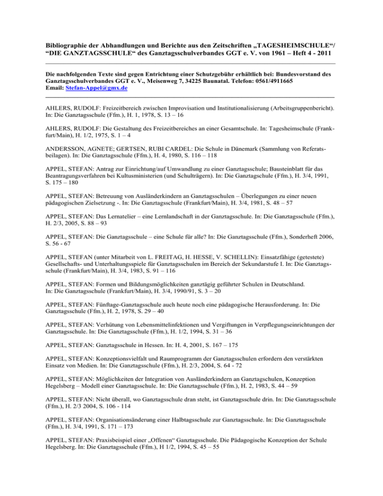 Bibliographie der Abhandlungen und Berichte aus den Zeitschriften „TAGESHEIMSCHULE“/ “DIE GANZTAGSSCHULE“ des Ganztagsschulverbandes GGT e. V. von 1961 – Heft 4 - 2011 __________________________________________________________________________________ Die nachfolgenden Texte sind gegen Entrichtung einer Schutzgebühr erhältlich bei: Bundesvorstand des Ganztagsschulverbandes GGT e. V., Meisenweg 7, 34225 Baunatal. Telefon: 0561/4911665 Email: [email protected] __________________________________________________________________________________________ AHLERS, RUDOLF: Freizeitbereich zwischen Improvisation und Institutionalisierung (Arbeitsgruppenbericht). In: Die Ganztagsschule (Ffm.), H. 1, 1978, S. 13 – 16 AHLERS, RUDOLF: Die Gestaltung des Freizeitbereiches an einer Gesamtschule. In: Tagesheimschule (Frankfurt/Main), H. 1/2, 1975, S. 1 – 4 ANDERSSON, AGNETE; GERTSEN, RUBI CARDEL: Die Schule in Dänemark (Sammlung von Referatsbeilagen). In: Die Ganztagsschule (Ffm.), H. 4, 1980, S. 116 – 118 APPEL, STEFAN: Antrag zur Einrichtung/auf Umwandlung zu einer Ganztagsschule; Bausteinblatt für das Beantragungsverfahren bei Kultusministerien (und Schulträgern). In: Die Ganztagschule (Ffm.), H. 3/4, 1991, S. 175 – 180 APPEL, STEFAN: Betreuung von Ausländerkindern an Ganztagsschulen – Überlegungen zu einer neuen pädagogischen Zielsetzung -. In: Die Ganztagsschule (Frankfurt/Main), H. 3/4, 1981, S. 48 – 57 APPEL, STEFAN: Das Lernatelier – eine Lernlandschaft in der Ganztagsschule. In: Die Ganztagsschule (Ffm.), H. 2/3, 2005, S. 88 – 93 APPEL, STEFAN: Die Ganztagsschule – eine Schule für alle? In: Die Ganztagsschule (Ffm.), Sonderheft 2006, S. 56 - 67 APPEL, STEFAN (unter Mitarbeit von L. FREITAG, H. HESSE, V. SCHELLIN): Einsatzfähige (getestete) Gesellschafts- und Unterhaltungsspiele für Ganztagsschulen im Bereich der Sekundarstufe I. In: Die Ganztagsschule (Frankfurt/Main), H. 3/4, 1983, S. 91 – 116 APPEL, STEFAN: Formen und Bildungsmöglichkeiten ganztägig geführter Schulen in Deutschland. In: Die Ganztagsschule (Frankfurt/Main), H. 3/4, 1990/91, S. 3 – 20 APPEL, STEFAN: Fünftage-Ganztagsschule auch heute noch eine pädagogische Herausforderung. In: Die Ganztagsschule (Ffm.), H. 2, 1978, S. 29 – 40 APPEL, STEFAN: Verhütung von Lebensmittelinfektionen und Vergiftungen in Verpflegungseinrichtungen der Ganztagsschule. In: Die Ganztagsschule (Ffm.), H. 1/2, 1994, S. 31 – 36 APPEL, STEFAN: Ganztagsschule in Hessen. In: H. 4, 2001, S. 167 – 175 APPEL, STEFAN: Konzeptionsvielfalt und Raumprogramm der Ganztagsschulen erfordern den verstärkten Einsatz von Medien. In: Die Ganztagsschule (Ffm.), H. 2/3, 2004, S. 64 - 72 APPEL, STEFAN: Möglichkeiten der Integration von Ausländerkindern an Ganztagschulen, Konzeption Hegelsberg – Modell einer Ganztagsschule. In: Die Ganztagsschule (Ffm.), H. 2, 1983, S. 44 – 59 APPEL, STEFAN: Nicht überall, wo Ganztagsschule dran steht, ist Ganztagsschule drin. In: Die Ganztagsschule (Ffm.), H. 2/3 2004, S. 106 - 114 APPEL, STEFAN: Organisationsänderung einer Halbtagsschule zur Ganztagsschule. In: Die Ganztagsschule (Ffm.), H. 3/4, 1991, S. 171 – 173 APPEL, STEFAN: Praxisbeispiel einer „Offenen“ Ganztagsschule. Die Pädagogische Konzeption der Schule Hegelsberg. In: Die Ganztagsschule (Ffm.), H 1/2, 1994, S. 45 – 55 APPEL, STEFAN: Professionelle Ganztagsschulberatung (Arbeitsschwerpunkt des Ganztagsschulverbandes GGT). In: Die Ganztagsschule (Ffm.), H. 2/3, 2005, S. 118 – 122 APPEL, STEFAN: Räume, Flächen und Sachausstattungen an Ganztagsschulen. In: Die Ganztagsschule (Ffm.), H. 1, 2006, S. 29 - 37 APPEL, STEFAN: Schulen mit ganztägigen Konzeptionen in sozialen Brennpunkten. Sollte die Hauptschule in Ganztagsform geführt werden? In: H. 2/3, 2001, S. 69 – 73 APPEL, STEFAN: Daten zum Ganztagsschulstart in Deutschland nach dem Zweiten Weltkrieg. In: Die Ganztagsschule (Ffm.), H. 4, 2010, S. 140 – 143 APPEL, STEFAN/ FREITAG, LOTTE: Spiele für die Ganztagsschule. In: Die Ganztagsschule (Ffm.), H. 2/3, 1986, S. 81 – 85 APPEL, STEFAN/ RUTZ, GEORG: Die wundersame Vermehrung von Ganztagsschulen. In: Die Ganztagsschule (Ffm.), H. 4, 2002, S. 150 ff. APPEL, THOMAS: Lernen im Projekt – wir machen ein Buch -. In: Die Ganztagsschule (Ffm.), H. 2, 1988, S. 87 – 91 APPEL, THOMAS: Projektunterricht – Anregungen zu einem didaktischen Konzept. In: Die Ganztagsschule (Ffm.), H. 2, 1988, S. 77 – 78 ARTMANN, ELFI: Verpflegung in Ganztagssonderschulen – Überlegungen aus ernährungspsychologischer Sicht. In: Tagesheimschule (Ffm.), H. 1/2, 1973, S. 8 – 11 ASSEL, DIETER: Die Bildungslandschaft Weiterstadt. In: Die Ganztagsschule (Ffm.), H. 1, 2009, S. 53 – 62 BACHMANN, WALTER: Erzieherische Maßnahmen für ein richtiges Ernährungsverhalten von Schülern an Ganztagsschulen. In: Die Ganztagsschule, H. 4, 1983, S. 153 – 162 BACHMANN, WALTER: Das Freizeitverhalten von Schülern. In: Die Ganztagsschule (Ffm.), H. 4, 1984, S. 129 – 151 BACHMANN, WALTER: Ganztagsschulen zwischen Realisation und Restauration – Dargestellt aus der Sicht der Sonderschulpädagogik -. In: Die Ganztagsschule (Ffm.), H. 1, 1983, S. 15 – 23 BACHMANN, WALTER: Die gegenwärtige Situation der Ganztagsschulversuche in der Bundesrepublik Deutschland unter besonderer Berücksichtigung der Versuche im Rahmen der Schule für Lernbehinderte. In: Tagesheimschule (Ffm.), H. 3/4, 1976, S. 25 – 35 BACHMANN, WALTER: Integration lernbehinderter und verhaltensgestörter Schüler in der Gesamtschule (Arbeitsgruppenbericht). In: Tagesheimschule (Ffm.), H. 4, 1974, S. 74 – 76 BACHMANN, WALTER: Integration von Behinderten – Möglichkeiten und Grenzen. In: Die Ganztagsschule (Ffm.), H. 2, 1991, S. 25 – 36 BACHMANN, WALTER: Das interdisziplinäre Verbundsystem der Ernährungswissenschaften zur Sonder- und Heilpädagogik: In: Die Ganztagsschule (Ffm.), H. 4, 1986, S. 104 – 109 BACHMANN, WALTER: Die Schulverpflegung in erziehungswissenschaftlich