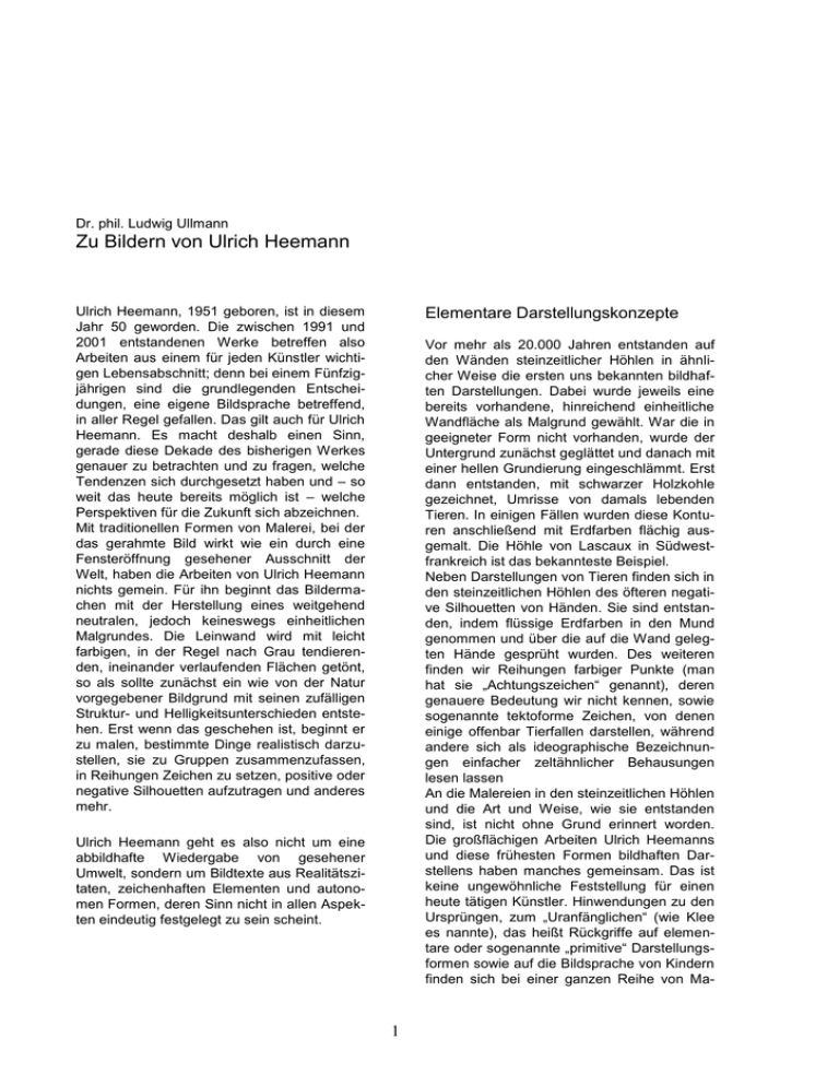 Dr. phil. Ludwig Ullmann Zu Bildern von Ulrich Heemann Ulrich Heemann, 1951 geboren, ist in diesem Jahr 50 geworden. Die zwischen 1991 und 2001 entstandenen Werke betreffen also Arbeiten aus einem für jeden Künstler wichtigen Lebensabschnitt; denn bei einem Fünfzigjährigen sind die grundlegenden Entscheidungen, eine eigene Bildsprache betreffend, in aller Regel gefallen. Das gilt auch für Ulrich Heemann. Es macht deshalb einen Sinn, gerade diese Dekade des bisherigen Werkes genauer zu betrachten und zu fragen, welche Tendenzen sich durchgesetzt haben und – so weit das heute bereits möglich ist – welche Perspektiven für die Zukunft sich abzeichnen. Mit traditionellen Formen von Malerei, bei der das gerahmte Bild wirkt wie ein durch eine Fensteröffnung gesehener Ausschnitt der Welt, haben die Arbeiten von Ulrich Heemann nichts gemein. Für ihn beginnt das Bildermachen mit der Herstellung eines weitgehend neutralen, jedoch keineswegs einheitlichen Malgrundes. Die Leinwand wird mit leicht farbigen, in der Regel nach Grau tendierenden, ineinander verlaufenden Flächen getönt, so als sollte zunächst ein wie von der Natur vorgegebener Bildgrund mit seinen zufälligen Struktur- und Helligkeitsunterschieden entstehen. Erst wenn das geschehen ist, beginnt er zu malen, bestimmte Dinge realistisch darzustellen, sie zu Gruppen zusammenzufassen, in Reihungen Zeichen zu setzen, positive oder negative Silhouetten aufzutragen und anderes mehr. Elementare Darstellungskonzepte Vor mehr als 20.000 Jahren entstanden auf den Wänden steinzeitlicher Höhlen in ähnlicher Weise die ersten uns bekannten bildhaften Darstellungen. Dabei wurde jeweils eine bereits vorhandene, hinreichend einheitliche Wandfläche als Malgrund gewählt. War die in geeigneter Form nicht vorhanden, wurde der Untergrund zunächst geglättet und danach mit einer hellen Grundierung eingeschlämmt. Erst dann entstanden, mit schwarzer Holzkohle gezeichnet, Umrisse von damals lebenden Tieren. In einigen Fällen wurden diese Konturen anschließend mit Erdfarben flächig ausgemalt. Die Höhle von Lascaux in Südwestfrankreich ist das bekannteste Beispiel. Neben Darstellungen von Tieren finden sich in den steinzeitlichen Höhlen des öfteren negative Silhouetten von Händen. Sie sind entstanden, indem flüssige Erdfarben in den Mund genommen und über die auf die Wand gelegten Hände gesprüht wurden. Des weiteren finden wir Reihungen farbiger Punkte (man hat sie „Achtungszeichen“ genannt), deren genauere Bedeutung wir nicht kennen, sowie sogenannte tektoforme Zeichen, von denen einige offenbar Tierfallen darstellen, während andere sich als ideographische Bezeichnungen einfacher zeltähnlicher Behausungen lesen lassen An die Malereien in den steinzeitlichen Höhlen und die Art und Weise, wie sie entstanden sind, ist nicht ohne Grund erinnert worden. Die großflächigen Arbeiten Ulrich Heemanns und diese frühesten Formen bildhaften Darstellens haben manches gemeinsam. Das ist keine ungewöhnliche Feststellung für einen heute tätigen Künstler. Hinwendungen zu den Ursprüngen, zum „Uranfänglichen“ (wie Klee es nannte), das heißt Rückgriffe auf elementare oder sogenannte „primitive“ Darstellungsformen sowie auf die Bildsprache von Kindern finden sich bei einer ganzen Reihe von Ma- Ulrich Heemann geht es also nicht um eine abbildhafte Wiedergabe von gesehener Umwelt, sondern um Bildtexte aus Realitätszitaten, zeichenhaften Elementen und autonomen Formen, deren Sinn nicht in allen Aspekten eindeutig festgelegt zu sein scheint. 1 lern des 20. Jahrhunderts. Es war für Ulrich Heemann deshalb nichts Besonderes, ein Bild zusammen mit seinem damals fünfjährigen Sohn zu malen (im Katalog: RUN TO ESCAPE von 1992, Werkverzeichnis 92-OG-19). Dass Klee und Picasso Ähnliches getan haben, daran wird er dabei wohl kaum gedacht, vielleicht es nicht einmal gewusst haben. Der Rückgriff auf ursprüngliche, elementare oder „primitive“ bildliche Sprechweisen in der Kunst des 20. Jahrhunderts hat sich keineswegs zufällig ergeben. Seit der Renaissance und der Entdeckung der Gesetze der Perspektive waren in der abendländischen Malerei realistische Formen bildhafter Darstellung üblich. Die Bildfläche wurde zur Bildbühne, und Malen bedeutete die realistische Wiedergabe einer erfundenen Szenerie in der Form einer „Bilddichtung“ oder eine direkte Abbildung von Wirklichkeit. Diese Darstellungsformen erreichten Ende des 19. Jahrhunderts mit den in den Farben und Schatten des natürlichen Lichtes gemalten Landschaften der Impressionisten einen Endpunkt möglicher Entwicklung und schienen damit ausgeschöpft und verbraucht. Gleichzeitig wurde die Fotografie für den realistisch malenden Künstler fortschreitend mehr zu einer entmutigenden Konkurrenz. Die Bildform Porträt verlor die Malerei nahezu völlig an die Fotografie. Warum noch, stellte sich für den Künstler als Frage, detailgenau und zeitaufwendig realistisch eine Landschaft malen, wenn durch die farbige Fotografie und inzwischen auch mittels elektronischer Techniken Vergleichbares durch einen bloßen Knopfdruck zu erreichen war? Die meisten Künstler unserer Zeit wandten sich deshalb Darstellungsformen oder bildlichen Sprechweisen zu, die den Bilder produzierenden fotografischen und elektronischen Techniken nicht zugänglich waren. Sie wählten entsprechend ihren Möglichkeiten und ihrem Temperament expressive Übersteigerungen, surreale Verfremdungen, ideographische Reduktionen, formale Analysen und Exerzitien sowie die verschiedenen Formen abstrakten Malens... Das bedeutet, einen einheitlichen Stil, wie das in früheren Epochen der Fall war, gab es damit nicht mehr. „Die Maler leben nicht mehr in einer Tradition“, äußerte Picasso dazu, „und so muss jeder von uns sich seine Ausdrucksmöglichkeiten neu erschaffen. Jeder moderne Maler hat das vollkommene Recht, seine Sprache von A bis Z zu erfinden.“ Hinzu kommt, es gibt heute für einen Künstler auch hinsic