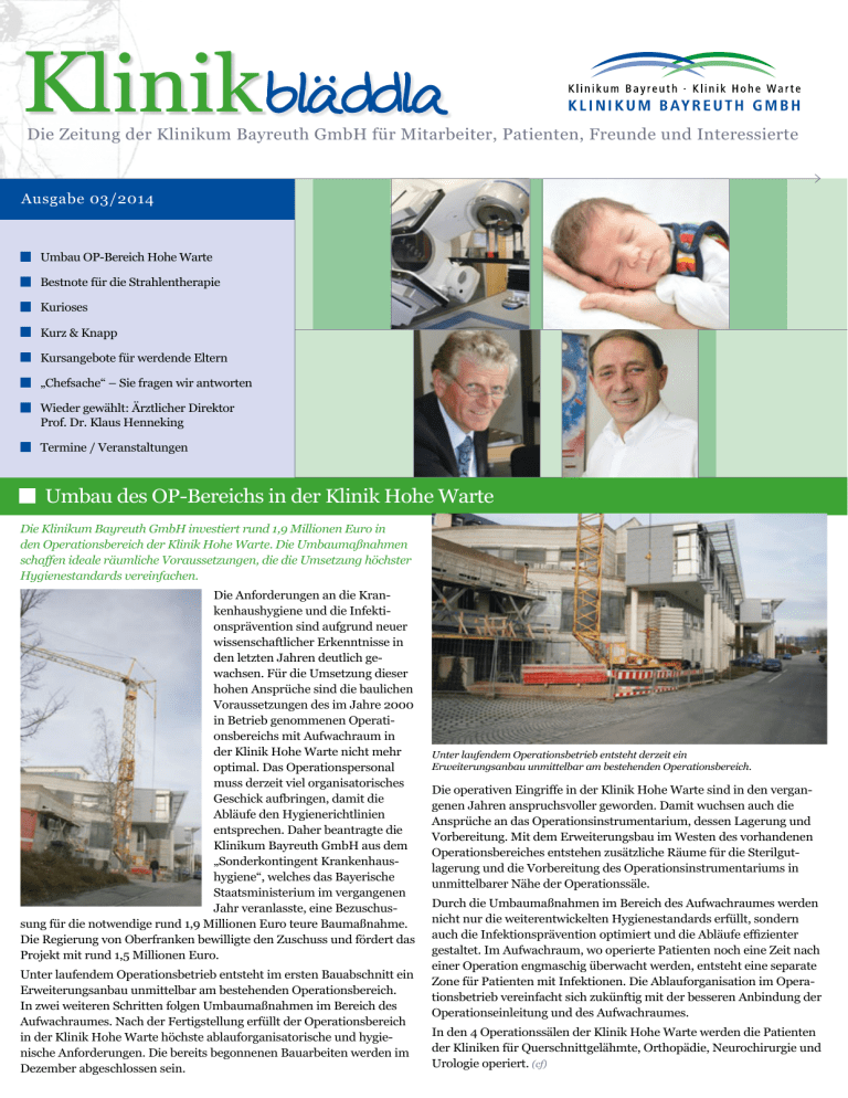Klinik Die Zeitung der Klinikum Bayreuth GmbH für Mitarbeiter, Patienten, Freunde und Interessierte Ausgabe 03/2014 Umbau OP-Bereich Hohe Warte Bestnote für die Strahlentherapie Kurioses Kurz & Knapp Kursangebote für werdende Eltern „Chefsache“ – Sie fragen wir antworten Wieder gewählt: Ärztlicher Direktor Prof. Dr. Klaus Henneking Termine / Veranstaltungen Umbau des OP-Bereichs in der Klinik Hohe Warte Die Klinikum Bayreuth GmbH investiert rund 1,9 Millionen Euro in den Operationsbereich der Klinik Hohe Warte. Die Umbaumaßnahmen schaffen ideale räumliche Voraussetzungen, die die Umsetzung höchster Hygienestandards vereinfachen. Die Anforderungen an die Krankenhaushygiene und die Infektionsprävention sind aufgrund neuer wissenschaftlicher Erkenntnisse in den letzten Jahren deutlich gewachsen. Für die Umsetzung dieser hohen Ansprüche sind die baulichen Voraussetzungen des im Jahre 2000 in Betrieb genommenen Operationsbereichs mit Aufwachraum in der Klinik Hohe Warte nicht mehr optimal. Das Operationspersonal muss derzeit viel organisatorisches Geschick aufbringen, damit die Abläufe den Hygienerichtlinien entsprechen. Daher beantragte die Klinikum Bayreuth GmbH aus dem „Sonderkontingent Krankenhaushygiene“, welches das Bayerische Staatsministerium im vergangenen Jahr veranlasste, eine Bezuschussung für die notwendige rund 1,9 Millionen Euro teure Baumaßnahme. Die Regierung von Oberfranken bewilligte den Zuschuss und fördert das Projekt mit rund 1,5 Millionen Euro. Unter laufendem Operationsbetrieb entsteht im ersten Bauabschnitt ein Erweiterungsanbau unmittelbar am bestehenden Operationsbereich. In zwei weiteren Schritten folgen Umbaumaßnahmen im Bereich des Aufwachraumes. Nach der Fertigstellung erfüllt der Operationsbereich in der Klinik Hohe Warte höchste ablauforganisatorische und hygienische Anforderungen. Die bereits begonnenen Bauarbeiten werden im Dezember abgeschlossen sein. Unter laufendem Operationsbetrieb entsteht derzeit ein Erweiterungsanbau unmittelbar am bestehenden Operationsbereich. Die operativen Eingriffe in der Klinik Hohe Warte sind in den vergangenen Jahren anspruchsvoller geworden. Damit wuchsen auch die Ansprüche an das Operationsinstrumentarium, dessen Lagerung und Vorbereitung. Mit dem Erweiterungsbau im Westen des vorhandenen Operationsbereiches entstehen zusätzliche Räume für die Sterilgutlagerung und die Vorbereitung des Operationsinstrumentariums in unmittelbarer Nähe der Operationssäle. Durch die Umbaumaßnahmen im Bereich des Aufwachraumes werden nicht nur die weiterentwickelten Hygienestandards erfüllt, sondern auch die Infektionsprävention optimiert und die Abläufe effizienter gestaltet. Im Aufwachraum, wo operierte Patienten noch eine Zeit nach einer Operation engmaschig überwacht werden, entsteht eine separate Zone für Patienten mit Infektionen. Die Ablauforganisation im Operationsbetrieb vereinfacht sich zukünftig mit der besseren Anbindung der Operationseinleitung und des Aufwachraumes. In den 4 Operationssälen der Klinik Hohe Warte werden die Patienten der Kliniken für Querschnittgelähmte, Orthopädie, Neurochirurgie und Urologie operiert. (cf) 2 Klinik Bestnote für die Strahlentherapie Strahlenanwendungen im Klinikum Bayreuth – Überprüfung mit Note 1 bestanden Die Verwendung von ionisierenden Strahlen rettet in der Krebstherapie Leben – kann aber ein solches bei unsachgemäßer Handhabung auch gefährden. Daher erfordert der Umgang mit derartigen Therapien ein besonderes Maß an Vorsicht und regelmäßige Prüfungen zur Qualitätssicherung. Im Klinikum Bayreuth stand diese Überprüfung nun an. Das Ergebnis: Wie schon vor zwei Jahren mit Bestnote bestanden. „Wir sehen das als Belohnung und Beweis unserer konstant und mit hohem Engagement aller Mitarbeiter erzielten besonders hohen Qualität“, erklären die beiden Chefärzte der Klinik für Strahlentherapie im Klinikum Bayreuth, Prof. Dr. Ludwig Keilholz und Privatdozent Dr. Jochen Willner. Das standardisierte Begutachtungssystem der Landesärztekammer sieht eine Überprüfung aller Strahlentherapieeinrichtungen im Freistaat im Abstand von zwei Jahren vor. Vor Ort prüft dabei eine Kommission der Bayerischen Landesärztekammer, die mit anerkannten Experten aus renommierten Universitätskliniken besetzt ist, einen ganzen Tag lang nicht nur die medizinischen Geräte. Sie beurteilt auch die Qualität der Arbeit von Ärzten, Physikern und Medizinischtechnischen Radiologieassistenten, die mit diesen Geräten vor Ort geleistet wird. Sie soll sicherstellen, dass bei der Anwendung radioaktiver Stoffe und ionisierender Strahlung bei Patienten „die ErforDie Hochpräzesions-Radiotherapieanlage im Klinidernisse der medizinischen Wissenschaft beachtet kum Bayreuth bietet den Patienten ein Höchstmaß werden und die angewendeten Verfahren und an Genauigkeit bei der Bestrahlung. eingesetzten Anlagen zur Erzeugung ionisierender Strahlen, Bestrahlungsvorrichtungen, sonstige Geräte oder Ausrüstungen den nach dem Stand von Wissenschaft und Technik jeweils notwendigen Qualitätsstandards entsprechen“ (Auszug aus § 83 der Strahlenschutzverordung). Das heißt nicht nur, dass die Strahlenbelastung des Patienten stets so gering wie möglich gehalten werden soll, sondern dass der Einsatz der Bestrahlung in fachlich und wissenschaftlich ausgezeichneter Weise erfolgt. Sowohl in der Klinik für Strahlentherapie im Klinikum Bayreuth als auch in der Zweigstelle im Kulmbacher Klinikum bescheinigte das Gremium dem medizinischen und medizin-physikalischen Team tadellose Arbeit und vergab in allen Bereichen die Bestnote 1. Die Bestnote wurde im Tätigkeitsbericht 2012/13 der Bayerischen Landesärztekammer bei 66 zu prüfenden Institutionen nur siebenmal vergeben. (xp) Kurioses Ein weiter Weg: … da hat doch ein Spaßvogel seinen subjektiven Empfindungen Luft gemacht. Mehr Informationen auch unter: www.klinikum-bayreuth.de Kurz & Knapp Kosmetikkurse für Krebspatienten Häu