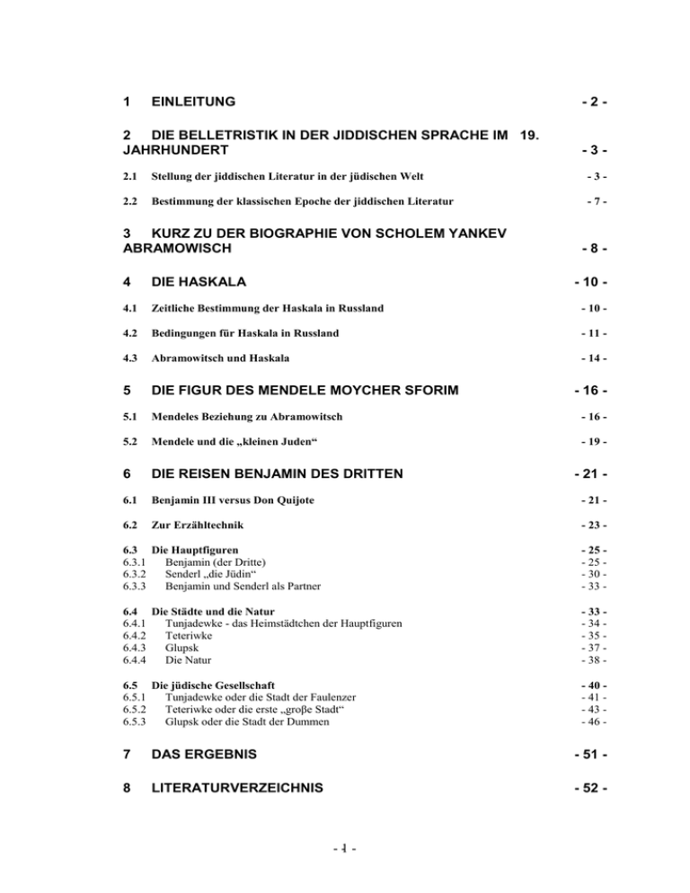 1 EINLEITUNG -2- 2 DIE BELLETRISTIK IN DER JIDDISCHEN SPRACHE IM 19. JAHRHUNDERT -3- 2.1 Stellung der jiddischen Literatur in der jüdischen Welt -3- 2.2 Bestimmung der klassischen Epoche der jiddischen Literatur -7- 3 KURZ ZU DER BIOGRAPHIE VON SCHOLEM YANKEV ABRAMOWISCH -8- 4 DIE HASKALA - 10 - 4.1 Zeitliche Bestimmung der Haskala in Russland - 10 - 4.2 Bedingungen für Haskala in Russland - 11 - 4.3 Abramowitsch und Haskala - 14 - 5 DIE FIGUR DES MENDELE MOYCHER SFORIM 5.1 Mendeles Beziehung zu Abramowitsch - 16 - 5.2 Mendele und die „kleinen Juden“ - 19 - 6 DIE REISEN BENJAMIN DES DRITTEN 6.1 Benjamin III versus Don Quijote - 21 - 6.2 Zur Erzähltechnik - 23 - - 16 - - 21 - 6.3 Die Hauptfiguren 6.3.1 Benjamin (der Dritte) 6.3.2 Senderl „die Jüdin“ 6.3.3 Benjamin und Senderl als Partner - 25 - 25 - 30 - 33 - 6.4 Die Städte und die Natur 6.4.1 Tunjadewke - das Heimstädtchen der Hauptfiguren 6.4.2 Teteriwke 6.4.3 Glupsk 6.4.4 Die Natur - 33 - 34 - 35 - 37 - 38 - 6.5 Die jüdische Gesellschaft 6.5.1 Tunjadewke oder die Stadt der Faulenzer 6.5.2 Teteriwke oder die erste „groβe Stadt“ 6.5.3 Glupsk oder die Stadt der Dummen - 40 - 41 - 43 - 46 - 7 DAS ERGEBNIS - 51 - 8 LITERATURVERZEICHNIS - 52 - - -1 1 1 Einleitung In meiner Arbeit möchte ich mich den im Jiddischen geschriebenen Werken eines der wichtigsten Autoren der klassischen Periode der jiddischen Literatur des 19. Jahrhunderts, Scholem Yankev Abramowitsch widmen. Ich werde mich auf seine satirischen Werke konzentrieren, vor allem dann auf das Buch “Kitzur masoes Benjamin ha-schlischi“ - Die Reisen Benjamin des Dritten. Im ersten Teil, der aus Kapiteln 2.1 und 2.2 besteht, werde ich mich allgemein der in der jiddischen Sprache geschriebenen Belletrie widmen. Zuerst möchte ich im Kapitel 2.1 ihre Stellung in der jüdischen Welt bestimmen. Diese war nämlich von Anfang an problematisch und soll also in einem selbstständigen Abteil behandelt werden. Im Kapitel 2.2 werde ich mich dann näher der Epoche widmen, in der Abramowitsch selbst geschaffen hat, nämlich der klassischen Periode der jiddischen Literatur. Das dritte Kapitel wird der Biographie Abramowitschs gewidmet. Die Kapiteln 4.1 bis 4.3 konzentrieren sich auf die Erklärung der jüdischen Aufklärung - Haskala. Abramowitsch selbst war Anhänger dieser Bewegung und seine Anstellung ist auch in seinen Werken klar sichtbar. Ich halte es also für wichtig, die Haskala näher zeitlich zu bestimmen (Kapitel 4.1), die Bedingungen ihrer Existenz im Russland, dem Land wo Abramowitsch geboren wurde und das er in seinen Werken widerspiegelt, zu behandeln (Kapitel 4.2) und endlich dann die Stellung des Autors zu dieser Bewegung zu beschreiben (Kapitel 4.3). Die Kapiteln 5 und 6 behandeln das Buch Die Reisen Benjamin des Dritten. Der Teil 5 ist der Figur des Erzählers Mendele Moycher Sforim gewidmet, die im Werk Abramowitschs eine sehr wichtige Rolle spielt. Im Kapitel 5.1 konzentriere ich mich auf die Beziehung dieses fiktiven Erzählers zu der von Abramowitsch geschaffen jüdischen Welt und seiner anderen Bewohnern. Das Kapitel 5.2 beschäftigt sich mit der Beziehung des Autoren selbst zu dieser Gestallt. Im Teil 6 widme ich mich der Analyse des Buches Die Reisen Benjamin des Dritten, dessen Hauptfiguren und ihrer Beziehungen zueinander, zu den Nebengestallten und der sie ungebenden Welt. - -2 2 2 Die Belletristik in der jiddischen Sprache im 19. Jahrhundert 2.1 Stellung der jiddischen Literatur in der jüdischen Welt Die Belletristik in der jiddischen Sprache war zur Zeit Abramowitschs eine sehr komplizierte und gar nicht übliche Erscheinung. Abramowitsch war in den 60er Jahren eigentlich der erste Autor, der sich mit dem Schreiben in dieser Sprache der “kleinen Juden“1 beschäftigt hat und deshalb der “Urvater der jiddischen Literatur“ genannt wird. Diese Bezeichnung stammt von einem anderen bekannten jiddischen Autor, Scholem Aleichem, und hängt einerseits mit dem groβen Respekt, den der eine Generation jüngerer Aleichem zu Abramowitsch fühlte zusammen, anderseits wird diese zeitliche Verschiebung2 von manchen Kritiken auch für eine Art Auβerachtlassung gehalten. Zum Beispiel Ken Frieden schreibt in seiner Arbeit Classic Yiddish Fiction: „Abramowitsch “Urvater“ zu nennen bedeutete für Scholem Aleichem eine Relegation seines Vorläufers und zugleich auch eine Bestätigung seiner eigenen würdigen Ahnentafel.“3 Obgleich Abramowitsch zu den Klassikern der jiddischen Literatur gezählt wird und zusammen mit den oben erwähnten Autoren Scholem Aleichem und Yizchok Leybusch Peretz die erste konsistente Generation der Autoren der jiddischen Belletrie darstellt, war er natürlich nicht der erste Schriftsteller, der in dieser Sprache geschrieben hat. Die ostjiddische Literatur wurde zur Zeit Abramowitschs schon jahrzehntelang geschrieben. Für die gebildeten Juden war sie aber von so gut wie keiner Bedeutung, denn sie wurde vor allem für die Ungebildeten geschaffen. „Bei denen, die dazu fähig waren, die Thora im Hebräischen zu lernen, war es für eine Sünde gehalten, sich mit solcher (verstehe jiddischer) Literatur zu beschäftigen.“4 1 Siehe Abramowitsch, S. Y.: Dos kleyne mentschele. Scholem Aleichem wurde in demselben Jahr wie Abramowitschs Sohn Meir geboren und der Name “Urvater“ kann also auch einen pejorativen Beiklang haben. 3 Frieden, Ken: Classic Yiddish Fiction. New York, 1995. S.31. Meine Übersetzung. 2 - -3 3 In dieser Haltung, die die Mehrheit der Juden vertrat, lag das gröβte Problem der jiddischen Literatur. Die einzige Literatur, die für die Rabbiner akzeptabel war, waren die religiösen Schriften, die nur in der heiligen Sprache, im Hebräischen, geschrieben werden konnten. Die Belletristik haben sie nicht gebraucht und vor allem nicht gewollt, denn alles, was ein Jude wissen musste und sollte, konnte er in Thora, Talmud und Responsa finden. Jiddische Literatur war also nicht nur etwas niedriges, was für die Niedr