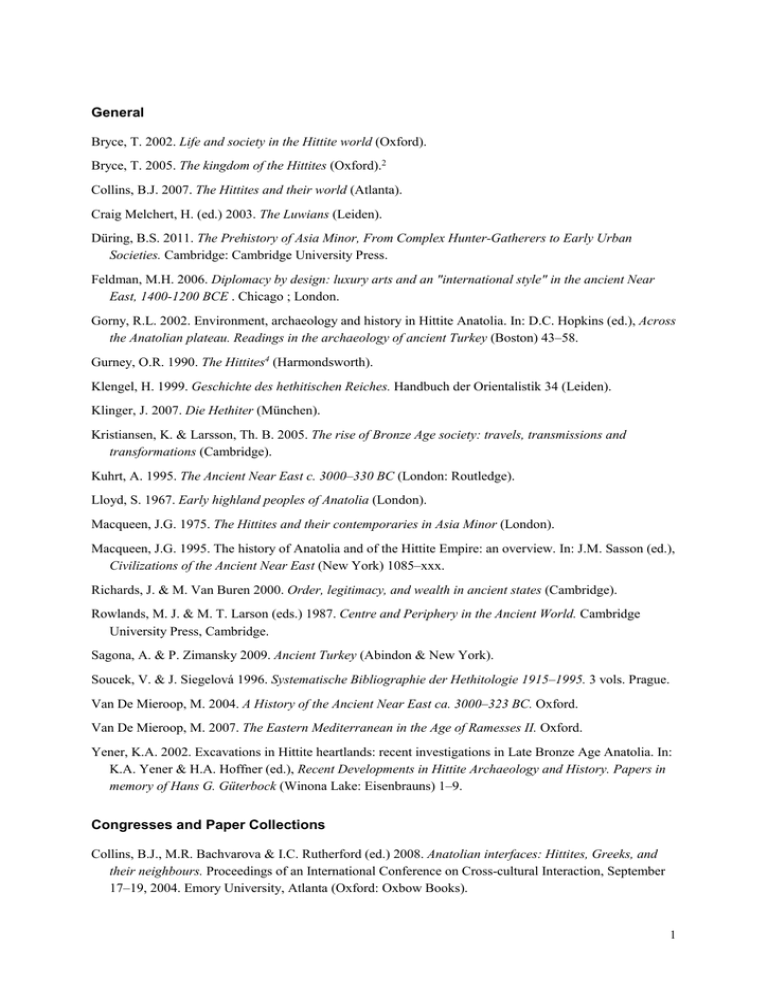 General Bryce, T. 2002. Life and society in the Hittite world (Oxford). Bryce, T. 2005. The kingdom of the Hittites (Oxford).2 Collins, B.J. 2007. The Hittites and their world (Atlanta). Craig Melchert, H. (ed.) 2003. The Luwians (Leiden). Düring, B.S. 2011. The Prehistory of Asia Minor, From Complex Hunter-Gatherers to Early Urban Societies. Cambridge: Cambridge University Press. Feldman, M.H. 2006. Diplomacy by design: luxury arts and an "international style" in the ancient Near East, 1400-1200 BCE . Chicago ; London. Gorny, R.L. 2002. Environment, archaeology and history in Hittite Anatolia. In: D.C. Hopkins (ed.), Across the Anatolian plateau. Readings in the archaeology of ancient Turkey (Boston) 43–58. Gurney, O.R. 1990. The Hittites4 (Harmondsworth). Klengel, H. 1999. Geschichte des hethitischen Reiches. Handbuch der Orientalistik 34 (Leiden). Klinger, J. 2007. Die Hethiter (München). Kristiansen, K. & Larsson, Th. B. 2005. The rise of Bronze Age society: travels, transmissions and transformations (Cambridge). Kuhrt, A. 1995. The Ancient Near East c. 3000–330 BC (London: Routledge). Lloyd, S. 1967. Early highland peoples of Anatolia (London). Macqueen, J.G. 1975. The Hittites and their contemporaries in Asia Minor (London). Macqueen, J.G. 1995. The history of Anatolia and of the Hittite Empire: an overview. In: J.M. Sasson (ed.), Civilizations of the Ancient Near East (New York) 1085–xxx. Richards, J. & M. Van Buren 2000. Order, legitimacy, and wealth in ancient states (Cambridge). Rowlands, M. J. & M. T. Larson (eds.) 1987. Centre and Periphery in the Ancient World. Cambridge University Press, Cambridge. Sagona, A. & P. Zimansky 2009. Ancient Turkey (Abindon & New York). Soucek, V. & J. Siegelová 1996. Systematische Bibliographie der Hethitologie 1915–1995. 3 vols. Prague. Van De Mieroop, M. 2004. A History of the Ancient Near East ca. 3000–323 BC. Oxford. Van De Mieroop, M. 2007. The Eastern Mediterranean in the Age of Ramesses II. Oxford. Yener, K.A. 2002. Excavations in Hittite heartlands: recent investigations in Late Bronze Age Anatolia. In: K.A. Yener & H.A. Hoffner (ed.), Recent Developments in Hittite Archaeology and History. Papers in memory of Hans G. Güterbock (Winona Lake: Eisenbrauns) 1–9. Congresses and Paper Collections Collins, B.J., M.R. Bachvarova & I.C. Rutherford (ed.) 2008. Anatolian interfaces: Hittites, Greeks, and their neighbours. Proceedings of an International Conference on Cross-cultural Interaction, September 17–19, 2004. Emory University, Atlanta (Oxford: Oxbow Books). 1 Fischer, B., H. Genz, É. Jean & K. Köroğlu (eds.) 2003. Identifying changes: The transition from Bronze to Iron Ages in Anatolia and its neighbouring regions. Proceedings of the international workshop Istanbul, November 8-9, 2002 (Istanbul). Hopkins, D.C. (ed.) 2002. Across the Anatolian Plateau. Readings in the archaeology of ancient Turkey (Boston). Jean, É., A.M. Dinçol & S. Durugönül (ed.), La Cilicie: espaces et pouvoirs locaux (2e millénaire av. J.-C. - 4e siècle ap. J.-C.). Actes de la table ronde internationale d'Istanbul, 2-5 novembre 1999 (Paris). Mielke, D.P., U.-D. Schoop & J. Seeher (ed.) 2006. Strukturierung und Datierung in der hethitischen Archäologie. Voraussetzungen – Probleme – Neue Ansätze. Structuring and Dating in Hittite Archaeology. Requirements – Problems – New Approaches. Byzas 4 (Istanbul). Wilhelm, G. (ed.) 2008. Hattuša-Boğazköy. Das Hethiterreich im Spannungsfeld des Alten Orients. Colloquien der Deutschen Orient-Gesellschaft 6 (Harrassowitz Verlag: Wiesbaden). Yener, K.A. & H.A. Hoffner (eds) 2002. Recent Developments in Hittite Archaeology and History. Papers in memory of Hans G. Güterbock (Winona Lake: Eisenbrauns). Early Bronze Age Çevik, Ö. 2007. The emergence of different social systems in Early Bronze Age Anatolia: urbanization versus centralization, Anatolian Studies 57, 131– Efe, T. 2002. The interaction between cultural/political entities and metalworking in western Anatolia during the Chalcolithic and Early Bronze Ages. In: Ü. Yalçın (ed.), Anatolian Metal II (Bochum) 49– 65. Efe, T. 2003. Pottery distribution within the Early Bronze Age of Western Anatolia and its implications upon cultural, political, (and ethnic?) entities. In: M. Özbaşaran, O. Tanındı & A. Boratav (ed.), Archaeological essays in honour of Homo Amatus: Güven Arsebük için armağan yazılar (Istanbul) 87– 103. Efe, T. 2007. The theories of the ‘Great Caravan Route’ between Cilicia and Troy: the Early Bronze Age III period in inland western Anatolia, Anatolian Studies 57, 47–64. Eslick, Chr. 1988. Hacılar to Karataş. Social organization in southwestern Anatolia. Mediterranean Archaeology 1, 10–40. Marro, C. & H. Hauptmann (ed.) 2000. Chronologies des pays du Caucase et de l’Euphrate aux IVe – IIIe millenaires. Varia Anatolica XI (Paris). Matthews, R. 2007. An arena for cultural contact: Paphlagonia (north-central Turkey) through prehistory. Anatolian Studies 57, 25–34. Rahmstorf, L. 2006. Zur Ausbreitung vorderasiatischer Innovationen in die frühbronzezeitliche Ägäis. Praehistorische Zeitschrift 81.1, 49–96. Şahoğlu, V. 2005. The Anatolian Trade Network and the Izmir region during the Early Bronze Age. Oxford Journal of Archaeology 24, 339–361. Yakar, J. 1985. The later prehistory of Anatolia. The Late Chalcolithic and Early Bronze Age (Oxford). Yakar, J. 2002. East Anatolian metallurgy in the fourth and third millennia BC: some remarks. In: Ü. Yalçın (ed.), Anatolian Metal II (Bochum) 15–25. 2 Zimmermann, Th. 2005. Perfumes and Policies - A ‘Syrian Bottle’ from Kinet Höyük and Anatolian Trade Patterns in the Advanced Third Millenium BC. Anatolica 31, 161–169. Assyrian Colony Period Dercksen, J.G. 1996. The Old Assyrian copper trade in Anatolia (Leiden). Dercksen, J.G. (ed.) 2004. Assyria and beyond. Studies presented to Mogens Trolle Larsen (Leiden). Dercksen, Jan Gerrit (ed.) 200