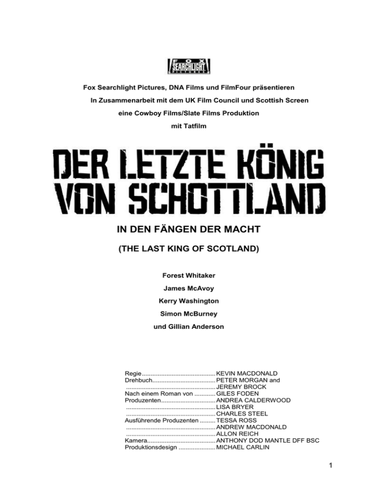Fox Searchlight Pictures, DNA Films und FilmFour präsentieren In Zusammenarbeit mit dem UK Film Council und Scottish Screen eine Cowboy Films/Slate Films Produktion mit Tatfilm IN DEN FÄNGEN DER MACHT (THE LAST KING OF SCOTLAND) Forest Whitaker James McAvoy Kerry Washington Simon McBurney und Gillian Anderson Regie .......................................... KEVIN MACDONALD Drehbuch.................................... PETER MORGAN and ................................................... JEREMY BROCK Nach einem Roman von ............ GILES FODEN Produzenten ............................... ANDREA CALDERWOOD ................................................... LISA BRYER ................................................... CHARLES STEEL Ausführende Produzenten ......... TESSA ROSS ................................................... ANDREW MACDONALD ................................................... ALLON REICH Kamera....................................... ANTHONY DOD MANTLE DFF BSC Produktionsdesign ..................... MICHAEL CARLIN 1 Schnitt ........................................ JUSTINE WRIGHT Line Producer ............................. ANDREW WOOD Musik .......................................... ALEX HEFFES Filmlänge ca. 123 Minuten 2 DER LETZTE KÖNIG VON SCHOTTLAND Kurzinhalt: Der junge schottische Arzt Nicholas Garrigan (James McAvoy) ist in Uganda am Ziel seiner Wünsche angelangt: Eine fremde Kultur und die Möglichkeit, das Gesundheitssystem mit aufzubauen, wecken seine Abenteuerlust. Unerwartet wird er zu einem Verkehrsunfall gerufen, in den der Staatspräsident Idi Amin (Forest Whitaker) verwickelt ist. Schnell steigt er zu dessen Leibarzt auf und gehört bald zum Kreis der engsten Vertrauten. Verwöhnt und vom Luxus berauscht, übersieht Garrigan zunächst die Gräueltaten, die um ihn herum geschehen. Als er dann doch endlich Stellung bezieht, ist es beinahe schon zu spät. Und obendrein wendet der Diktator sich gegen seinen einstigen Schützling ... Pressenotiz: Die Verfilmung des preisgekrönten Romans THE LAST KING OF SCOTLAND von Giles Foden bietet einen tiefen Einblick in die Innenwelt einer Diktatur. Forest Whitakers brillante Darstellung des Idi Amin liefert ein differenziertes Porträt der Verführbarkeit des Menschen durch die Macht und nimmt das Publikum mit auf eine spannungsgeladene Reise in ein Land am Rande des Untergangs. DER LETZTE KÖNIG VON SCHOTTLAND ist eine ebenso lehrreiche wie dramatische „Geschichtsstunde“, für die Regisseur Kevin Macdonald („Ein Tag im September“) und sein vorzüglicher Kameramann Anthony Dod Mantle („Dogville“) vor Ort in Uganda die perfekten Bilder gefunden haben. Über die Produktion „Ich selbst halte mich jedenfalls für den mächtigsten Mann der Welt“ Idi Amin Eigentlich sollte es ein wildes Abenteuer in einem abgelegenen Land werden, aber den naiven jungen Arzt, der 1970 auf der Suche nach Spaß, Sonnenschein und beruflicher Betätigung in Uganda eintrifft, wird seine Reise in den dunkelsten Abgrund der Welt führen: in die menschliche Seele. Darum geht es in DER LETZTE KÖNIG VON SCHOTTLAND, einem kraftvollen Thriller, der das Uganda unter der wahnsinnigen Diktatur Idi Amins für die Leinwand wiederauferstehen lässt. In dieser 3 immer noch hochaktuellen Mixtur aus Fakt und Fiktion liefert Forest Whitaker als Amin eine wahre Tour de Force ab. Der Film zeichnet dabei zwei unvergessliche Porträts: Auf der einen Seite einen charismatischen, aber psychopathischen Anführer, der sein Land ins Verderben stürzte, und auf der anderen Seite einen Zeitzeugen, der erst zum Ende den Mut findet, für seine Überzeugungen einzustehen. Die Geschichte beginnt mit dem gutaussehenden schottischen Arzt Nicholas Garrigan (James McAvoy), der sich frisch von der Universität nach Uganda aufmacht und hofft, dort jede Menge aufregende und romantische Dinge zu erleben und einem Land zu helfen, das seine medizinische Fachkenntnis bitter nötig hat. Schon kurz nach seiner Ankunft wird er zu einem bizarren Unfall gerufen: Idi Amin, gerade mächtigster Mann im Staat geworden, hat eine Kuh mit seinem Maserati überfahren. Amin ist beeindruckt von der Forschheit, mit der Garrigan die chaotische Situation unter Kontrolle bringt. Auch dank seiner Besessenheit von schottischer Geschichte und Kultur schließt Amin Garrigan schnell ins Herz und bietet ihm die Stelle seines persönlichen Leibarztes an. Ein solch unglaubliches Angebot kann der junge Schotte gar nicht ablehnen – und damit beginnt seine Reise ins Innerste eines der grausamsten Terrorregimes Afrikas. Erst ist Garrigan nur von Amins berühmtem Charme und dessen ehrgeizigen Plänen für Uganda begeistert – von dessen Leidenschaften für schnelle Autos, schöne Frauen und glamouröse Partys ganz zu schweigen. Doch mit der Zeit strebt auch Garrigan nach immer mehr Macht. Er wird der Vertraute und die rechte Hand des Diktators, was ihn zum Zeugen schrecklicher Ereignisse macht – Entführungen, Hinrichtungen und weitere unsägliche Grausamkeiten, an denen er womöglich eine Mitschuld trägt. Umgeben von Amins mörderischem Größenwahn verliert Garrigan beinahe seine Seele. Als er endlich versucht, dem Irrsinn ein Ende zu bereiten, findet er sich in einem verzweifelten Überlebenskampf wieder. Der hochgelobte Dokumentarfilmer Kevin Macdonald (TOUCHING THE VOID („Sturz ins Leere“, 2003), ONE DAY IN SEPTEMBER („Ein Tag im September“, 1999)) führte Regie bei DER LETZTE KÖNIG VON SCHOTTLAND, der Verfilmung des gleichnamigen, preisgekrönten Romans von Giles Foden, den Peter Morgan und Jeremy Brock für die Leinwand adaptierten. Der Film ist mit Forest Whitaker, James McAvoy, Kerry Washington, Simon Burney und Gillian Anderson hochkarätig besetzt 4 und wurde von Andrea Calderwood (THE CLAIM („Das Reich und die Herrlichkeit“, 2000)) von Slate Films und von Lisa Bryer und Charles Steel von Cowboy Films (WASP (2003), THE HOLE (2001), GOODBYE CHARLIE BRIGHT (2001)) produzie