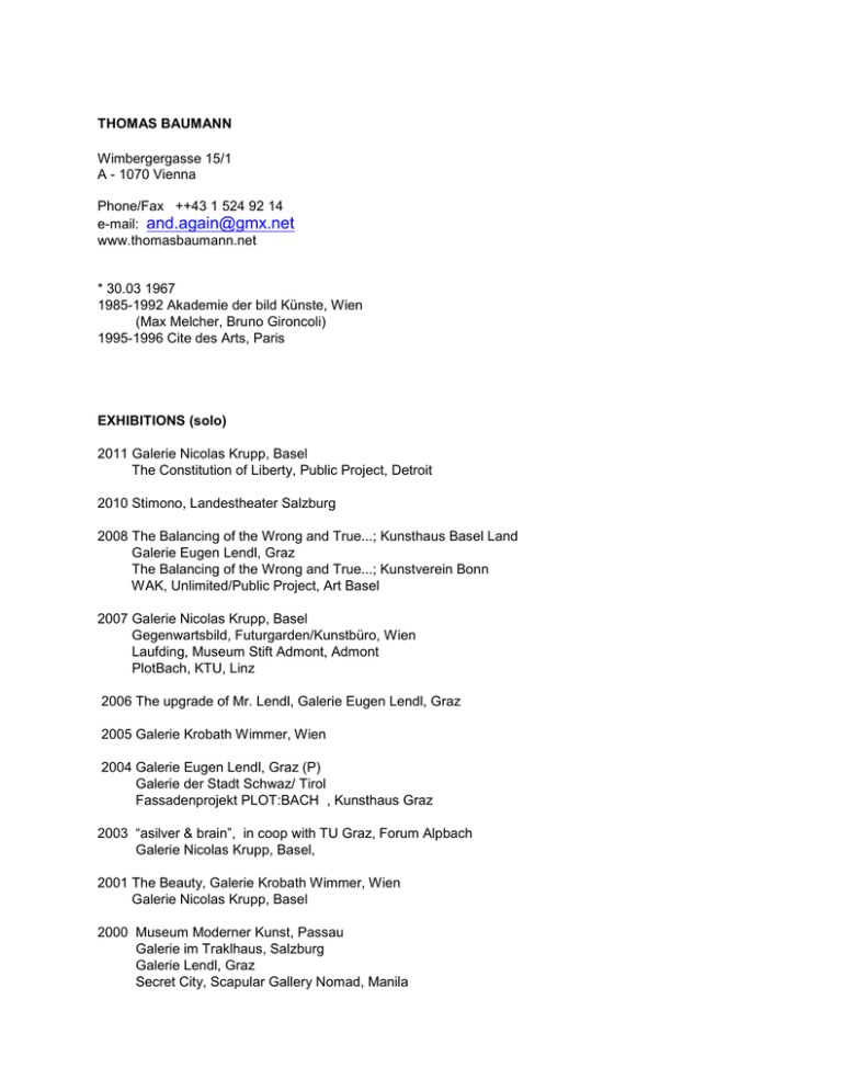 THOMAS BAUMANN Wimbergergasse 15/1 A - 1070 Vienna Phone/Fax ++43 1 524 92 14 e-mail: [email protected] www.thomasbaumann.net * 30.03 1967 1985-1992 Akademie der bild Künste, Wien (Max Melcher, Bruno Gironcoli) 1995-1996 Cite des Arts, Paris EXHIBITIONS (solo) 2011 Galerie Nicolas Krupp, Basel The Constitution of Liberty, Public Project, Detroit 2010 Stimono, Landestheater Salzburg 2008 The Balancing of the Wrong and True...; Kunsthaus Basel Land Galerie Eugen Lendl, Graz The Balancing of the Wrong and True...; Kunstverein Bonn WAK, Unlimited/Public Project, Art Basel 2007 Galerie Nicolas Krupp, Basel Gegenwartsbild, Futurgarden/Kunstbüro, Wien Laufding, Museum Stift Admont, Admont PlotBach, KTU, Linz 2006 The upgrade of Mr. Lendl, Galerie Eugen Lendl, Graz 2005 Galerie Krobath Wimmer, Wien 2004 Galerie Eugen Lendl, Graz (P) Galerie der Stadt Schwaz/ Tirol Fassadenprojekt PLOT:BACH , Kunsthaus Graz 2003 “asilver & brain”, in coop with TU Graz, Forum Alpbach Galerie Nicolas Krupp, Basel, 2001 The Beauty, Galerie Krobath Wimmer, Wien Galerie Nicolas Krupp, Basel 2000 Museum Moderner Kunst, Passau Galerie im Traklhaus, Salzburg Galerie Lendl, Graz Secret City, Scapular Gallery Nomad, Manila 1999 Many PE Many PA, Centre Culturel Francais, Turin Galerie Krobath Wimmer, Wien Mittwochkino 6/99 - Kunsthalle Basel 1998 Kulturzentrum bei den Minoriten, Graz 1997 Salle de bal, Institut Francais de Vienne Muecsarnok, Kunsthalle Budapest Knoll Galeria, Budapest 1996 High Hoch Times Zeiten, Secession Wien 1995 Gallerie Knoll, Wien 1994 Espaces Intervalles Ahar, mit F. Di Giovanni, Domaine de Kerguehennec Galerie Knoll, Wien 1993 E in der Böcklinstrasse, Wien E am Zimmermannplatz, Wien 1992 Kuh und Haus, Palazzo De Marquis, Aquila K.E.I.L.E. Lienfeldergasse, Wien EXHIBITIONS (group) 2011 Roboterträume, Kunsthaus Graz (Darling) You send me..., b9 Galerie, Wien Kinetics, Von Bartha Collection, Basel 2010 Roboterträume,Museum Tinguely, Basel Triennale 1.0, OK Offenes Kulturhaus, Linz Play Admont, Museum Stift Admont Original Funktional, Vienna Art Foundation, Vienna 2009 Best of Austria, Lentos, Linz Rewind / Fast Forward, Neue Galerie, Graz Natur / unvollendete Schöpfung, Museum Stift Admont Ankäufe des Landes Salzburg 2007 – 2009, Salzburg Romantische Maschinen, Georg Kolbe Museum, Berlin Repertorium, Galerie Eugen Lendl, Graz Natur, Galerie im Traklhaus, Salzburg 2008 Hard Rock Walzer, Villa Manin Abstract, Museum Moderner Kunst Kärnten A Lot of Nots, Konzerthaus, Vienna Domestic Appliance, Flowers, London Musee Würth, France Erstein Eisler Preis 2008, BA-CA Kunstforum, Vienna Another Tomorrow, Neue Galerie Graz, Slought Foundation, Philadelphia 2007 Blickwechsel N°3, Museum Moderner Kunst, Klagenfurt Galerie.Focus Vienna, Kunstraum Innsbruck Dichter Herbst, Sammlung Dichter, Masc Foundation, Wien Hard Rock Walzer, Villa Manin, Italien 2006 Ordnung und Verführung, Haus Konstruktiv, Zürich Totalschaden von Gregor Schneider, Bonner Kunstverein Strip - Bilder in Folge, Kunsthaus Basel Land Genuine Happiness, Kunstbüro, Wien Und es bewegt sich doch...., Kunstmuseum Bochum On the Move, Kunstverein Ludwigsburg Sammlung Dichter, OSEI, Wien „Economy Class“, Österreichische Botschaft und/and Alliance Francaise, Nairobi, Kenia The Plot 2, KTU, Linz A-Happening, Feuerwerk Binder, Mayrhofen, Tirol Trajectory / The Sun on the Wall, Steirischer Herbst / Pavel Haus, Laafeld 2005 Moving Objects, Museum Jean Tinguely, Basel Now`s the Time, Kunsthaus Graz, Medienturm, The Red Thread, Educational Alliance Gallery, New York The Red Thread, Howard House Contemporary, Seattle Geordnete Verhältnisse, Festival der Regionen, Oberösterreich OSEI, Masc Foundation, Wien The Fascination with the Mechanical, Galerie von Bartha, Basel Farbräume, Museum Moderner Kunst, Klagenfurt Strip – Images in Line, Kunstverein Hannover, project space M City, Kunsthaus Graz 16.Edition of Fuori Uso - La Strada, Pescara Napoli Presente – Walking Project, Palazzo Delle Arti, Neapel Strip – Images in Line, Deutscher Künstlerbund, Berlin 2004 Bewegliche Teile, Kunsthaus Graz; Wiener Linien, Wien Museum, Wien Kalvarienberg der Künstler, ORF Zentrum, Graz Short Stories, Galerie Eugen Lendl, Graz 2003 Zugluft, austrian contemporary art at ART Zürich blindprojekt, Museum Stift Admont Zugluft, a selection of Zugluft Zürich at ART Moscow 30 Jahre Traklhaus, Galerie im Traklhaus, Salzburg "21er", Museum des 20.Jhdt, 20er Haus 2002 Persönliche Pläne, Kunsthalle Basel Irreal Transparency, Gallery Surge, Tokyo Videochroniques, Marseille Banditmages, Bourges Papers. Mit oder auf Papier, Galerie Lendl, Graz Keine Kleinigkeit, Kunsthalle Basel, Christie`s Zürich 2001 ARCO Madrid Lebt und arbeitet in Wien, Kunsthalle Wien why do we cover our interior walls and windows, Galerie Krobath Wimmer, Wien "ausgeträumt...", Secession Wien Raumkörper, Kunsthalle Basel 2000 New Austrian Spotlight, Universität Marmara, Istanbul Living Inside, TU Wien Masc Foundation, Wien Raumkörper, Kunsthalle Basel Lebt und arbeitet in Wien, Kunsthalle Wien Rosarot, Kunstbüro Wien MAIN BASSE, La Station, Nizza Ankäufe 1998-2000, Galerie im Traklhaus, Salzburg Galerie am Park, Wien NO LIMIT, Masc Foundation, Wien Worldwideweihnacht, Galerie Edition Stalzer, Wien 1999 Event 99, Galerie Yvon Lambert, Paris 26.Grafikwettbewerb Innsbruck, Tiroler Landesmuseum Ferdinandeum Translocations-Open Access, Generali Foundation, Wien Österr. Zeichnung der 90er Jahre, Rupertinum, Galerie im Traklhaus, Salzburg Movcities, Kabelwerk, Wien 1998 TED Gallery, Varna The Century of Artistic Freedom at Helsinki City Art Museum Sincerely Yours, Municipal Gallery, Sofia Estampa, Messe Madrid Junge Kunst vom Stein, Akad. d. bild. Künste, Kupferstichkabinett, Wien Tu Parles / J'ecoute, La Ferme du Buisson, Paris 100 Jahre Secession, Wien You Talk / I Listen, Museum of Fine Arts, Children Research Center, Taipei 1997 From one point to another, Galerie Soardi, ein ehem. At