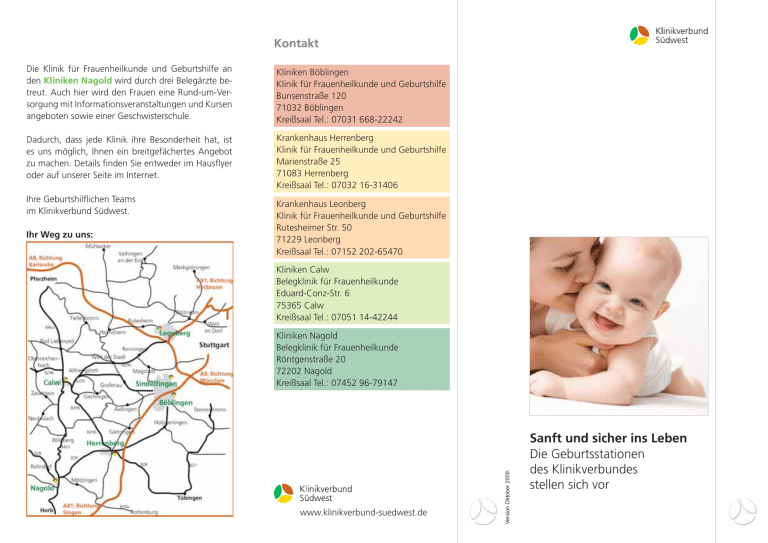 Kontakt Die Klinik für Frauenheilkunde und Geburtshilfe an den Kliniken Nagold wird durch drei Belegärzte betreut. Auch hier wird den Frauen eine Rund-um-Versorgung mit Informationsveranstaltungen und Kursen angeboten sowie einer Geschwisterschule. Kliniken Böblingen Klinik für Frauenheilkunde und Geburtshilfe Bunsenstraße 120 71032 Böblingen Kreißsaal Tel.: 07031 668-22242 Dadurch, dass jede Klinik ihre Besonderheit hat, ist es uns möglich, Ihnen ein breitgefächertes Angebot zu machen. Details finden Sie entweder im Hausflyer oder auf unserer Seite im Internet. Krankenhaus Herrenberg Klinik für Frauenheilkunde und Geburtshilfe Marienstraße 25 71083 Herrenberg Kreißsaal Tel.: 07032 16-31406 Ihr Weg zu uns: Krankenhaus Leonberg Klinik für Frauenheilkunde und Geburtshilfe Rutesheimer Str. 50 71229 Leonberg Kreißsaal Tel.: 07152 202-65470 Kliniken Calw Belegklinik für Frauenheilkunde Eduard-Conz-Str. 6 75365 Calw Kreißsaal Tel.: 07051 14-42244 Kliniken Nagold Belegklinik für Frauenheilkunde Röntgenstraße 20 72202 Nagold Kreißsaal Tel.: 07452 96-79147 www.klinikverbund-suedwest.de Version Oktober 2009. Ihre Geburtshilflichen Teams im Klinikverbund Südwest. Sanft und sicher ins Leben Die Geburtsstationen des Klinikverbundes stellen sich vor Soviel Geborgenheit wie möglich, soviel Sicherheit wie nötig. Wir sind für Sie da. Liebe werdende Eltern, Alle Kliniken für Frauenheilkunde und Geburtshilfe des Verbundes bieten ein umfangreiches Angebot für werdende Eltern und ihr Kind: Das Besondere der Klinik für Frauenheilkunde und Geburtshilfe an den Kliniken Böblingen ist die räumliche Nähe zur Kinderklinik mit Neugeborenen- und Frühgeborenen-Intensivstation. Volle Bereitschaft im 24-Stunden-Schichtdienst ermöglicht schnelles Eingreifen zu jeder Zeit. Heute weiß man, wie wichtig es ist, dass jede Frau so entbinden kann, wie es ihrer persönlichen Einstellung und ihren Bedürfnissen entspricht. So spielt zum Beispiel der Ort, an dem entbunden wird, eine große Rolle; wer das Gefühl hat, gut aufgehoben zu sein, kann besser entspannen und sich auf das bewegende Erlebnis einer Geburt voll und ganz einlassen. Die Wahl der passenden Geburtsabteilung hängt dabei von Ihren individuellen Bedürfnissen ab. Wird auf Ihre Wünsche und Einstellungen Rücksicht genommen, wird Ihr Standpunkt zu Medikamenten, Nahrung oder Betreuung respektiert? Herrschen Unruhe und Hektik oder ist genügend Zeit für das Kennenlernen, für Zärtlichkeit und Miteinander? Es ist das Anliegen aller geburtshilflichen Kliniken des Klinikverbundes Südwest, Frauen Sicherheit zu vermitteln und dabei größtmögliche persönliche Freiheit und Geborgenheit während der Geburt zu gewährleisten. Darüber hinaus haben sich zwei unserer Häuser dem Konzept „Babyfreundliches Krankenhaus“ verschrieben. Dieses von der WHO entwickelte Konzept stellt strenge Anforderungen an seine zertifizierten Häuser; vor allem das Stillen steht im Vordergrund, da es besonders für das Kind viele Vorteile hat. t Optimale Betreuung während Schwangerschaft und Geburt durch individuell abgestimmte Diagnostik und Therapie nach neuesten Erkenntnissen t Alternative Hilfsmittel unter der Geburt, wie Homöopathie, Akupunktur usw. t 24-Stunden-Betreuung durch die Kinderärzte der Kinderklinik Böblingen t Durchgehende Anwesenheit eines Anästhesisten für die Periduralanästhesie t Geburtsvorbereitung mit und ohne Partner t Kreißsaalführungen t Informationsabende zu Schwangerschaft, Geburt und Wochenbett t Rückbildungsgymnastik So bietet jede unserer Geburtsabteilungen andere Schwerpunkte, eine eigene Atmosphäre und Betreuung an. Ein gelungener Start ins Leben trägt viel zur Stressreduzierung auch in den darauf folgenden ersten Lebenswochen bei. Das Storchennest im Krankenhaus Herrenberg ist weit über die Grenzen des Gäus hinaus bekannt. In dieser kleinen, familiären Klinik wird eine besondere Rund-um-Betreuung gepflegt, und man strebt die Zertifizierung zum Babyfreundlichen Krankenhaus an. Außerdem wurde der sogenannte HebammenKreißsaal eingeführt, ein besonderes Betreuungsangebot, das die Lücke zwischen Haus- und Klinikgeburt schließt. Im Krankenhaus Leonberg schätzen Gebärende die komfortable, familiäre und unkomplizierte Betreuung. Durch den hier stationierten Hubschrauber und dem in Böblingen bereitstehenden Transport-Inkubator ist für die Nähe zur Kinderklinik in Böblingen gesorgt; sie gewährleistet die notwendige Sicherheit. Andererseits wird der Wohlfühlfaktor für Mütter großgeschrieben; selbst mit 24-Stunden-Rooming-In sind diese nicht an das Krankenzimmer gefesselt, sondern können zum Essen ins Frühstückzimmer bzw. in den im Grünen liegenden Pavillon gehen. Die Belegklinik für Frauenheilkunde in den Kliniken Calw ist schon seit 2007 als babyfreundliches Krankenhaus zertifiziert und kann daher auf sehr viel Erfahrung zurückgreifen. Alles, was dem sogenannten Bonding, der Bindung zwischen Mutter und Kind nützt, steht an erster Stelle: Zeit, Ruhe, liebevolle Zuwendung. Ein wesentlicher Punkt ist dabei die kompetente Stillberatung. Anforderungen an die Sicherheit werden unter all diesen Gesichtspunkten erfüllt.