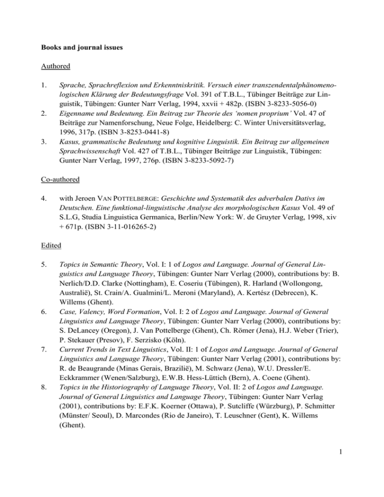 Books and journal issues Authored 1. 2. 3. Sprache, Sprachreflexion und Erkenntniskritik. Versuch einer transzendentalphänomenologischen Klärung der Bedeutungsfrage Vol. 391 of T.B.L., Tübinger Beiträge zur Linguistik, Tübingen: Gunter Narr Verlag, 1994, xxvii + 482p. (ISBN 3-8233-5056-0) Eigenname und Bedeutung. Ein Beitrag zur Theorie des ‘nomen proprium’ Vol. 47 of Beiträge zur Namenforschung, Neue Folge, Heidelberg: C. Winter Universitätsverlag, 1996, 317p. (ISBN 3-8253-0441-8) Kasus, grammatische Bedeutung und kognitive Linguistik. Ein Beitrag zur allgemeinen Sprachwissenschaft Vol. 427 of T.B.L., Tübinger Beiträge zur Linguistik, Tübingen: Gunter Narr Verlag, 1997, 276p. (ISBN 3-8233-5092-7) Co-authored 4. with Jeroen VAN POTTELBERGE: Geschichte und Systematik des adverbalen Dativs im Deutschen. Eine funktional-linguistische Analyse des morphologischen Kasus Vol. 49 of S.L.G, Studia Linguistica Germanica, Berlin/New York: W. de Gruyter Verlag, 1998, xiv + 671p. (ISBN 3-11-016265-2) Edited 5. 6. 7. 8. Topics in Semantic Theory, Vol. I: 1 of Logos and Language. Journal of General Linguistics and Language Theory, Tübingen: Gunter Narr Verlag (2000), contributions by: B. Nerlich/D.D. Clarke (Nottingham), E. Coseriu (Tübingen), R. Harland (Wollongong, Australië), St. Crain/A. Gualmini/L. Meroni (Maryland), A. Kertész (Debrecen), K. Willems (Ghent). Case, Valency, Word Formation, Vol. I: 2 of Logos and Language. Journal of General Linguistics and Language Theory, Tübingen: Gunter Narr Verlag (2000), contributions by: S. DeLancey (Oregon), J. Van Pottelberge (Ghent), Ch. Römer (Jena), H.J. Weber (Trier), P. Stekauer (Presov), F. Serzisko (Köln). Current Trends in Text Linguistics, Vol. II: 1 of Logos and Language. Journal of General Linguistics and Language Theory, Tübingen: Gunter Narr Verlag (2001), contributions by: R. de Beaugrande (Minas Gerais, Brazilië), M. Schwarz (Jena), W.U. Dressler/E. Eckkrammer (Wenen/Salzburg), E.W.B. Hess-Lüttich (Bern), A. Coene (Ghent). Topics in the Historiography of Language Theory, Vol. II: 2 of Logos and Language. Journal of General Linguistics and Language Theory, Tübingen: Gunter Narr Verlag (2001), contributions by: E.F.K. Koerner (Ottawa), P. Sutcliffe (Würzburg), P. Schmitter (Münster/ Seoul), D. Marcondes (Rio de Janeiro), T. Leuschner (Gent), K. Willems (Ghent). 1 9. 10. 11. 12. 13. 14. 15. 16. Translation Studies: Current Theoretical Issues, Vol. III: 1 of Logos and Language. Journal of General Linguistics and Language Theory, Tübingen: Gunter Narr Verlag (2002), contributions by: A. Chestermann (Helsinki), M. Snell-Hornby (Wenen), P. TirkkonenCondit (Savonlinna), J. Munday (Bradford), D. Delabastita (Luik), P. Kussmaul (Mainz), D. Katan (Udine and Trieste). The Realm of Intercultural Communication, Vol. III: 2 of Logos and Language. Journal of General Linguistics and Language Theory, Tübingen: Gunter Narr Verlag (2002), contributions by: R. Scollon (Washington), J. Wilson (Ulster), B. Hatim (Sharjah, UAE), J. Gumperz and J. Cook-Gumperz (Berkeley/Santa Barbara), D. Katan (Trieste), I. Mason (Edinburgh), H. Byrnes (Washington). Language Theory and Neurolinguistics , Vol. IV: 1 of Logos and Language. Journal of General Linguistics and Language Theory, Tübingen: Gunter Narr Verlag (2003), contributions by S. Lamb (Houston), W. P. Lehmann and C. Rinaldi (Austin/Rome), F. Fabbro et al. (Udine), G. Libben et al. Alberta, Can.), J. Van De Walle (Ghent), T. Leuschner (Ghent). Corpus Linguistics and Contrastive Linguistics, Vol. IV: 2 of Logos and Language. Journal of General Linguistics and Language Theory, Tübingen: Gunter Narr Verlag (2003), contributions by W. Teubert (Birmingham), K. J. Saebo (Oslo), G. M. Shreve (Kent, Ohio), P. Broeder (Utrecht), J. Van Pottelberge (Ghent). Iconicity in Language: Theoretical Approaches, Vol. V: 1 of Logos and Language. Journal of General Linguistics and Language Theory, Tübingen: Gunter Narr Verlag (2004), contributions by O. Fischer (Amsterdam), E. Itkonen (Turku), S. Gensini (Napels), L. Waugh et al. (Tucson, Arizona). Syntactic Categories and Parts of Speech, Vol. V: 2 of Logos and Language. Journal of General Linguistics and Language Theory, Tübingen: Gunter Narr Verlag (2004), contributions by R. Hendrick (Chapel Hill), W. Van Langendock (Leuven), J. Anward (Linköping), E. Coseriu (Tübingen), L. De Cuypere (Ghent). New Perspectives on Historical Linguistics, Vol. VI: 1 of Logos and Language. Journal of General Linguistics and Language Theory, Tübingen: Gunter Narr Verlag (2005), contributions by R. Keller (Düsseldorf), T. Nevalainen (Helsinki), A. Bergs (Osnabrück), M. Döring and B. Nerlich (Geesthacht/Nottingham). Discussing Grammaticalization, Vol. VI: 2 of Logos and Language. Journal of General Linguistics and Language Theory, Tübingen: Gunter Narr Verlag (2005), contributions by Brian D. Joseph (Ohio), Silvia Luraghi (Rome), Therese Lindström Tiedemann (Sheffield), Jeroen van Pottelberge (Ghent), Richard D. Janda (Bloomington), U. Gut (Freiburg i.B.). Co-edited 17. with Ann COENE and Jeroen VAN POTTELBERGE: Valenztheorie: Neuere Perspektiven. Studia Germanica Gandensia, 2003, Issue 2. Ghent: Academia Press. Contributions by: K. Willems/ A. Coene/J. Van Pottelberge (Ghent), K. Fischer (London), C. Gansel (Greifswald), W. Bondzio (Berlin), W. Thielemann (Berlin). 2 18. with Ludovic DE CUYPERE: Naturalness and Iconicity in Language. (Iconicity in Language and Literature, Vol. 7). Amsterdam:Philadelphia: J. Benjamins (forthcoming: 2008). Chapters in books and collective volumes 19. 20. 21. 22. 23. 24. 25. 26. 27. 28. 29. “Phénoménologie et changement linguistique”, in: Diachronie et variation linguistique (Communication and Cognition ‘Studies in Language’, Vol. 6), Rika Van Deyck (ed.), Ghent: Communication and Cognition (1994), 247-266. “Das Märchen als Struktur linguistischer Argumentation. Eine erkenntnistheoretische Reflexion über Rudi Kellers ‘M