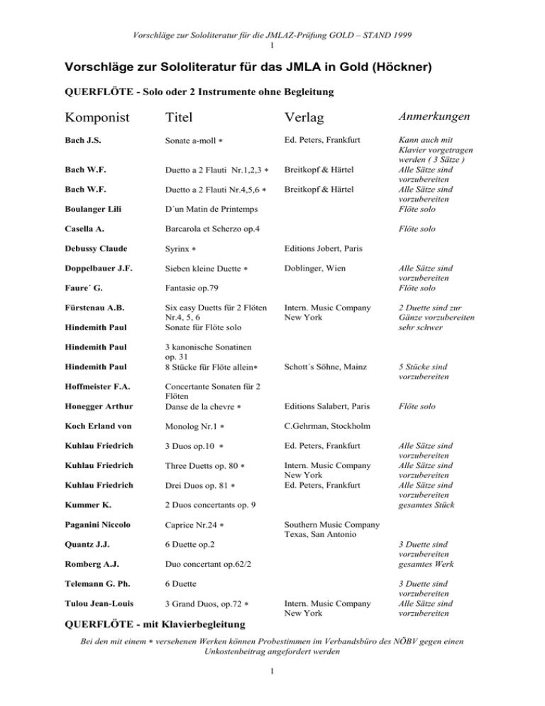 Vorschläge zur Sololiteratur für die JMLAZ-Prüfung GOLD – STAND 1999 1 Vorschläge zur Sololiteratur für das JMLA in Gold (Höckner) QUERFLÖTE - Solo oder 2 Instrumente ohne Begleitung Komponist Titel Verlag Anmerkungen Bach J.S. Sonate a-moll Ed. Peters, Frankfurt Bach W.F. Duetto a 2 Flauti Nr.1,2,3 Breitkopf & Härtel Bach W.F. Duetto a 2 Flauti Nr.4,5,6 Breitkopf & Härtel Boulanger Lili D´un Matin de Printemps Kann auch mit Klavier vorgetragen werden ( 3 Sätze ) Alle Sätze sind vorzubereiten Alle Sätze sind vorzubereiten Flöte solo Casella A. Barcarola et Scherzo op.4 Flöte solo Debussy Claude Syrinx Editions Jobert, Paris Doppelbauer J.F. Sieben kleine Duette Doblinger, Wien Faure´ G. Fantasie op.79 Alle Sätze sind vorzubereiten Flöte solo Fürstenau A.B. Six easy Duetts für 2 Flöten Nr.4, 5, 6 Sonate für Flöte solo Intern. Music Company New York 2 Duette sind zur Gänze vorzubereiten sehr schwer 3 kanonische Sonatinen op. 31 8 Stücke für Flöte allein Schott´s Söhne, Mainz 5 Stücke sind vorzubereiten Honegger Arthur Concertante Sonaten für 2 Flöten Danse de la chevre Editions Salabert, Paris Flöte solo Koch Erland von Monolog Nr.1 C.Gehrman, Stockholm Kuhlau Friedrich 3 Duos op.10 Ed. Peters, Frankfurt Kuhlau Friedrich Three Duetts op. 80 Kuhlau Friedrich Drei Duos op. 81 Intern. Music Company New York Ed. Peters, Frankfurt Kummer K. 2 Duos concertants op. 9 Paganini Niccolo Caprice Nr.24 Quantz J.J. 6 Duette op.2 Romberg A.J. Duo concertant op.62/2 Telemann G. Ph. 6 Duette Tulou Jean-Louis 3 Grand Duos, op.72 Hindemith Paul Hindemith Paul Hindemith Paul Hoffmeister F.A. Alle Sätze sind vorzubereiten Alle Sätze sind vorzubereiten Alle Sätze sind vorzubereiten gesamtes Stück Southern Music Company Texas, San Antonio 3 Duette sind vorzubereiten gesamtes Werk Intern. Music Company New York 3 Duette sind vorzubereiten Alle Sätze sind vorzubereiten QUERFLÖTE - mit Klavierbegleitung Bei den mit einem versehenen Werken können Probestimmen im Verbandsbüro des NÖBV gegen einen Unkostenbeitrag angefordert werden 1 Vorschläge zur Sololiteratur für die JMLAZ-Prüfung GOLD – STAND 1999 2 Komponist Titel Verlag Anmerkungen Bach Carl Ph. Emanuel Hamburger Sonate G-Dur Bach Carl Ph. Emanuel Concerto Edition Musica, Budapest Bach J.Chr. Sonata Edition Musica Bach J.S. Suite in h-moll Ed.Peters, Frankfurt Bach J.S. Sonate a-moll Ed. Peters, Frankfurt Bach J.S. Sonata g-moll Bärenreiter, Kassel Bach J.S. Sonaten Nr. I - VI Ed.Peters, Frankfurt Beethoven L.van Serenade op.25 D-Dur Benda Franz Brun Georges 6 Sonaten + basso continuo Romance , op. 41 Chaminade Cecile Serenade aus Etaile op.142 Chaminade Cecile Concertino D-Dur op.107 Cimarosa D. Debussy Claude Concerto in G-Dur für 2 Flöten Bilitis Doppler F. Ungarische Fantasie op.26 Focking Hendrik Gluck Christoph W. Sonata in Sol Maggiore op.1 Nr.2 Concerto Godart B. Suite de 3 Morceaux op.116 3. Satz sehr schwer Händel G.F. eine gesamte Sonate ist vorzubereiten Haydn J. Sonaten in a, e, b-moll + basso continuo Concerto D-Dur Haydn M. Sonate Hasse Johann Adolf Sonate G-Dur Schott´s & Söhne, Mainz Hasse Johann Adolf Sonate D-Dur Nagels Musik Archiv 99, Kassel Mouquet J. La flute de pan op.15 Mozart W.A. Sonaten Nr. I-KV.10, Nr. IIKV. 11, Nr.III-KV.12 Sonaten Nr. IV-KV.13, Nr. V - KV. 14, Nr. VI - KV 15 Mozart W.A. Alle Sätze sind vorzubereiten Ouvertüre u. 3 Sätze sind vorzubereiten Alle Sätze sind vorzubereiten Alle Sätze sind vorzubereiten ein schneller und ein langsamer Satz Rubank Intern. Music Company New York Universal Edition, Wien vier Sätze sind vorzubereiten Ed. Heuwekemeijer, Amsterdam Hug & Co., Zürich Reinhardt, Basel Reinhardt, Basel Alle Sätze sind vorzubereiten Alle Sätze sind vorzubereiten sehr schwer Alle Sonaten sind vorzubereiten Alle Sonaten sind vorzubereiten Bei den mit einem versehenen Werken können Probestimmen im Verbandsbüro des NÖBV gegen einen Unkostenbeitrag angefordert werden 2 Vorschläge zur Sololiteratur für die JMLAZ-Prüfung GOLD – STAND 1999 3 Mozart W.A. Konzert G - Dur KV. 313 Breitkopf & Härtel Mozart W.A. Konzert D - Dur KV. 314 Breitkopf & Härtel Mozart W.A. Konzert C - Dur KV. 299 Litolff/Peters Mozart W.A. Andante in C - Dur KV.315 Breitkopf & Härtel Pergolesi G.B. Concerto Nr.1 G-Dur Quantz J.J. Concerte Sonaten Reinecke C. Sonata Udine e-moll op.167 Sommer Silvia Sonatine Doblinger Telemann Georg Philipp Telemann Georg Philipp Telemann Georg Philipp Telemann Georg Philipp Vivaldi Antonio Aus ”12 meth. Sonaten” Nr. 1- 3 Aus ”12 meth. Sonaten” Nr. 4 - 6 Aus ”12 meth. Sonaten” Nr. 7 - 9 Aus ”12 meth. Sonaten” Nr. 10 - 12 Concerto c-moll Bärenreiter Vivaldi Antonio Konzert für Piccolo-Flöte Wagenseil G.Ch. Concerto G-Dur ein schneller und ein langsamer Satz ein schneller und ein langsamer Satz ein schneller und ein langsamer Satz schneller Satz aus Mozartkonzert zusätzlich ! schwer Bärenreiter Bärenreiter Bärenreiter Alle Sonaten sind vorzubereiten Alle Sonaten sind vorzubereiten Alle Sonaten sind vorzubereiten Alle Sonaten sind vorzubereiten ein schneller und ein langsamer Satz Klarinette - solo oder 2 Instrumente ohne Begleitung Komponist Titel Verlag Anmerkungen Bischof Rainer Sonatine op.1 Doblinger Klarinette solo Brixel Eugen Reischl, Oberneukirchen Brixel Eugen Sonatine für B-Klarinette und Tenorhorn Sonatine Schulz, Freiburg Klarinette solo Carr Paul Six Sketches for Clarinett Musica Nova Crusell Bernhard Henrik Devienne Francois Duo II C-Dur für 2 Klarinetten Sikorski, Hamburg Duo concertant Nr.1 Doblinger Alle Sätze sind vorzubereiten Klarinette solo Fromm-Michaels Ilse Tischer & Jagenberg München Gehrman, Stockholm Klarinette solo Koch Erland von Kreutzer Conradin Stimmungen eines Fauns op.11 Monolog Nr.3 Duo in C-Dur Mozart W.A. 6 Duette für 2 Klarinetten Schmidt, Heilbronn 3 Duette sind vorzubereiten Klarinette solo Bei den mit einem versehenen Werken können Probestimmen im Verbandsbüro des NÖBV gegen 