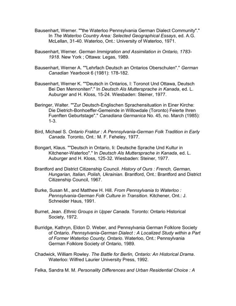 Bausenhart, Werner. ""the Waterloo Pennsylvania German Dialect Community"." In The Waterloo Country Area: Selected Geographical Essays, ed. A.G. McLellan, 31-40. Waterloo, Ont.: University of Waterloo, 1971. Bausenhart, Werner. German Immigration and Assimilation in Ontario, 17831918. New York ; Ottawa: Legas, 1989. Bausenhart, Werner A. ""Lehrfach Deutsch an Ontarios Oberschulen"." German Canadian Yearbook 6 (1981): 178-182. Bausenhart, Werner K. ""Deutsch in Ontarios, I: Toronot Und Ottawa, Deutsch Bei Den Mennoniten"." In Deutsch Als Muttersprache in Kanada, ed. L. Auburger and H. Kloss, 15-24. Wiesbaden: Steiner, 1977. Beringer, Walter. ""Zur Deutsch-Englischen Sprachensituation in Einer Kirche: Die Dietrich-Bonhoeffer-Gemeinde in Willowdale (Toronto) Feierte Ihren Fuenften Geburtstage"." Canadiana Germanica No. 45, no. March (1985): 1-3. Bird, Michael S. Ontario Fraktur : A Pennsylvania-German Folk Tradition in Early Canada. Toronto, Ont.: M. F. Feheley, 1977. Bongart, Klaus. ""Deutsch in Ontario, Ii: Deutsche Sprache Und Kultur in Kitchener-Waterloo"." In Deutsch Als Muttersprache in Kanada, ed. L. Auburger and H. Kloss, 125-32. Wiesbaden: Steiner, 1977. Brantford and District Citizenship Council. History of Ours : French, German, Hungarian, Italian, Polish, Ukrainian. Brantford, Ont.: Brantford and District Citizenship Council, 1967. Burke, Susan M., and Matthew H. Hill. From Pennsylvania to Waterloo : Pennsylvania-German Folk Culture in Transition. Kitchener, Ont.: J. Schneider Haus, 1991. Burnet, Jean. Ethnic Groups in Upper Canada. Toronto: Ontario Historical Society, 1972. Burridge, Kathryn, Eldon D. Weber, and Pennsylvania German Folklore Society of Ontario. Pennsylvania-German Dialect : A Localized Study within a Part of Former Waterloo County, Ontario. Waterloo, Ont.: Pennsylvania German Folklore Society of Ontario, 1989. Chadwick, William Rowley. The Battle for Berlin, Ontario: An Historical Drama. Waterloo: Wilfred Laurier University Press, 1992. Felka, Sandra M. M. Personality Differences and Urban Residential Choice : A Case Study of Toronto's German Community. Toronto, Ont.: York University Department of Geography, 1991. Friesen, C. Alfred. Memoirs of the Virgil-Niagara Mennonites : History of the Mennonite Settlement in Niagara-on-the-Lake, Ontario, 1934-84. St. Catharines, Ont.: Virgil-Niagara Mennonite Jubilee Committee, 1985. Fröschle, Hartmut. Nachrichten Aus Ontario : Deutschsprachige Literatur in Kanada. Hildesheim ; New York: Olms, 1981. German-Canadian Historical Association., and Historical Society of Mecklenburg Upper Canada. "Canadiana Germanica." v. Toronto,: German-Canadian Historical Association. Hessel, Peter. "German Immigration to the Ottawa Valley in the 19th Century." German Canadian Yearbook 8 (1984): 67-94. Hessel, Peter D. K. Destination, Ottawa Valley. Ottawa: Runge Press, 1984. Horst, Isaac R. Close Ups of the Great Awakening. Mt. Forest, Ont.: I.R. Horst, 1985. Horst, Isaac R. Separate and Peculiar : Old Order Mennonite Life in Ontario = Bei Sich Selwer Un Ungwehnlich : Alt Mennischde Weg Vun Lewe in Ontario. 2nd ed. Waterloo, Ont.: Herald Press, 2001. Hunsberger, David L., James Hertel, Koni Lattner, and Joseph Winfield Fretz. People Apart : Portrait of a Mennonite World in Waterloo County, Ontario. St. Jacobs, Ont.: Sand Hills Books : distributed by Laughing Horse Gallery, 1978. Jones, Robert Leslie. History of Agriculture in Ontario, 1613-1880. Toronto,: Univ. of Toronto Press, 1946. Kalbfleisch, Herbert Karl. The History of the Pioneer German Language Press of Ontario, 1835-1918. Toronto: University of Toronto Press, 1968. Lee-Whiting, Brenda. Harvest of Stones : The German Settlement in Renfrew County. Toronto ; Buffalo: University of Toronto Press, 1985. Lee-Whiting, Brenda B. "Doddy-House Duties Outlined in 1912: How a German Farmer in Eastern Ontario Worked and Enjoyed a Secure Old Age." German Canadian Yearbook 6 (1981): 89-102. Leibbrandt, Gottlieb. "Deutsche Ortgruendungen Und Ortsnamen in Der Grafschaft Waterloo." German Canadian Yearbook 1 (1973): 119-129. Leibbrandt, Gottlieb. Little Paradise : Aus Geschichte Und Leben Der Deutschkanadier in Der County Waterloo, Ontario, 1800-1975 Deutschkanadische Schriften ; Bd. 1. Kitchener, Ont.: Allprint, 1977. Leibbrandt, Gottlieb. Little Paradise : The Saga of the German Canadians of Waterloo County, Ontario 1800-1975. Kitchener, Ont.: Allprint Co., 1980. Lewis, Gertrud. "The Sudbury Germans." Polyphony [Multicultural History Society of Ontario] 5 (1983): 82-85. Lewis, Gertrud J. ""20 Jahre Deutsch-Kanadische Schulgemeinschaft in Sudbury, Ontario"." German Canadian Yearbook 6 (1981): 261-263. Mage, Julius, and Robert Murdie. "The Mennonites of Waterloo County." Canadian Geographical Journal 80, no. 1 (1970): 10-19. Nabert, Kurt. ""Deutsch in Ontario. Ueber Einige Deutsche Dialekte"." In Deutsch Als Muttersprache in Kanada, ed. L. Auburger and H. Kloss, 33-37. Wiesbaden: Steiner, 1977. Patterson, Nancy-Lou. Swiss-German and Dutch-German Mennonite Traditional Art in the Waterloo Region, Ontario. Ottawa, Ont.: National Museums of Canada, 1979. Piro, Rolf, A. "German-Speaking Missionaries and Soldiers among the Indians of Upper and Lower Canada." German Canadian Yearbook 5 (1979): 25-34. Piro, Rolf A. "Die Bahls (the Ball Family): Das Wirken Und Das Erbe Einer Empire Loyalist-Familie in Niagara." German Canadian Yearbook 4 (1978): 127-134. Raymont, Peter, Carl Bessai, Robert Kroetsch, Mark Korven, Tim Richards, McNabb & Connolly (Firm), and White Pine Pictures. The Impossible Home Robert Kroetsch and His German Roots. Distributed in Canada by McNabb & Connolly, 1997. VID 03102 1997 Reaman, George Elmore. The Trail of the Black Walnut. Toronto: McClelland & Stewart, 1957. Roth, Lorraine, and Mennonite Historical Society of Ontario. The Amish and Their Neighbours : The German Block, Wilmot Township, 1822-1860. Waterloo, ON: Mennonite Historical Society of Ontario, 1998. Sauder, Ben, and Pennsyl
