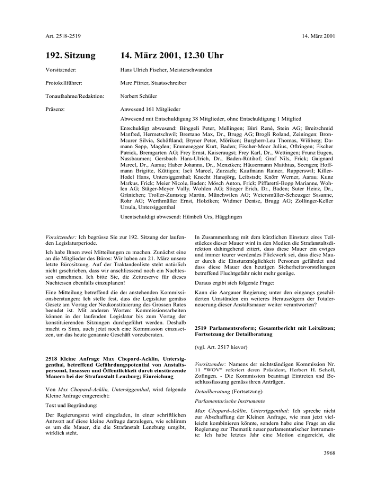 Art. 2518-2519 14. März 2001 192. Sitzung 14. März 2001, 12.30 Uhr Vorsitzender: Hans Ulrich Fischer, Meisterschwanden Protokollführer: Marc Pfirter, Staatsschreiber Tonaufnahme/Redaktion: Norbert Schüler Präsenz: Anwesend 161 Mitglieder Abwesend mit Entschuldigung 38 Mitglieder, ohne Entschuldigung 1 Mitglied Entschuldigt abwesend: Binggeli Peter, Mellingen; Birri René, Stein AG; Breitschmid Manfred, Hermetschwil; Brentano Max, Dr., Brugg AG; Brogli Roland, Zeiningen; BronMaurer Silvia, Schöftland; Bryner Peter, Möriken; Burgherr-Leu Thomas, Wiliberg; Damann Sepp, Magden; Emmenegger Kurt, Baden; Fischer-Moor Julius, Oftringen; Fischer Patrick, Bremgarten AG; Frey Ernst, Kaiseraugst; Frey Karl, Dr., Wettingen; Frunz Eugen, Nussbaumen; Gersbach Hans-Ulrich, Dr., Baden-Rütihof; Graf Nils, Frick; Guignard Marcel, Dr., Aarau; Haber Johanna, Dr., Menziken; Häusermann Matthias, Seengen; Hoffmann Brigitte, Küttigen; Iseli Marcel, Zurzach; Kaufmann Rainer, Rupperswil; KillerHodel Hans, Untersiggenthal; Knecht Hansjörg, Leibstadt; Knörr Werner, Aarau; Kunz Markus, Frick; Meier Nicole, Baden; Mösch Anton, Frick; Piffaretti-Bopp Marianne, Wohlen AG; Stäger-Meyer Vally, Wohlen AG; Stieger Erich, Dr., Baden; Suter Heinz, Dr., Gränichen; Troller-Zumsteg Martin, Münchwilen AG; Weiersmüller-Scheuzger Susanne, Rohr AG; Werthmüller Ernst, Holziken; Widmer Denise, Brugg AG; Zollinger-Keller Ursula, Untersiggenthal Unentschuldigt abwesend: Hümbeli Urs, Hägglingen Vorsitzender: Ich begrüsse Sie zur 192. Sitzung der laufenden Legislaturperiode. Ich habe Ihnen zwei Mitteilungen zu machen. Zunächst eine an die Mitglieder des Büros: Wir haben am 21. März unsere letzte Bürositzung. Auf der Traktandenliste steht natürlich nicht geschrieben, dass wir anschliessend noch ein Nachtessen einnehmen. Ich bitte Sie, die Zeitreserve für dieses Nachtessen ebenfalls einzuplanen! Eine Mitteilung betreffend die der anstehenden Kommissionsberatungen: Ich stelle fest, dass die Legislatur gemäss Gesetz am Vortag der Neukonstituierung des Grossen Rates beendet ist. Mit anderen Worten: Kommissionsarbeiten können in der laufenden Legislatur bis zum Vortag der konstituierenden Sitzungen durchgeführt werden. Deshalb macht es Sinn, auch jetzt noch eine Kommission einzusetzen, um das heute genannte Geschäft vorzuberaten. In Zusammenhang mit dem kürzlichen Einsturz eines Teilstückes dieser Mauer wird in den Medien die Strafanstaltsdirektion dahingehend zitiert, dass diese Mauer ein ewiges und immer teurer werdendes Flickwerk sei, dass diese Mauer durch die Einsturzmöglichkeit Personen gefährdet und dass diese Mauer den heutigen Sicherheitsvorstellungen betreffend Fluchtgefahr nicht mehr genüge. Daraus ergibt sich folgende Frage: Kann die Aargauer Regierung unter den eingangs geschilderten Umständen ein weiteres Herauszögern der Totalerneuerung dieser Anstaltsmauer weiter verantworten? 2519 Parlamentsreform; Gesamtbericht mit Leitsätzen; Fortsetzung der Detailberatung (vgl. Art. 2517 hievor) 2518 Kleine Anfrage Max Chopard-Acklin, Untersiggenthal, betreffend Gefährdungspotential von Anstaltspersonal, Insassen und Öffentlichkeit durch einstürzende Mauern bei der Strafanstalt Lenzburg; Einreichung Von Max Chopard-Acklin, Untersiggenthal, wird folgende Kleine Anfrage eingereicht: Text und Begründung: Der Regierungsrat wird eingeladen, in einer schriftlichen Antwort auf diese kleine Anfrage darzulegen, wie schlimm es um die Mauer, die die Strafanstalt Lenzburg umgibt, wirklich steht. Vorsitzender: Namens der nichtständigen Kommission Nr. 11 "WOV" referiert deren Präsident, Herbert H. Scholl, Zofingen. - Die Kommission beantragt Eintreten und Beschlussfassung gemäss ihren Anträgen. Detailberatung (Fortsetzung) Parlamentarische Instrumente Max Chopard-Acklin, Untersiggenthal: Ich spreche nicht zur Abschaffung der Kleinen Anfrage, wie man jetzt vielleicht kombinieren könnte, sondern habe eine Frage an die Regierung zur Thematik neuer parlamentarischer Instrumente: Ich habe letztes Jahr eine Motion eingereicht, die 3968 14. März 2001 anregt, dass Mitglieder und Fraktionen des Grossen Rates berechtigt sind, Resolutionen zu einem Sachthema einzureichen, zu beraten und mit einer Zweidrittelsmehrheit zu verabschieden. Frage: Auf welchem Weg ist mein Begehren? Wo und wie soll es nach einer allfälligen Überweisung einfliessen? Regierungsrat Kurt Wernli: Ich kann es kurz machen: Wir sind der Meinung, dass dieses Instrument nicht benutzt werden soll. Dementsprechend haben wir auch keinen Vorschlag unterbreitet. Auch die vorberatende Kommission ist nicht darauf eingetreten. Wenn Sie also dieses Instrument hier festhalten möchten, dann müssten Sie einen entsprechenden Antrag einreichen! Leitsätze 4.1 - 4.3 Zustimmung Vorsitzender: Es liegt ein Antrag von Herrn Harry Lütolf vor, der einen Absatz 4bis (neu) hinzufügen möchte. Harry Lütolf, Wohlen: Ich habe der Kommission einen Antrag gestellt. Denselben Antrag werde ich Ihnen hier präsentieren. Ich habe mir sagen lassen, dass der Antrag ordnungsgemäss, wie es die Geschäftsordnung vorschreibt, behandelt wurde; ich weiss allerdings nicht, wie vertieft darauf eingegangen wurde. Der Antrag lautet wie folgt: Leitsatz 4bis: "Die Mitwirkung des Grossen Rates im Bereich der kantonalen Aussenpolitik ist durch geeignete Instrumente zu institutionalisieren." Ich bin erstaunt, auf wie wenig Resonanz dieser Antrag in der Kommission offenbar gestossen ist. Vielleicht kann der Herr Kommissionspräsident dazu einige Ausführungen machen. Ich bin umso mehr erstaunt, als dass wir hier im Parlament vor einigen Wochen eine Diskussion bezüglich der Kündigung des Vertrages über die Konferenz der Erziehungsdirektoren geführt hatten. Die SVP-Fraktion hat sich damals zu Recht darüber ausgelassen, dass der Grosse Rat bei solchen Institutionen zu wenig Gehör findet, etwa in der Mitwirkung, in der Vorbereitung und in den Abläufen solcher Gremien, die nota bene nicht e