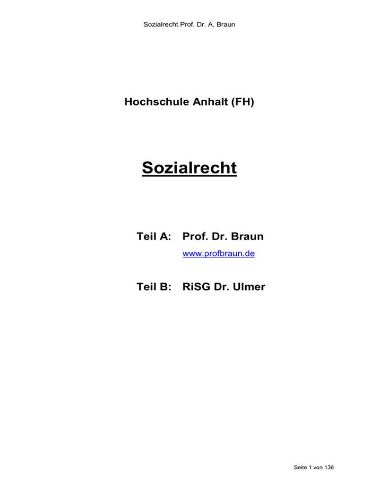 Sozialrecht Prof. Dr. A. Braun Hochschule Anhalt (FH) Sozialrecht Teil A: Prof. Dr. Braun www.profbraun.de Teil B: RiSG Dr. Ulmer Seite 1 von 136 Sozialrecht Prof. Dr. A. Braun Inhaltsverzeichnis: Gliederung .............................................................................................................. 2-4 Vorbemerkungen ........................................................................................................5 Gliederung: Teil A - Grundlagen I) Einführung 6 1) Standort der Vorlesung 6 2) Begriff des Sozialrechts 6 3) Bedeutung des Sozialrechts 7 4) Geschichtliche Entwicklung 7 5) Ausblick auf das idnternationale Sozialrecht 9 II) Das SGB I, Allgemeiner Teil 1) Überblick 10 2) Gesetzessystematik 10 3) Leistungsarten § 11 11 4) Persönlicher Geltungsbereich § 30 11 5) Leistungsträger § 12 12 6) Handlungs-, Geschäfts- und Rechtsfähigkeit § 36 12 7) Aufklärung, Beratung, Auskunft §§ 13-15 12 8) Rechtsfolgen bei Pflichtverletzung durch Leistungsträger, Herstellungsanspruch 14 9) Verbot nachteiliger Vereinbarungen § 32 17 10) Sozialgeheimnis § 35 17 11) Verzinsung § 44 17 12) Verjährung § 45 18 13) Auszahlung, Überleitung u.ä. §§ 47-59 18 14) Mitwirkung des Leistungsberechtigten §§ 60-67 19 Seite 2 von 136 Sozialrecht Prof. Dr. A. Braun III) Das SGB IV, Gemeinsame Vorschriften für die Sozialversicherung 1) Ziel und Zweck des SGB IV 20 2) Sachlicher Leistungsbereich § 1 20 3) Begriff der Solidarversicherung 20 4) Versicherungsarten 5) Ausstrahlung, Einstrahlung §§ 4,5 21 6) das versicherungspflichtige Beschäftigungsverhältnis § 7 22 7) Beitragsrückstände § 7 b; das praktische Problem 25 8) Geringfügige Beschäftigung §§ 8, 8a 27 9) Art und Höhe des Einkommens §§ 18a-18e 29 20 10) Meldepflichten, §§ 28a-28c 29 11) Sozialversicherungsausweis §§ 95-109 30 12) Organisationsrecht §§ 29-90a 30 IV)Das SGB V, Gesetzliche Krankenversicherung 1) Ziel und Zweck des SGB V 32 2) Rückblick und Ausblick 32 3) Solidaritätsgrundsatz § 1 32 4) Krankenkassen § 4 32 5) Versicherter Personenkreis 33 6) Beiträge §§ 220 ff. 36 7) Leistungsgrundsätze und Leistungsarten 37 8) Honorierungsverfahren, System 38 9) das Leistungsspektrum §§ 11-68 40 10) Zuzahlungen, Belastungsgrenze §§ 61, 62 42 11) Medizinischer Dienst der Krankenkassen §§ 275 ff. 43 V) Das SGB XI, Soziale Pflegeversicherung 1) Ziel und Zweck des SGB XI 44 2) Aufbau und System § 46 ff. 44 3) Programm §§ 1-13 44 4) Leistungsberechtigter Personenkreis §§ 14 ff. 44 5) Versicherungspflicht im Einzelnen §§ 20 ff 44 6) Beiträge §§ 54 ff. 45 7) Leistungen der Pflegeversicherung §§ 28-45c 45 8) Renten- und Unfallversicherung für Pflegepersonen § 44 46 9) Vertragssystem zwischen Pflegekassen und Leistungserbringern §§ 69-81 46 10) Honorierung der Pflege §§ 82-92a 47 Seite 3 von 136 Sozialrecht Prof. Dr. A. Braun VI)Das SGB III, Arbeitsförderung VII) VIII) 1)... Ziel und Zweck des SGB III 48 2)... Ziele der Arbeitsförderung § 1 48 3)... Zusammenarbeit von AG, AN und der BA § 2 48 4)... Berechtigte §§ 12-21 48 5)... versicherter Personenkreis §§ 24-28a 48 6)... Finanzierung §§ 340-366 49 7)... Beiträge §§ 341-353 49 8)... Umlagen §§ 354-362 50 9)... Bundesbeteiligung §§ 363-365 50 10). Aufbau und Organisation der BA §§ 367-403 50 11). Leistungen an Arbeitgeber §§ 217-239 51 12). Leistungen an Träger §§ 240-271 54 13). Leistungen an Arbeitnehmer §§ 45-216b 56 Das SGB II, Grundsicherung für Arbeitssuchende 1) Ziel und Zweck des SGB II 72 2) Geltungsbereich 72 3) Leistungsträger 73 4) der Grundsatz: Fördern und Fördern §§ 1-6c 74 5) Anspruchsvoraussetzungen §§ 7 - 13 74 6) Leistungen §§ 14 - 35 78 Das SGB XII, Sozialhilfe 1) Ziel und Zweck des SGB XII 83 2) Subsidiarität §§ 2, 21 83 3) Träger § 3 84 4) Leistungsarten § 4 84 5) Anspruchsvoraussetzungen §§ 17 - 26 84 6) Hilfe zum Lebensunterhalt (HzL) §§ 27 - 40 86 7) Grundsicherung im Alter und bei Erwerbsminderung §§ 41 - 46 87 8) Hilfe zur Gesundheit und Pflege §§ 47 - 52; §§ 61 - 66 88 9) Eingliederungshilfe für Behinderte §§ 53 - 60 88 10) Einsatz des Einkommens und Vermögen §§ 82 - 96 89 11) Berücksichtigung von Ansprüchen 12) insbesondere Unterhaltsansprüchen §§ 93 - 95 89 Seite 4 von 136 Sozialrecht Prof. Dr. A. Braun IX)Asylbewerberleistungsgesetz (AsylbLG) 1) Problem der Migration 92 2) keine Leistungen nach dem SGB XII 92 3) Leistungsberechtigte § 1 92 4) Leistungen §§ 3, 4 92 5) Beschränkungen §§ 2,3 92 X) Das SGB VII, Gesetzliche Unfallversicherung 1) zum Verständnis 93 2) Aufgabe der UV § 1 93 3) Träger der UV § 22 II SGB I 94 4) Versicherung kraft Gesetzes § 2 94 5) Versicherung kraft Satzung § 3 95 6) Versicherungsfreiheit § 4 95 7) freiwillige Versicherung § 6 95 8) Beiträge §§ 152 ff. 95 9) der Arbeitsunfall § 8 I 96 10) der Wegeunfall § 8 II Nr. 1 100 11) Berufskrankheiten § 9 101 12) Leistungen - Überblick §§ 26-103 101 XI)Das SGB VI, Gesetzliche Rentenversicherung wird fortgesetzt XII) soziale Förderung wird fortgesetzt XIII) 105 106 EntschädigungsR wird fortgesetzt 107 Seite 5 von 136 Sozialrecht Prof. Dr. A. Braun XIV) Das SGB X, Sozialverwaltungsverfahren und Sozialdatenschutz 1) Ziel und Zweck des SGB X 108 2) Amtshilfe §§ 3-7 108 3) Verfahrensgrundsätze §§ 8-25 109 4) Anhörung Beteiligter § 24 110 5) Akteneinsicht § 25 110 6) Fristen, Termine, Wiedereinsetzung §§ 26, 27 110 7) Verwaltungsakte §§ 31-38 111 8) Bestandskraft des VA §§ 39-52 112 9) öffentlich-rechtlicher Vertrag §§ 53-61 115 10) Sozialdatenschutz §§ 67-85a 115 11) Auskunftspflichten §§ 97-101a 116 12) Erstattungs- und Ersatzansprüche Dritter §§ 115-119 116 Fallübersicht Folienübersicht 120-121 122 Seite 6 von 136 Sozialrecht Prof. Dr. A. Braun Vorbemerkung: In Teil A (Prof. Dr. Braun) werden ausgewählte Bücher des SGB vorgestellt und zusammenfassend, übergreifend und einführend das Grundlagenwissen für Wirtscha