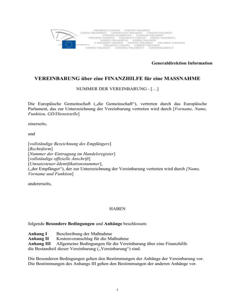 Generaldirektion Information VEREINBARUNG über eine FINANZHILFE für eine MASSNAHME NUMMER DER VEREINBARUNG - […] Die Europäische Gemeinschaft („die Gemeinschaft“), vertreten durch das Europäische Parlament, das zur Unterzeichnung der Vereinbarung vertreten wird durch [Vorname, Name, Funktion, GD/Dienststelle] einerseits, und [vollständige Bezeichnung des Empfängers] [Rechtsform] [Nummer der Eintragung im Handelsregister] [vollständige offizielle Anschrift] [Umsatzsteuer-Identifikationsnummer], („der Empfänger“), der zur Unterzeichnung der Vereinbarung vertreten wird durch [Name, Vorname und Funktion] andererseits, HABEN folgende Besondere Bedingungen und Anhänge beschlossen: Anhang I Beschreibung der Maßnahme Anhang II Kostenvoranschlag für die Maßnahme Anhang III Allgemeine Bedingungen für die Vereinbarung über eine Finanzhilfe die Bestandteil dieser Vereinbarung („Vereinbarung“) sind. Die Besonderen Bedingungen gehen den Bestimmungen der Anhänge der Vereinbarung vor. Die Bestimmungen des Anhangs III gehen den Bestimmungen der anderen Anhänge vor. 1 ARTIKEL I – BESONDERE BEDINGUNGEN ARTIKEL I.1 – GEGENSTAND I.1.1 Das Parlament gewährt dem Empfänger nach Maßgabe der Besonderen Bedingungen sowie der Anhänge, die der Empfänger kennt und akzeptiert, eine Finanzhilfe zur Durchführung der Maßnahme … („Maßnahme“). I.1.2 Der Empfänger nimmt die Finanzhilfe an und verpflichtet sich, alle Vorkehrungen zu treffen, um eigenverantwortlich die in Anhang I beschriebene Maßnahme durchzuführen. ARTIKEL I.2 - LAUFZEIT I.2.1 Die Vereinbarung tritt an dem Tag in Kraft, an dem sie von der letzten Partei unterzeichnet wird. I.2.2 Die Maßnahme hat eine Laufzeit von Monaten/Tagen ab dem [Datum einfügen] („Beginn der Laufzeit der Maßnahme“). Datum des Abschlusses der Maßnahme ist der [Datum einfügen]. Die Daten für Beginn und Ende der Maßnahme bestimmen den Zeitraum, innerhalb dessen Ausgaben förderfähig sind. Ausgaben, die vor dem Datum des Beginns oder nach dem Datum des Abschlusses der Maßnahme anfallen, gelten nicht als förderfähig; eine Ausnahme bilden bestimmte budgetierte Kosten im Zusammenhang mit dem Abschlussbericht wie etwa Kosten des Drucks und die Übersetzung der Berichte, und/oder Kosten einer externen Prüfung, sofern diese nach den Bestimmungen der Finanzhilfevereinbarung erforderlich ist. ARTIKEL I.3 – FINANZIERUNG DER MASSNAHME I.3.1 Die Gesamtkosten der Maßnahme werden entsprechend dem Kostenvoranschlag in Anhang II mit … EUR veranschlagt. Im Kostenvoranschlag für die Maßnahme sind die aus dem Gemeinschaftshaushaltsplan förderfähigen Kosten nach Maßgabe von Anhang III.14 sowie alle Einnahmen im Einzelnen so aufzulisten, dass sich die Einnahmen und Kosten ausgleichen. I.3.2 Option 1: Der Gesamtbetrag der förderfähigen Kosten der Maßnahme, für die das Parlament eine Finanzhilfe bewilligt, [wird veranschlagt mit … EUR] (entsprechend den Gesamtkosten der Maßnahme), wie im Kostenvoranschlag in Anhang II ausgewiesen. Die indirekten Kosten der Maßnahme werden nach Maßgabe von Artikel III.14.3 in Höhe einer Pauschale von höchstens 7 % des Gesamtbetrags der förderfähigen direkten Kosten gefördert. Option 2: Der Gesamtbetrag der förderfähigen Kosten der Maßnahme wird – unter Anwendung der in Artikel III.14 dargelegten Kriterien für die Förderfähigkeit – mit … EUR 2 veranschlagt, entsprechend den folgenden Ausgabenposten im Kostenvoranschlag in Anhang II: - …. - …. - …. Die indirekten Kosten der Maßnahme werden nach Maßgabe von Artikel III.14.3 in Höhe einer Pauschale von höchstens 7 % des Gesamtbetrags der förderfähigen direkten Kosten gefördert. I.3.3 Das Parlament übernimmt einen Höchstbetrag von … EUR, d. h. … % der veranschlagten förderfähigen Gesamtkosten nach Absatz I.3.2. Die endgültige Finanzhilfe wird gemäß Artikel III.17 - unbeschadet des Artikels III.19 - bestimmt. Die Finanzhilfe der Gemeinschaft deckt nicht sämtliche Kosten der Durchführung der Maßnahme. Die externen Finanzierungsquellen und die entsprechenden Beträge sind im Kostenvoranschlag gemäß Absatz 1 anzugeben. I.3.4 Option 1: (anzuwenden auf Finanzhilfen, bei denen sich der Beitrag der GD Information auf 20 000 EUR oder mehr beläuft) Abweichend von Artikel III.13 kann der Empfänger im Zuge der Durchführung der Maßnahme eine Anpassung seines Kostenvoranschlags durch Umschichtungen zwischen den einzelnen Kategorien förderfähiger Kosten vornehmen, sofern diese Ausgabenanpassung die Durchführung der Maßnahme nicht beeinträchtigt und sofern die Umschichtung zwischen einzelnen Kategorien 20 % des im Kostenvoranschlag vorgesehenen Betrags für die betreffende Kategorie nicht überschreitet und der Gesamtbetrag der förderfähigen Kosten nach Absatz 1 eingehalten wird. Das Parlament ist schriftlich davon zu verständigen. Eine Umschichtung, die bei einer Kostenkategorie eine Veränderung von mehr als 20 % hervorruft, oder die Einführung einer neuen (im Kostenvoranschlag nicht vorgesehenen) Kostenkategorie bedarf der vorherigen schriftlichen Genehmigung des Parlaments. Option 2: (anzuwenden, wenn sich der Beitrag der GD Information auf weniger als 20 000 EUR beläuft) Abweichend von Artikel III.13 kann der Empfänger im Zuge der Durchführung der Maßnahme eine Anpassung seines Kostenvoranschlags durch Umschichtungen zwischen den einzelnen Posten förderfähiger Ausgaben vornehmen, sofern diese Ausgabenanpassung die Durchführung der Maßnahme nicht beeinträchtigt und sofern die Anpassung vollständig gerechtfertigt ist und in der Endabrechnung im Einzelnen ausgewiesen wird. ARTIKEL I.4 - ZAHLUNGSMODALITÄTEN I.4.1 Vorfinanzierung Innerhalb von 45 Tagen nach dem Tag der Unterzeichnung der Vereinbarung durch die letzte Partei erhält der Empfänger eine Vorfinanzierung in Höhe von […] EUR, d. h. von 40 % des in Artikel I.3.3 genannten Betrags 3 I.4.2 Zahlung des Restbetrags Option 1: (anzuwenden