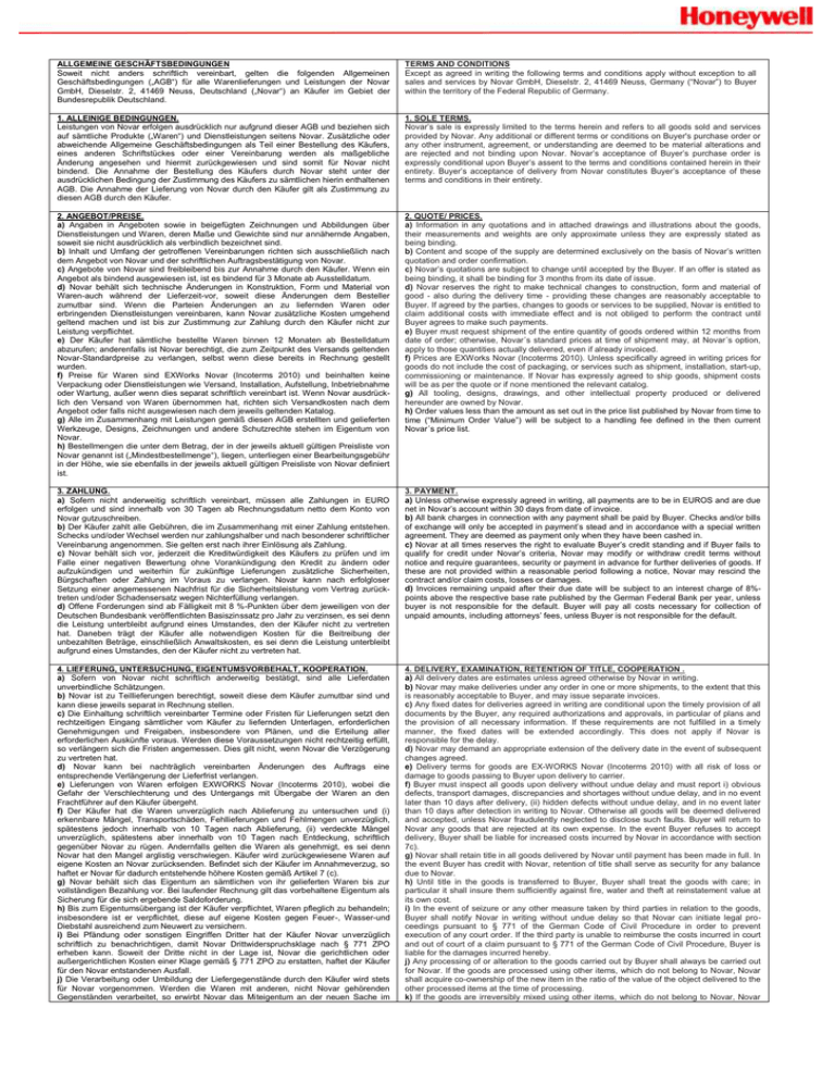 ALLGEMEINE GESCHÄFTSBEDINGUNGEN Soweit nicht anders schriftlich vereinbart, gelten die folgenden Allgemeinen Geschäftsbedingungen („AGB“) für alle Warenlieferungen und Leistungen der Novar GmbH, Dieselstr. 2, 41469 Neuss, Deutschland („Novar“) an Käufer im Gebiet der Bundesrepublik Deutschland. TERMS AND CONDITIONS Except as agreed in writing the following terms and conditions apply without exception to all sales and services by Novar GmbH, Dieselstr. 2, 41469 Neuss, Germany (“Novar”) to Buyer within the territory of the Federal Republic of Germany. 1. ALLEINIGE BEDINGUNGEN. Leistungen von Novar erfolgen ausdrücklich nur aufgrund dieser AGB und beziehen sich auf sämtliche Produkte („Waren“) und Dienstleistungen seitens Novar. Zusätzliche oder abweichende Allgemeine Geschäftsbedingungen als Teil einer Bestellung des Käufers, eines anderen Schriftstückes oder einer Vereinbarung werden als maßgebliche Änderung angesehen und hiermit zurückgewiesen und sind somit für Novar nicht bindend. Die Annahme der Bestellung des Käufers durch Novar steht unter der ausdrücklichen Bedingung der Zustimmung des Käufers zu sämtlichen hierin enthaltenen AGB. Die Annahme der Lieferung von Novar durch den Käufer gilt als Zustimmung zu diesen AGB durch den Käufer. 1. SOLE TERMS. Novar’s sale is expressly limited to the terms herein and refers to all goods sold and services provided by Novar. Any additional or different terms or conditions on Buyer's purchase order or any other instrument, agreement, or understanding are deemed to be material alterations and are rejected and not binding upon Novar. Novar’s acceptance of Buyer’s purchase order is expressly conditional upon Buyer’s assent to the terms and conditions contained herein in their entirety. Buyer’s acceptance of delivery from Novar constitutes Buyer’s acceptance of these terms and conditions in their entirety. 2. ANGEBOT/PREISE. a) Angaben in Angeboten sowie in beigefügten Zeichnungen und Abbildungen über Dienstleistungen und Waren, deren Maße und Gewichte sind nur annähernde Angaben, soweit sie nicht ausdrücklich als verbindlich bezeichnet sind. b) Inhalt und Umfang der getroffenen Vereinbarungen richten sich ausschließlich nach dem Angebot von Novar und der schriftlichen Auftragsbestätigung von Novar. c) Angebote von Novar sind freibleibend bis zur Annahme durch den Käufer. Wenn ein Angebot als bindend ausgewiesen ist, ist es bindend für 3 Monate ab Ausstelldatum. d) Novar behält sich technische Änderungen in Konstruktion, Form und Material von Waren-auch während der Lieferzeit-vor, soweit diese Änderungen dem Besteller zumutbar sind. Wenn die Parteien Änderungen an zu liefernden Waren oder erbringenden Dienstleistungen vereinbaren, kann Novar zusätzliche Kosten umgehend geltend machen und ist bis zur Zustimmung zur Zahlung durch den Käufer nicht zur Leistung verpflichtet. e) Der Käufer hat sämtliche bestellte Waren binnen 12 Monaten ab Bestelldatum abzurufen; anderenfalls ist Novar berechtigt, die zum Zeitpunkt des Versands geltenden Novar-Standardpreise zu verlangen, selbst wenn diese bereits in Rechnung gestellt wurden. f) Preise für Waren sind EXWorks Novar (Incoterms 2010) und beinhalten keine Verpackung oder Dienstleistungen wie Versand, Installation, Aufstellung, Inbetriebnahme oder Wartung, außer wenn dies separat schriftlich vereinbart ist. Wenn Novar ausdrücklich den Versand von Waren übernommen hat, richten sich Versandkosten nach dem Angebot oder falls nicht ausgewiesen nach dem jeweils geltenden Katalog. g) Alle im Zusammenhang mit Leistungen gemäß diesen AGB erstellten und gelieferten Werkzeuge, Designs, Zeichnungen und andere Schutzrechte stehen im Eigentum von Novar. h) Bestellmengen die unter dem Betrag, der in der jeweils aktuell gültigen Preisliste von Novar genannt ist („Mindestbestellmenge“), liegen, unterliegen einer Bearbeitungsgebühr in der Höhe, wie sie ebenfalls in der jeweils aktuell gültigen Preisliste von Novar definiert ist. 2. QUOTE/ PRICES. a) Information in any quotations and in attached drawings and illustrations about the goods, their measurements and weights are only approximate unless they are expressly stated as being binding. b) Content and scope of the supply are determined exclusively on the basis of Novar’s written quotation and order confirmation. c) Novar’s quotations are subject to change until accepted by the Buyer. If an offer is stated as being binding, it shall be binding for 3 months from its date of issue. d) Novar reserves the right to make technical changes to construction, form and material of good - also during the delivery time - providing these changes are reasonably acceptable to Buyer. If agreed by the parties, changes to goods or services to be supplied, Novar is entitled to claim additional costs with immediate effect and is not obliged to perform the contract until Buyer agrees to make such payments. e) Buyer must request shipment of the entire quantity of goods ordered within 12 months from date of order; otherwise, Novar´s standard prices at time of shipment may, at Novar´s option, apply to those quantities actually delivered, even if already invoiced. f) Prices are EXWorks Novar (Incoterms 2010). Unless specifically agreed in writing prices for goods do not include the cost of packaging, or services such as shipment, installation, start-up, commissioning or maintenance. If Novar has expressly agreed to ship goods, shipment costs will be as per the quote or if none mentioned the relevant catalog. g) All tooling, designs, drawings, and other intellectual property produced or delivered hereunder are owned by Novar. h) Order values less than the amount as set out in the price list published by Novar from time to time (“Minimum Order Value”) will be subject to a handling fee defined in the then current Novar´s price list. 3. ZAHLUNG. a) Sofern nicht anderweitig schriftlich vereinbart, müssen alle Zahlun