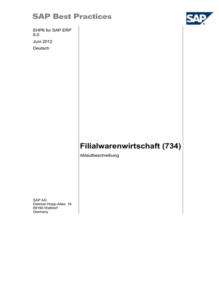 EHP6 for SAP ERP 6.0 Juni 2012 Deutsch Filialwarenwirtschaft (734) Ablaufbeschreibung SAP AG Dietmar-Hopp-Allee. 16 69190 Walldorf Germany SAP Best Practices Filialwarenwirtschaft (734): AB Copyright © 2012 SAP AG. Alle Rechte vorbehalten. SAP, R/3, SAP NetWeaver, Duet, PartnerEdge, ByDesign, SAP BusinessObjects Explorer, StreamWork, SAP HANA und weitere im Text erwähnte SAP-Produkte und -Dienstleistungen sowie die entsprechenden Logos sind Marken oder eingetragene Marken der SAP AG in Deutschland und anderen Ländern. Business Objects und das Business-Objects-Logo, BusinessObjects, Crystal Reports, Crystal Decisions, Web Intelligence, Xcelsius und andere im Text erwähnte Business-Objects-Produkte und -Dienstleistungen sowie die entsprechenden Logos sind Marken oder eingetragene Marken der Business Objects Software Ltd. Business Objects ist ein Unternehmen der SAP AG. Sybase und Adaptive Server, iAnywhere, Sybase 365, SQL Anywhere und weitere im Text erwähnte Sybase-Produkte und -Dienstleistungen sowie die entsprechenden Logos sind Marken oder eingetragene Marken der Sybase Inc. Sybase ist ein Unternehmen der SAP AG. Crossgate, m@gic EDDY, B2B 360°, B2B 360° Services sind eingetragene Marken der Crossgate AG in Deutschland und anderen Ländern. Crossgate ist ein Unternehmen der SAP AG. Alle anderen Namen von Produkten und Dienstleistungen sind Marken der jeweiligen Firmen. Die Angaben im Text sind unverbindlich und dienen lediglich zu Informationszwecken. Produkte können länderspezifische Unterschiede aufweisen. In dieser Publikation enthaltene Informationen können ohne vorherige Ankündigung geändert werden. Die vorliegenden Angaben werden von SAP AG und ihren Konzernunternehmen („SAP-Konzern“) bereitgestellt und dienen ausschließlich Informationszwecken. Der SAP-Konzern übernimmt keinerlei Haftung oder Garantie für Fehler oder Unvollständigkeiten in dieser Publikation. Der SAP-Konzern steht lediglich für Produkte und Dienstleistungen nach der Maßgabe ein, die in der Vereinbarung über die jeweiligen Produkte und Dienstleistungen ausdrücklich geregelt ist. Aus den in dieser Publikation enthaltenen Informationen ergibt sich keine weiterführende Haftung. © SAP AG Seite 2 von 39 SAP Best Practices Filialwarenwirtschaft (734): AB Symbole Symbol Bedeutung Achtung Beispiel Hinweis Empfehlung Syntax Externer Prozess Alternativer Geschäftsprozess/Wahlmöglichkeit Typografische Konventionen Format Beschreibung Beispieltext Wörter oder Zeichen, die vom Bildschirmbild zitiert werden. Dazu gehören Feldbezeichner, Bildtitel, Drucktastenbezeichner sowie Menünamen, Menüpfade und Menüeinträge. Querverweise auf andere Dokumentationen. Beispieltext Hervorgehobene Wörter oder Ausdrücke im Fließtext, Titel von Grafiken und Tabellen. BEISPIELTEXT Namen von Systemobjekten. Dazu gehören Reportnamen, Programmnamen, Transaktionscodes, Tabellennamen und einzelne Schlüsselbegriffe einer Programmiersprache, die von Fließtext umrahmt sind, wie z. B. SELECT und INCLUDE. Beispieltext Ausgabe auf dem Bildschirmbild. Dazu gehören Datei- und Verzeichnisnamen und ihre Pfade, Meldungen, Namen von Variablen und Parametern, Quelltext und Namen von Installations-, Upgrade- und Datenbankwerkzeugen. BEISPIELTEXT Tasten auf der Tastatur, z. B. die Funktionstaste F2 oder die Eingabetaste. Beispieltext Exakte Benutzereingabe. Dazu gehören Wörter oder Zeichen, die Sie genauso in das System eingeben, wie es in der Dokumentation angegeben ist. <Beispieltext> Variable Benutzereingabe. Die Wörter und Zeichen in spitzen Klammern müssen Sie durch entsprechende Eingaben ersetzen, bevor Sie diese in das System eingeben © SAP AG Seite 3 von 39 SAP Best Practices Filialwarenwirtschaft (734): AB Inhalt 1 2 Einsatzmöglichkeiten ............................................................................................................... 5 Voraussetzungen .................................................................................................................... 5 2.1 Stamm- und Organisationsdaten ..................................................................................... 5 2.2 Vorbereitende Schritte ..................................................................................................... 6 2.2.1 Benutzerparameter überprüfen ................................................................................. 6 2.2.2 Personalisierungsframework einrichten .................................................................... 6 2.4 Rollen ............................................................................................................................... 7 3 Prozessübersicht ..................................................................................................................... 7 4 Prozessschritte ........................................................................................................................ 9 4.1 Filialauftrag ....................................................................................................................... 9 4.1.1 Filialauftrag ............................................................................................................... 9 4.1.2 Voraussetzungen .................................................................................................... 10 4.1.3 Filialauftrag anlegen (direkt) ................................................................................... 12 4.1.4 Filialauftrag anlegen (Umlagerung) ........................................................................ 13 4.1.5 Filialauftrag und Lieferant vom System bestimmt ................................................... 14 4.1.6 Ihren Bedarf überarbeiten ....................................................................................... 16 4.1.7 Lieferung zum Filialauftrag (Umlagerung) in SAP ECC anlegen ........................... 16 4.1.8 Warenausgang buchen ..........................................................