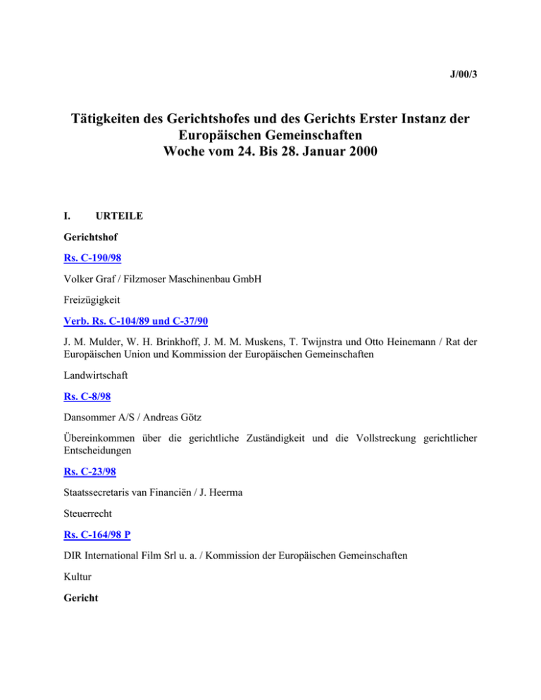 J/00/3 Tätigkeiten des Gerichtshofes und des Gerichts Erster Instanz der Europäischen Gemeinschaften Woche vom 24. Bis 28. Januar 2000 I. URTEILE Gerichtshof Rs. C-190/98 Volker Graf / Filzmoser Maschinenbau GmbH Freizügigkeit Verb. Rs. C-104/89 und C-37/90 J. M. Mulder, W. H. Brinkhoff, J. M. M. Muskens, T. Twijnstra und Otto Heinemann / Rat der Europäischen Union und Kommission der Europäischen Gemeinschaften Landwirtschaft Rs. C-8/98 Dansommer A/S / Andreas Götz Übereinkommen über die gerichtliche Zuständigkeit und die Vollstreckung gerichtlicher Entscheidungen Rs. C-23/98 Staatssecretaris van Financiën / J. Heerma Steuerrecht Rs. C-164/98 P DIR International Film Srl u. a. / Kommission der Europäischen Gemeinschaften Kultur Gericht Rs. T-86/98 Dimitrios Gouloussis / Kommission der Europäischen Gemeinschaften Beamtenstatut Verb. Rs. T-194/97 und T-83/98 Eugénio Branco, Ld.² / Kommission der Europäischen Gemeinschaften Sozialpolitik Rs. T-256/97 Bureau européen des unions de consommateurs (BEUC) / Kommission der Europäischen Gemeinschaften Institutionelles Recht II. SCHLUSSANTRÄGE Rs. C-276/97 Kommission der Europäischen Gemeinschaften / Französische Republik Rs. C-358/97 Kommission der Europäischen Gemeinschaften / Irland Rs. C-359/97 Kommission der Europäischen Gemeinschaften / Vereinigtes Königreich Rs. C-408/97 Kommission der Europäischen Gemeinschaften / Königreich der Niederlande Rs. C-156/98 Bundesrepublik Deutschland / Kommission der Europäischen Gemeinschaften Rs. C-260/98 Kommission der Europäischen Gemeinschaften / Hellenische Republik Rs. C-352/98 P Laboratoires pharmaceutiques Bergaderm SA und Jean-Jacques Goupil / Kommission der Europäischen Gemeinschaften Rs. C-443/98 Unilever Italia SpA / Central Food SpA Rs. C-87/99 Patrick Zurstrassen / Großherzogtum Luxemburg (Administration des contributions directes) Rs. C-195/98 Österreichischer Gewerkschaftsbund, Gewerkschaft öffentlicher Dienst / Republik Österreich Rs. C-301/98 K. V. S. International BV / Minister van Landbouw, Natuurbeheer en Visserij Rs. C-384/98 D/W Rs. C-441/97 P Wirtschaftsvereinigung Stahl, Thyssen Stahl AG, Preussag Stahl AG und Hoogovens Staal BV / Kommission der Europäischen Gemeinschaften Rs. C-1/98 P British Steel Plc / Kommission der Europäischen Gemeinschaften Rs. C-425/98 Marca Mode CV / Adidas AG und Adidas Benelux BV III. NEUE RECHTSSACHEN Gerichtshof IV. MITTEILUNG NEUE ZITIERWEISE DER ARTIKEL DER VERTRÄGE 25 1. URTEILE Gerichtshof Rs. C-190/98 Volker Graf / Filzmoser Maschinenbau GmbH Freizügigkeit 27. Januar 2000 Vorabentscheidung „Freizügigkeit der Arbeitnehmer · Abfertigung (Kündigungsabfindung) · Verweigerung bei Kündigung des Arbeitsvertrags durch einen Arbeitnehmer, der eine unselbständige Tätigkeit in einem anderen Mitgliedstaat ausüben will” (Plenum) Das Oberlandesgericht Linz hat mit Beschluß vom 15. April 1998 eine Frage nach der Auslegung des Artikels 48 EG-Vertrag (nach Änderung jetzt Artikel 39 EG) zur Vorabentscheidung vorgelegt. Diese Frage stellt sich in einem Rechtsstreit zwischen dem deutschen Staatsangehörigen Volker Graf (Kläger) und der Filzmoser Maschinenbau GmbH (Beklagte) mit Sitz in Wels (Österreich) wegen deren Weigerung, dem Kläger die von diesem gemäß § 23 des Angestelltengesetzes (AngG) beanspruchte Abfertigung (Kündigungsabfindung) zu zahlen, nachdem er den Arbeitsvertrag mit der Beklagten gekündigt hatte, um in Deutschland eine Arbeit aufzunehmen. Der Kläger kündigte mit Schreiben vom 29. Februar 1996 den am 3. August 1992 mit der Beklagten geschlossenen Arbeitsvertrag, um nach Deutschland überzusiedeln und dort ab 1. Mai 1996 eine neue Beschäftigung aufzunehmen. Die Beklagte weigerte sich unter Berufung auf § 23 Absatz 7 AngG, dem Kläger die von diesem nach § 23 Absatz 1 AngG geforderte Abfertigung in Höhe von zwei Monatsentgelten zu zahlen. Der Kläger verklagte daraufhin seinen ehemaligen Arbeitgeber beim Landesgericht Wels auf Zahlung der Abfertigung. Er machte insbesondere geltend, daß § 23 Absatz 7 AngG gegen Artikel 48 EG-Vertrag verstoße. Das Landesgericht Wels wies die Klage mit Urteil vom 4. Februar 1998 ab. Der Kläger legte gegen das Urteil des Landesgerichts Wels Berufung beim Oberlandesgericht Linz ein. Das Oberlandesgericht Linz hat das Verfahren ausgesetzt und dem Gerichtshof eine Frage zur Vorabentscheidung vorgelegt. Nach Auffassung des Gerichtshofes geht die Frage des vorlegenden Gerichts dahin, ob Artikel 48 EG-Vertrag einer nationalen Regelung entgegensteht, nach der ein Arbeitnehmer, der sein Arbeitsverhältnis selbst kündigt, um in einem anderen Mitgliedstaat eine unselbständige Tätigkeit auszuüben, keinen Anspruch auf eine Abfertigung hat, während einem Arbeitnehmer, dessen Arbeitsverhältnis endet, ohne daß er selbst diese Beendigung herbeigeführt oder zu vertreten hat, eine derartige Abfertigung zusteht. Der Gerichtshof stellt fest, daß eine Regelung wie die, um die es im Ausgangsverfahren geht, unabhängig von der Staatsangehörigkeit des betroffenen Arbeitnehmers anwendbar ist. Des weiteren versagt sie den Abfertigungsanspruch jedem Arbeitnehmer, der den Arbeitsvertrag selbst beendet, um eine unselbständige Tätigkeit bei einem neuen Arbeitgeber aufzunehmen, unabhängig davon, ob dieser seinen Sitz in demselben Mitgliedstaat wie der vorige Arbeitgeber oder in einem anderen Mitgliedstaat hat. Deshalb läßt sich nicht sagen, daß die Regelung ausländische Arbeitnehmer in stärkerem Maße berührt als inländische und deshalb vor allem die ersteren zu benachteiligen droht. Eine Regelung wie die im Ausgangsverfahren streitige ist eindeutig nicht geeignet, den Arbeitnehmer daran zu hindern oder davon abzuhalten, sein Arbeitsverhältnis zu beenden, um eine unselbständige Tätigkeit bei einem anderen Arbeitgeber auszuüben, denn der Abfertigungsanspruch hängt nicht von der Entscheidung des Arbeitnehmers ab, ob er bei seinem derzeitigen Arbeitgeber bleibt oder n