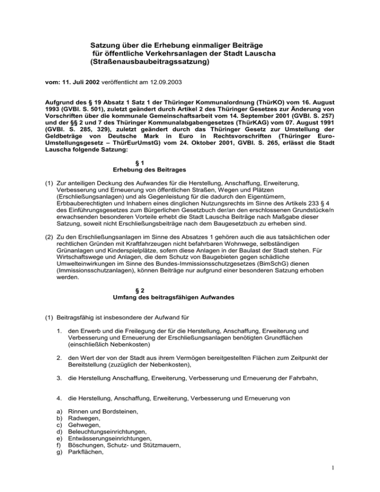 Satzung über die Erhebung einmaliger Beiträge für öffentliche Verkehrsanlagen der Stadt Lauscha (Straßenausbaubeitragssatzung) vom: 11. Juli 2002 veröffentlicht am 12.09.2003 Aufgrund des § 19 Absatz 1 Satz 1 der Thüringer Kommunalordnung (ThürKO) vom 16. August 1993 (GVBl. S. 501), zuletzt geändert durch Artikel 2 des Thüringer Gesetzes zur Änderung von Vorschriften über die kommunale Gemeinschaftsarbeit vom 14. September 2001 (GVBl. S. 257) und der §§ 2 und 7 des Thüringer Kommunalabgabengesetzes (ThürKAG) vom 07. August 1991 (GVBl. S. 285, 329), zuletzt geändert durch das Thüringer Gesetz zur Umstellung der Geldbeträge von Deutsche Mark in Euro in Rechtsvorschriften (Thüringer EuroUmstellungsgesetz – ThürEurUmstG) vom 24. Oktober 2001, GVBl. S. 265, erlässt die Stadt Lauscha folgende Satzung: §1 Erhebung des Beitrages (1) Zur anteiligen Deckung des Aufwandes für die Herstellung, Anschaffung, Erweiterung, Verbesserung und Erneuerung von öffentlichen Straßen, Wegen und Plätzen (Erschließungsanlagen) und als Gegenleistung für die dadurch den Eigentümern, Erbbauberechtigten und Inhabern eines dinglichen Nutzungsrechts im Sinne des Artikels 233 § 4 des Einführungsgesetzes zum Bürgerlichen Gesetzbuch der/an den erschlossenen Grundstücke/n erwachsenden besonderen Vorteile erhebt die Stadt Lauscha Beiträge nach Maßgabe dieser Satzung, soweit nicht Erschließungsbeiträge nach dem Baugesetzbuch zu erheben sind. (2) Zu den Erschließungsanlagen im Sinne des Absatzes 1 gehören auch die aus tatsächlichen oder rechtlichen Gründen mit Kraftfahrzeugen nicht befahrbaren Wohnwege, selbständigen Grünanlagen und Kinderspielplätze, sofern diese Anlagen in der Baulast der Stadt stehen. Für Wirtschaftswege und Anlagen, die dem Schutz von Baugebieten gegen schädliche Umwelteinwirkungen im Sinne des Bundes-Immissionsschutzgesetzes (BimSchG) dienen (Immissionsschutzanlagen), können Beiträge nur aufgrund einer besonderen Satzung erhoben werden. §2 Umfang des beitragsfähigen Aufwandes (1) Beitragsfähig ist insbesondere der Aufwand für 1. den Erwerb und die Freilegung der für die Herstellung, Anschaffung, Erweiterung und Verbesserung und Erneuerung der Erschließungsanlagen benötigten Grundflächen (einschließlich Nebenkosten) 2. den Wert der von der Stadt aus ihrem Vermögen bereitgestellten Flächen zum Zeitpunkt der Bereitstellung (zuzüglich der Nebenkosten), 3. die Herstellung Anschaffung, Erweiterung, Verbesserung und Erneuerung der Fahrbahn, 4. die Herstellung, Anschaffung, Erweiterung, Verbesserung und Erneuerung von a) b) c) d) e) f) g) Rinnen und Bordsteinen, Radwegen, Gehwegen, Beleuchtungseinrichtungen, Entwässerungseinrichtungen, Böschungen, Schutz- und Stützmauern, Parkflächen, 1 h) Unselbständigen Grünanlagen. (2) Die Fahrbahnen der Ortsdurchfahrten von Bundes-, Landes und Kreisstraßen sind nur insoweit beitragsfähig, als sie breiter sind als die anschließenden freien Strecken. (3) Nicht beitragsfähig sind die Kosten 1. für die laufende Unterhaltung und Instandsetzung der in § 1 genannten Erschließungsanlagen, 2. für Hoch- und Tiefstraßen sowie für Straßen, die für den Schnellverkehr mit Kraftfahrzeugen bestimmt sind (Schnellverkehrsstraßen), ferner Brücken, Tunnels und Unterführungen mit den dazugehörigen Rampen. §3 Ermittlung des beitragsfähigen Aufwandes Der beitragsfähige Aufwand wird nach den tatsächlichen Aufwendungen ermittelt. §4 Anteil der Stadt und der Beitragspflichtigen am Aufwand (1) Stadt trägt den Teil des Aufwandes, der a) auf die Inanspruchnahme der Erschließungsanlagen durch die Allgemeinheit entfällt, b) bei der Verteilung des Aufwandes nach § 5 auf ihre eigenen Grundstücke entfällt. (2) Überschreiten Erschließungsanlagen die nach Absatz 3 anrechenbaren Breiten, so trägt die Stadt den durch die Überschreitung verursachten Mehraufwand allein. Bei den Bundes-, Landes- und Kreisstraßen beziehen sich die anrechenbaren Breiten der Fahrbahnen auf die Breite, die über die beitragsfreie Fahrbahnbreite nach § 2 Absatz 2 hinausgeht. (3) Der Anteil der Beitragspflichtigen am Aufwand nach Absatz 1 Satz 2 und die anrechenbaren Breiten der Erschließungsanlagen werden wie folgt festgesetzt: 1. bei Straßen, die überwiegend der Erschließung der angrenzenden oder durch private Zuwegung mit ihnen verbundenen Grundstücke dienen (Anliegerstraße) Anrechenbare Breite Anrechenbare Breite Anteil der Beitragspflichtigen Teileinrichtung Fahrbahn Radweg einschl. Sicherheitsstreifen Parkstreifen Gehweg Beleuchtung und Oberflächenentwässeru ng Unselbständige Grünanlagen bzw. Straßenbegleitgrün I(*) 8,50 m Je 1,75 m II (*) 5,50 m Je 1,75 m 65 % 65 % Je 5,00 m Je 2,50 m ./. Je 5,00 m Je 2,50 m ./. 75 % 75 % 65 % Je 2,00 m Je 2,00 m 55 % 2 2. bei Straßen, die der Erschließung von Grundstücken und gleichzeitig dem Verkehr innerhalb von Baugebieten oder innerhalb von im Zusammenhang bebauten Ortsteilen dienen, soweit sie nicht Hauptverkehrsstraßen sind nach Ziffer 3 sind (Haupterschließungsstraßen) Teileinrichtungen Fahrbahn Radweg einschl. Sicherheitsstreifen Parkstreifen Gehweg Beleuchtung und Oberflächenentwässeru ng Unselbständige Grünanlagen bzw. Straßenbegleitgrün Anrechenbare Breite I(*) Anrechenbare Breite II(*) 8,50 m Je 1,75 m 6,50 m Je 1,75 m Anteil der Beitragspflichtigen 45 % 45 % Je 5,00 m Je 2,50 m ./. Je 5,00 m Je 2,50 ./. 60 % 60 % 60 % Je 2,00 m Je 2,00 m 55 % 3. bei Straßen, die überwiegend dem durchgehenden innerörtlichen Verkehr oder dem überörtlichen Durchgangsverkehr dienen, insbesondere Bundes-, Landes- und Kreisstraßen (Hauptverkehrsstraßen). Teileinrichtung Fahrbahn Radweg einschl. Sicherheitsstreifen Parkstreifen Gehweg Beleuchtung und Oberflächenentwässeru ng Unselbständige Grünanlagen bzw. Straßenbegleitgrün Anrechenbare Breite I(*) Anrechenbare Breite II(*) 8,50 m Je 1,75 m 8,50 m Je 1,75 m Anteil der Beitragspflichtigen 25 % 25 % Je 5,00 m Je 2,50 m ./