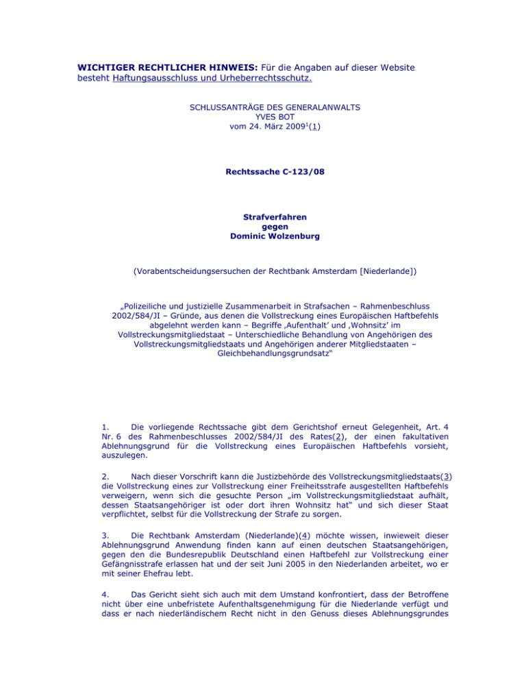 WICHTIGER RECHTLICHER HINWEIS: Für die Angaben auf dieser Website besteht Haftungsausschluss und Urheberrechtsschutz. SCHLUSSANTRÄGE DES GENERALANWALTS YVES BOT vom 24. März 20091(1) Rechtssache C-123/08 Strafverfahren gegen Dominic Wolzenburg (Vorabentscheidungsersuchen der Rechtbank Amsterdam [Niederlande]) „Polizeiliche und justizielle Zusammenarbeit in Strafsachen – Rahmenbeschluss 2002/584/JI – Gründe, aus denen die Vollstreckung eines Europäischen Haftbefehls abgelehnt werden kann – Begriffe ‚Aufenthalt’ und ‚Wohnsitz’ im Vollstreckungsmitgliedstaat – Unterschiedliche Behandlung von Angehörigen des Vollstreckungsmitgliedstaats und Angehörigen anderer Mitgliedstaaten – Gleichbehandlungsgrundsatz“ 1. Die vorliegende Rechtssache gibt dem Gerichtshof erneut Gelegenheit, Art. 4 Nr. 6 des Rahmenbeschlusses 2002/584/JI des Rates(2), der einen fakultativen Ablehnungsgrund für die Vollstreckung eines Europäischen Haftbefehls vorsieht, auszulegen. 2. Nach dieser Vorschrift kann die Justizbehörde des Vollstreckungsmitgliedstaats(3) die Vollstreckung eines zur Vollstreckung einer Freiheitsstrafe ausgestellten Haftbefehls verweigern, wenn sich die gesuchte Person „im Vollstreckungsmitgliedstaat aufhält, dessen Staatsangehöriger ist oder dort ihren Wohnsitz hat“ und sich dieser Staat verpflichtet, selbst für die Vollstreckung der Strafe zu sorgen. 3. Die Rechtbank Amsterdam (Niederlande)(4) möchte wissen, inwieweit dieser Ablehnungsgrund Anwendung finden kann auf einen deutschen Staatsangehörigen, gegen den die Bundesrepublik Deutschland einen Haftbefehl zur Vollstreckung einer Gefängnisstrafe erlassen hat und der seit Juni 2005 in den Niederlanden arbeitet, wo er mit seiner Ehefrau lebt. 4. Das Gericht sieht sich auch mit dem Umstand konfrontiert, dass der Betroffene nicht über eine unbefristete Aufenthaltsgenehmigung für die Niederlande verfügt und dass er nach niederländischem Recht nicht in den Genuss dieses Ablehnungsgrundes kommen kann, da die Rechtspraxis, wonach die Übergabe eines niederländischen Staatsangehörigen zur Vollstreckung einer Strafe zu verweigern ist, auf Angehörige anderer Mitgliedstaaten nur dann ausgedehnt wird, wenn diese im Besitz einer solchen Aufenthaltsgenehmigung sind. 5. Das Gericht möchte daher erstens wissen, wie lange sich eine Person, gegen die ein Europäischer Haftbefehl ergangen ist, im Vollstreckungsmitgliedstaat aufgehalten haben muss, um in diesem Staat ihren Aufenthalt oder Wohnsitz im Sinne des Art. 4 Nr. 6 des Rahmenbeschlusses zu begründen. 6. Zweitens fragt es, ob die Anwendung dieses Ablehnungsgrundes von der Erfüllung zusätzlicher verwaltungsrechtlicher Anforderungen wie dem Besitz einer unbefristeten Aufenthaltsgenehmigung abhängig gemacht werden kann. 7. Das vorlegende Gericht fragt drittens, ob der Grundsatz der Nichtdiskriminierung einer nationalen Regelung entgegensteht, wonach die Rechtspraxis, die Übergabe eigener Staatsangehöriger zur Vollstreckung einer Strafe zu verweigern, auf Angehörige anderer Mitgliedstaaten nur dann ausgedehnt wird, wenn diese im Besitz einer unbefristeten Aufenthaltsgenehmigung sind. 8. Diese drei Fragen ähneln sehr den Vorlagefragen, die vor einem anderen Hintergrund in der Rechtssache Kozłowski, in der das Urteil am 17. Juli 2008(5) nach Eingang des vorliegenden Vorabentscheidungsersuchens ergangen ist, gestellt wurden. 9. In diesem Urteil hat der Gerichtshof die Begriffe „Aufenthalt“ und „Wohnsitz“ im Vollstreckungsmitgliedstaat im Sinne des Art. 4 Nr. 6 des Rahmenbeschlusses ausgelegt. Er hat außerdem die zweite Frage, ob die Anwendung des in dieser Vorschrift vorgesehenen Ablehnungsgrundes von der Erfüllung weiterer Anforderungen wie einer nationalen Aufenthaltsgenehmigung abhängig gemacht werden kann, im Kern beantwortet. Dagegen hat er sich nicht zu der letzten Frage geäußert, ob eine nationale Regelung, die die Übergabe eines eigenen Staatsangehörigen und nicht die Übergabe eines Staatsangehörigen eines anderen Mitgliedstaates verbietet, mit dem Grundsatz der Nichtdiskriminierung in Einklang steht. 10. Das vorliegende Verfahren gibt dem Gerichtshof Ausführungen im Urteil Kozłowski zur Auslegung von Rahmenbeschlusses weiter zu verfeinern und zu vervollständigen. Gelegenheit, seine Art. 4 Nr. 6 des 11. Zur ersten Frage des vorlegenden Gerichts werde ich dem Gerichtshof vorschlagen, bei den Begriffen „Wohnsitz“ und „Aufenthalt“ entscheidend darauf abzustellen, ob die von einem Europäischen Haftbefehl betroffene Person mit dem Vollstreckungsmitgliedstaat durch hinreichend enge Beziehungen verbunden ist, die den Schluss erlauben, dass eine Strafvollstreckung in diesem Staat die Chancen der Person auf eine Resozialisierung erhöht. Ich werde darlegen, dass das zuständige Gericht im Rahmen der Sachverhaltswürdigung die Aufenthaltsdauer in diesem Staat als ein gewichtiges Indiz zu werten hat. 12. Für die Beantwortung der zweiten Frage werde ich dem Gerichtshof vorschlagen, dass die Anwendung des Ablehnungsgrundes in Art. 4 Nr. 6 des Rahmenbeschlusses nicht von der Erfüllung zusätzlicher verwaltungsrechtlicher Anforderungen wie dem Besitz einer unbefristeten Aufenthaltsgenehmigung abhängig gemacht werden darf. 13. Als Antwort auf die dritte Frage des vorlegenden Gerichts werde ich dem Gerichtshof vorschlagen, festzustellen, dass das nationale Recht im vorliegenden Fall gegen den Grundsatz der Nichtdiskriminierung des Art. 12 EG verstößt. 14. Vorab erläutere ich nachstehend die wesentlichen Grundsätze, auf die in der Folge Bezug genommen wird und an denen sich die Begründung orientiert: – Das durch den Rahmenbeschluss eingeführte Verfahren des Europäischen Haftbefehls hat zwischen den Mitgliedstaaten das Auslieferungsverfahren ersetzt. Das Auslieferungsverfahren hat weiterhin Bestand im Rahmen der Zusammenarbeit mit Drittstaaten sowie zwischen den Mitgliedstaaten in den Fällen, in denen das Verfahren des Europäisc