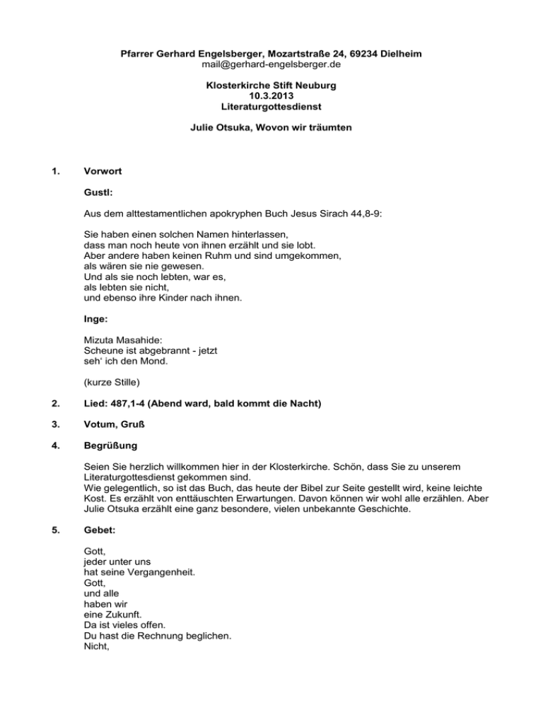 Pfarrer Gerhard Engelsberger, Mozartstraße 24, 69234 Dielheim [email protected] Klosterkirche Stift Neuburg 10.3.2013 Literaturgottesdienst Julie Otsuka, Wovon wir träumten 1. Vorwort Gustl: Aus dem alttestamentlichen apokryphen Buch Jesus Sirach 44,8-9: Sie haben einen solchen Namen hinterlassen, dass man noch heute von ihnen erzählt und sie lobt. Aber andere haben keinen Ruhm und sind umgekommen, als wären sie nie gewesen. Und als sie noch lebten, war es, als lebten sie nicht, und ebenso ihre Kinder nach ihnen. Inge: Mizuta Masahide: Scheune ist abgebrannt - jetzt seh‘ ich den Mond. (kurze Stille) 2. Lied: 487,1-4 (Abend ward, bald kommt die Nacht) 3. Votum, Gruß 4. Begrüßung Seien Sie herzlich willkommen hier in der Klosterkirche. Schön, dass Sie zu unserem Literaturgottesdienst gekommen sind. Wie gelegentlich, so ist das Buch, das heute der Bibel zur Seite gestellt wird, keine leichte Kost. Es erzählt von enttäuschten Erwartungen. Davon können wir wohl alle erzählen. Aber Julie Otsuka erzählt eine ganz besondere, vielen unbekannte Geschichte. 5. Gebet: Gott, jeder unter uns hat seine Vergangenheit. Gott, und alle haben wir eine Zukunft. Da ist vieles offen. Du hast die Rechnung beglichen. Nicht, 2 damit wir neue Schulden machen. Sondern, dass wir aufrecht gehen und leben lernen ohne Angst. Amen. 6. Lied: 636,1-3 (Ach lass mich weise werden) 7. Die Geschichte – und die sie erzählt: Julie Otsuka Julie Otsuka ist 50 Jahre alt, als Kind japanischer Eltern in Kalifornien aufgewachsen und in den USA ausgebildet. Sie geht in dem Buch „Wovon wir träumten“ auf Spurensuche. Es ist ihr zweiter Roman und der erste, der auf Deutsch erschienen ist. Sie war mit diesem zweiten Roman unter den Finalisten für den nationalen amerikanischen Buchpreis und gewann den international sehr angesehenen Pen/Faulkner-Preis 2012. Es ist eine minutiös recherchierte, eine wahre Geschichte, die sie erzählt. Ich habe Ihnen auf dem Liedblatt in kurzen Begriffen den Ablauf des Vorgelesenen notiert, der nur durch jeweils einen musikalischen Gedanken Christophs unterbrochen wird. Anfang des 20. Jahrhunderts suchen in den USA japanische Einwanderer nach Frauen. Sie schicken Bewerbungen und Bilder nach Japan. Eine Gruppe junger Japanerinnen überquert den Ozean, um in Amerika zu heiraten. Doch sie kennen ihre zukünftigen Ehemänner nur über die Hinweise der Heiratsvermittler. 8. Lied: 643,1-3 (Fürchte dich nicht) 9. Wovon wir träumten Inge: Auf dem Schiff waren die meisten von uns Jungfrauen. Wir hatten langes schwarzes Haar und flache, breite Füße, und wir waren nicht sehr groß. Einige von uns hatten als junge Mädchen nichts als Reisbrei gegessen und hatten leicht krumme Beine, und einige von uns waren erst vierzehn Jahre alt und selbst noch junge Mädchen. Einige von uns kamen aus der Stadt und trugen modische Stadtkleider, doch überwiegend kamen wir vom Land, und auf dem Schiff trugen wir dieselben alten Kimonos, die wir seit Jahren getragen hatten. Einige von uns kamen aus den Bergen und hatten noch nie das Meer gesehen, außer auf Bildern, und einige von uns waren Fischerstöchter, die ihr ganzes Leben in Meeresnähe verbracht hatten. Das Erste, was wir auf dem Schiff machten …, war, die Fotos unserer Ehemänner zu vergleichen. Es waren gut aussehende junge Männer mit dunklen Augen und vollem Haar und glatter, makelloser Haut. Ihre Kinnpartien waren ausgeprägt. Ihre Haltung: gut. Ihre Nasen waren gerade und lang. Sie sahen aus wie unsere Brüder und Väter zu Hause, nur besser angezogen, in grauen Gehröcken und feinen westlichen Dreiteilern. Einige von ihnen standen auf Gehwegen, vor Holzhäusern mit weißen Lattenzäunen und frisch gemähten Vorgärten, und einige posierten in Einfahrten, an ihren Ford Modell T gelehnt. Einige saßen in Studios auf steifen Stühlen mit hoher Lehne, die Hände sauber gefaltet, den Blick direkt in die Kamera gerichtet, als seien sie bereit, die Weltherrschaft zu übernehmen. Ein jeder von ihnen hatte versprochen, da zu sein, auf uns zu warten, in San Francisco, wenn wir in den Hafen einliefen. Die meisten von uns auf dem Schiff waren wohlerzogen und überzeugt, dass sie gute Ehefrauen sein würden. Wir konnten kochen und nähen. Wir konnten Tee servieren und Blumen arrangieren und stundenlang still auf unseren flachen, breiten Füßen sitzen, ohne je etwas von uns zu geben, das von Belang war. 3 Wir konnten Unkraut jäten und Kleinholz hacken und Wasser holen. Die meisten von uns hatten gute Manieren und waren überaus höflich, außer wenn sie wütend wurden und fluchten wie die Bierkutscher. Christoph: Musikalischer Gedanke Gustl: Ich habe ein schönes Haus gekauft. Du kannst im Garten Tulpen pflanzen. Osterglocken. Was immer Du willst. Ich besitze eine Farm. Ich führe ein Hotel. Ich bin der Vorsitzende einer großen Bank. Ich habe Japan vor mehreren Jahren verlassen, um meine eigene Firma zu gründen, und kann gut für Dich sorgen. Ich bin 1,79 groß und leide weder unter Aussatz noch unter einer Lungenkrankheit, und es gibt auch keine Fälle von Geistesgestörtheit in meiner Familie. Ich stamme aus Okayama. Aus Hyogo. Aus Miyagi. Aus Shizuoka. Ich bin in einem Dorf in Deiner Nähe groß geworden und habe Dich vor vielen Jahren einmal auf dem Markt gesehen. Ich schicke Dir das Geld für die Überfahrt, sobald ich kann. Christoph: Musikalischer Gedanke 10. … dass man noch heute von ihnen erzählt Inge Enttäuschte Erwartungen Auf dem Schiff konnten wir nicht wissen, dass wir, wenn wir unsere Ehemänner zum ersten Mal sehen würden, keine Ahnung hätten, wer sie waren. Dass die Meute von Männern mit ihren Wollmützen und schäbigen schwarzen Mänteln, die unten auf der Pier auf uns wartete, keine Ähnlichkeit mit den gut aussehenden jungen Männern auf den Fotos haben würde. Dass die Fotos, die man uns geschickt hatte, zwanzig Jahre alt waren. Dass die Briefe, die man uns geschrieben hatte, von Menschen geschrieben wurden, die nicht unsere 