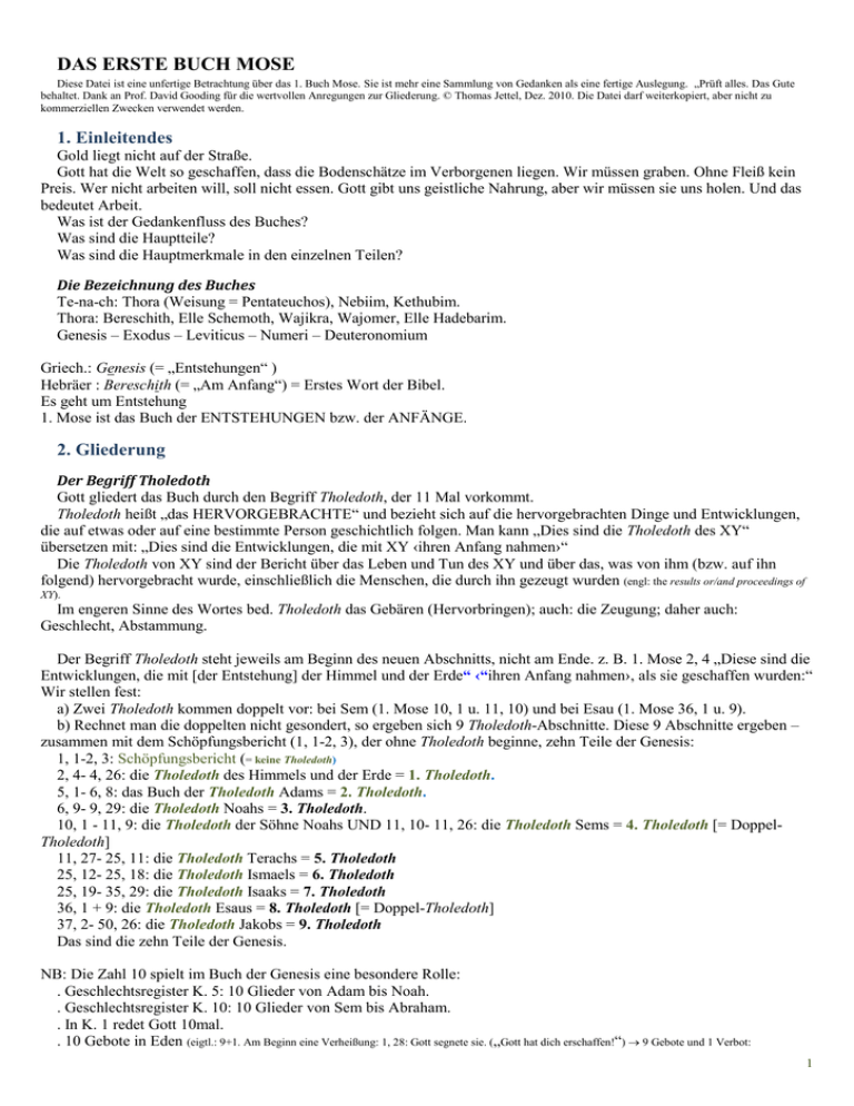 Diese Datei ist eine unfertige Betrachtung über das 1. Buch Mose. Sie ist mehr eine Sammlung von Gedanken als eine fertige Auslegung. „Prüft alles. Das Gute