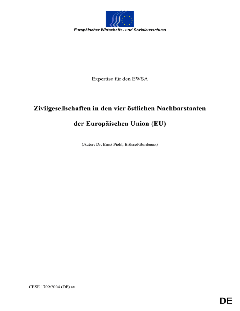Europäischer Wirtschafts- und Sozialausschuss Expertise für den EWSA Zivilgesellschaften in den vier östlichen Nachbarstaaten der Europäischen Union (EU) (Autor: Dr. Ernst Piehl, Brüssel/Bordeaux) CESE 1709/2004 (DE) av DE -1INHALTSVERZEICHNIS VORWORT (Karin Alleweldt, Mitglied und Berichterstatterin im EWSA) 3 VORBEMERKUNG des Autors 4 A. 5 EINLEITUNG - B. Ausgangsdokumente des EWSA Begriffserklärung "Zivilgesellschaft" und Anwendung des Begriffs im EWSA Konzentration auf die östlichen Nachbarn der erweiterten EU Hauptfragen und Kernpunkte in den Kurz-Analysen der vier Länder Etappe im langwierigen Transformations- und Integrationsprozess Europas LÄNDERANALYSEN 8 1. 8 RUSSLAND Porträt 1.1 Hintergrund, spezifische Bedingungen und aktuelle Lage 1.2 Gewerkschaften/Arbeitnehmerorganisationen 1.3 Arbeitgeber- und Unternehmerverbände sowie informelle Wirtschaftsclans ("Oligarchen") 1.4 Andere Interessenvertretungen der Zivilgesellschaft/NichtRegierungs-Organisationen (NRO) 1.5 Fazit und Ausblick 2. UKRAINE Porträt 2.1 Hintergrund, spezifische Bedingungen und aktuelle Lage 2.2 Gewerkschaften/Arbeitnehmerorganisationen 2.3 Arbeitgeberverbände und Unternehmerclans (Oligarchen) 2.4 Andere Interessenvertretungen der Zivilgesellschaft/NichtRegierungs-Organisationen (NRO) 2.5 Fazit und Ausblick 3. WEISSRUSSLAND UND ZIVILGESELLSCHAFT Porträt 3.1 Hintergrund, besondere Bedingungen und aktuelle Lage 3.2 Arbeitnehmerorganisationen/Gewerkschaften 3.3 Arbeitgeberverbände/Organisierte Unternehmerschaft 3.4 Nicht-Regierungs-Organisationen (NRO) als Hoffnungsträger im autoritären Staat mit einem Präsidenten auf Lebenszeit 3.5 Fazit und Ausblick CESE 1709/2004 (DE) av 8 9 11 13 15 22 22 24 26 28 31 38 38 40 42 43 45 .../... -24. C. MOLDAU UND ZIVILGESELLSCHAFT 53 Porträt 4.1 Basisinformationen, Aktueller Überblick und spezifische Bedingungen für zivilgesellschaftliches Handeln 4.2 Arbeitnehmerganisationen/Gewerkschaften 4.3 Arbeitgeberverbände und Unternehmensrepräsentanz 4.4 Nicht-Regierungs-Organisationen (NRO) 4.5 Fazit und Ausblick 53 54 56 57 58 GESAMT–KONKLUSIONEN UND ANREGUNGEN 64 1. GESAMT–KONKLUSIONEN 64 1.1 1.2 64 1.3 2. Generell Konklusionen in Bezug auf die organisierte Zivilgesellschaft der Sozialpartner Vergleichende Konklusionen in Bezug auf die NichtRegierungs-Organisationen ANREGUNGEN UND VORSCHLÄGE 65 67 68 ANHANG Abkürzungen 75 Bibliographie 78 Kurz – CV des Autors 84 CESE 1709/2004 (DE) av .../... -3VORWORT Als die EU-Erweiterung vom Mai 2004 nach Jahren der Verhandlungen endlich "beschlossene Sache" war, richtete sich der Blick auf die neuen EU-Nachbarstaaten. Die Grenzen, die wir mit der Erweiterung überwinden, schaffen zugleich neue. Sie reißen andere Grenzregionen und Länder auseinander, die zuvor wirtschaftlich und menschlich miteinander verbunden waren. Diese neuen Grenzen sollten Europa nicht erneut spalten. Mit dieser Zielsetzung begann der EWSA Anfang 2003 seine Arbeit zum Thema "Größeres Europa – Nachbarschaft: Ein neuer Rahmen für die Beziehungen der EU zu ihren östlichen und südlichen Nachbarn". Es erstaunte mich damals, wie wenig Aufmerksamkeit der EWSA auf Osteuropa richtete. Zu vielen Regionen in der Welt bestehen intensive, sehr fruchtbare Arbeitskontakte. Allein, die unmittelbaren Nachbarstaaten an den neuen EU-Außengrenzen im Osten blieben wenig beachtet. Darin liegt keine Wertung. Ich bin davon überzeugt, dass einzig das Fehlen eines intensiven kulturellen Austausches zwischen diesen Ländern und den alten EU-Mitgliedstaaten in den vergangenen Jahrzehnten den Grund dafür lieferte. Dies haben wir nun im EWSA geändert, nicht zuletzt weil die Mitglieder aus den neuen EU-Staaten unsere Erfahrungen in dieser Hinsicht bereichert haben. Aus den Gesprächen mit den zivilgesellschaftlichen Organisationen in Belarus, der Ukraine, der Republik Moldau und der Russischen Föderation im Jahre 2003 und vor dem Hintergrund der kontinuierlichen Arbeit der neuen Kontaktgruppe "Östliche Nachbarstaaten" des EWSA gaben wir die vorliegende Expertise in Auftrag. Ernst Piehl hat uns als Sachverständiger während der Arbeit zur ersten Stellungnahme zur Verfügung gestanden und es wurde rasch deutlich, dass wir ein aktuelles Kompendium "unserer" Ansprechpartner und der spezifischen Strukturen und Voraussetzungen des sozialen und zivilen Dialogs in den betreffenden Ländern zusammenstellen müssten, als Grundlage für unseren Dialog. Diese Studie sollte kurz sein, informativ, Verständnis füreinander aufbauen und als Einstieg und zur raschen Orientierung dienen. Es ist Ernst Piehl gelungen, dies mit einem Gespür zum Detail und kritischen Bewertungen zu verbinden, die vielleicht nicht jede/r teilt, aber die damit hervorragend zum Nachdenken anregen. Karin Alleweldt CESE 1709/2004 (DE) av Berlin, 25. November 2004 .../... -4VORBEMERKUNG des Autors Diese Expertise soll vorrangig als Information und Diskussionsvorlage für die am 19. Januar 2005 stattfindende Konferenz des Europäischen Wirtschafts- und Sozialausschusses in Brüssel dienen. Beide Vorhaben des EWSA wollen sowohl zur besseren Kenntnis über "Die Zivilgesellschaften in den östlichen Nachbarländern" als auch zur Vernetzung transnationaler Kontakte unter den zivilgesellschaftlichen Akteuren beitragen. Damit diese Vorlage rechtzeitig in drei Arbeitssprachen der EU und in die drei Amtssprachen der vier östlichen Nachbarn übersetzt und rechtzeitig den Teilnehmern zugesandt werden konnte, war am 25.11.2004 Redaktionsschluss. So konnte nur noch die Rolle der Zivilgesellschaften beim Beginn der "Orange Revolution" in der Ukraine im Kontext der weichenstellenden Präsidentenwahlen in der Ukraine angedeutet, nicht mehr in all ihren Auswirkungen analysiert werden. Die eingetretenen Ereignisse haben eindrucksvoll bestätigt, welch aktuelles und wichtiges Thema der EWSA lange vor den historischen Ereignissen in der Ukraine gewählt hatte. Mein erster Dank gilt Frau Karin Alleweldt, die als Mitglied