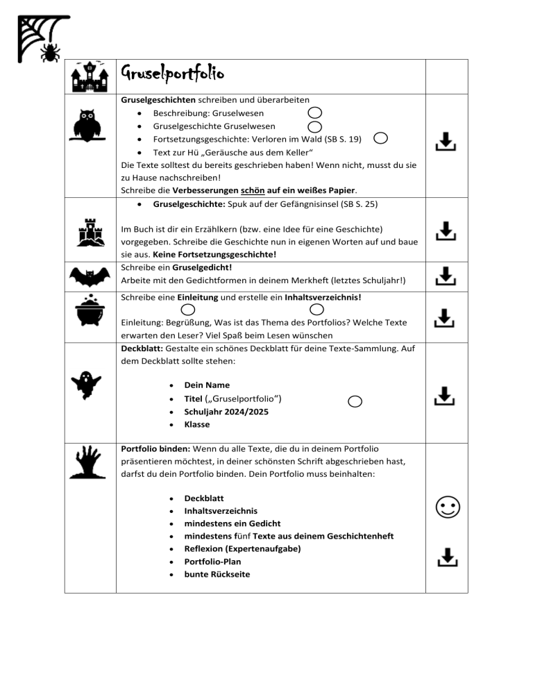 Gruselportfolio Gruselgeschichten schreiben und überarbeiten Beschreibung: Gruselwesen Gruselgeschichte Gruselwesen Fortsetzungsgeschichte: Verloren im Wald (SB S. 19) Text zur Hü „Geräusche aus dem Keller“ Die Texte solltest du bereits geschrieben haben! Wenn nicht, musst du sie zu Hause nachschreiben! Schreibe die Verbesserungen schön auf ein weißes Papier. Gruselgeschichte: Spuk auf der Gefängnisinsel (SB S. 25) Im Buch ist dir ein Erzählkern (bzw. eine Idee für eine Geschichte) vorgegeben. Schreibe die Geschichte nun in eigenen Worten auf und baue sie aus. Keine Fortsetzungsgeschichte! Schreibe ein Gruselgedicht! Arbeite mit den Gedichtformen in deinem Merkheft (letztes Schuljahr!) Schreibe eine Einleitung und erstelle ein Inhaltsverzeichnis! Einleitung: Begrüßung, Was ist das Thema des Portfolios? Welche Texte erwarten den Leser? Viel Spaß beim Lesen wünschen Deckblatt: Gestalte ein schönes Deckblatt für deine Texte-Sammlung. Auf dem Deckblatt sollte stehen: Dein Name Titel („Gruselportfolio“) Schuljahr 2024/2025 Klasse Portfolio binden: Wenn du alle Texte, die du in deinem Portfolio präsentieren möchtest, in deiner schönsten Schrift abgeschrieben hast, darfst du dein Portfolio binden. Dein Portfolio muss beinhalten: Deckblatt Inhaltsverzeichnis mindestens ein Gedicht mindestens fünf Texte aus deinem Geschichtenheft Reflexion (Expertenaufgabe) Portfolio-Plan bunte Rückseite Alle Texte für dein Portfolio müssen sauber auf ein weißes Blatt geschrieben werden. Gerne darfst und sollst du dein Portfolio mit Zeichnungen verzieren und schön gestalten. Die Expertenaufgaben findest du auf der Rückseite! Expertenaufgaben Schreibe eine Reflexion! Folgendes kann in deiner Reflexion vorkommen: Hat dir das Schreiben der Gruselgeschichten Spaß gemacht? Was ist dir schwergefallen? Was ist dir leichtgefallen? Hat dir die Arbeit am Portfolio gefallen oder nicht? Gruselgeschichte – Erzählplan (SB S. 23) Ergänze die Tabelle und erzähle die geplante Geschichte einer Lehrperson. Schreibe deine Gruselgeschichte in dein Texteheft! Schreibe die Verbesserung schön auf ein weißes Papier. Weitere Gruselgeschichten Würfelgeschichte (SB S. 22) Hatices Heimweg (SB S. 27) Fortsetzungsgeschichte Friedhof des Schreckens (AH S. 10) Erfinde einen Zauberspruch! Sprachbuch: S. 21, NR. 36