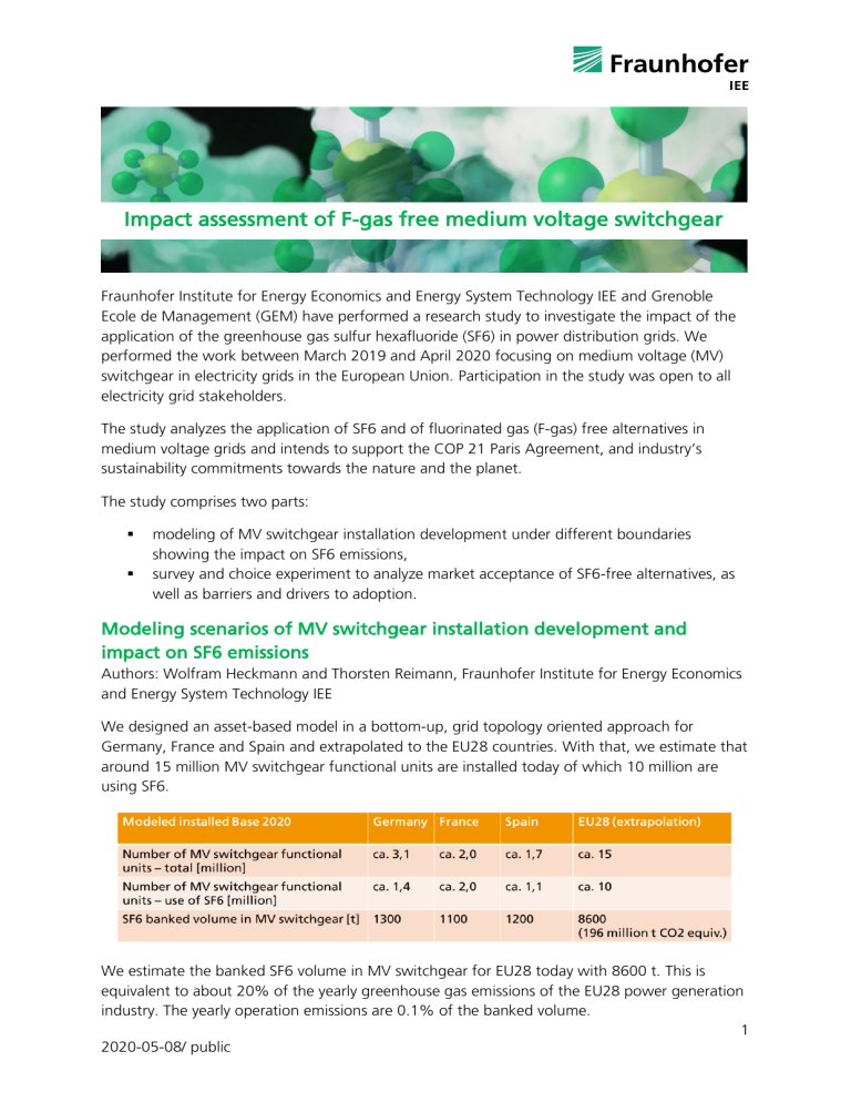 Impact assessment of F-gas free medium voltage switchgear Fraunhofer Institute for Energy Economics and Energy System Technology IEE and Grenoble Ecole de Management (GEM) have performed a research study to investigate the impact of the application of the greenhouse gas sulfur hexafluoride (SF6) in power distribution grids. We performed the work between March 2019 and April 2020 focusing on medium voltage (MV) switchgear in electricity grids in the European Union. Participation in the study was open to all electricity grid stakeholders. The study analyzes the application of SF6 and of fluorinated gas (F-gas) free alternatives in medium voltage grids and intends to support the COP 21 Paris Agreement, and industry’s sustainability commitments towards the nature and the planet. The study comprises two parts: modeling of MV switchgear installation development under different boundaries showing the impact on SF6 emissions, survey and choice experiment to analyze market acceptance of SF6-free alternatives, as well as barriers and drivers to adoption. Modeling scenarios of MV switchgear installation development and impact on SF6 emissions Authors: Wolfram Heckmann and Thorsten Reimann, Fraunhofer Institute for Energy Economics and Energy System Technology IEE We designed an asset-based model in a bottom-up, grid topology oriented approach for Germany, France and Spain and extrapolated to the EU28 countries. With that, we estimate that around 15 million MV switchgear functional units are installed today of which 10 million are using SF6. We estimate the banked SF6 volume in MV switchgear for EU28 today with 8600 t. This is equivalent to about 20% of the yearly greenhouse gas emissions of the EU28 power generation industry. The yearly operation emissions are 0.1% of the banked volume. 1 2020-05-08/ public The model allows investigating the impact and sensitivity of variable technical parameters (e.g. grid extension, technology market shares, switchgear lifetime) or changes in policy and regulation (e.g. forced replacement) from 2025 until 2050 with an outlook to 2100. Three main drivers define the development of SF6 emissions in medium voltage switchgear: network extensions, operation emissions, and end-of-life handling. The end-of-life handling has the key role. Network extension effects are also significant. We expect network extensions due to demand increase but mainly due to the increase in renewable energy installations leading to an increase of about 40% in MV switchgear installations until 2050. Provided a steady market share of SF6 applications this leads to the same increase of the banked SF6 volume and yearly operation emissions. We recommend starting as soon as possible using F-gas free equipment wherever applicable to minimize network extension effects on greenhouse gas emissions. Considering the European Green Deal and Circular Economy, zero emissions by 2050 regarding the installed base is only achievable by forced replacement of switchgear with F-gas free technology. For the replacement high quality end-of-life handling is the key to minimize greenhouse gas emissions. Regulations for the decommissioning of SF6 equipment are in place but there is uncertainty of the actual implementation and little experience regarding the fractured private market. We expect leakage rates ranging from 1.5% (industry best practice) to 40% (private market worst case) with a best guess of 10% leakages in average during the whole end-of-life process. Reducing the average leakages from 10% to 5% will reduce the overall emissions by about 460 t SF6 or 40%. The implementation of high quality lifetime management processes and monitoring Europe-wide is essential to minimize the impact of end-of-life leakages before starting forced replacement. While we expect a well-established end-of-life management for utilities and bigger industries, incentives like credits for controlled decommissioning of SF6 equipment could be considered to reach the fractured private market. Empirical study investigating the environmental and socio-economic impact of SF6 and its alternatives in medium voltage switchgear Authors: Marie-Charlotte Guetlein and Carine Sebi, Grenoble Ecole de Management The aim of this study is to better understand customer-purchasing criteria for medium voltage (MV) switchgear, including the interplay of technical, economic as well as environmental aspects. This knowledge can be used to predict market development, in particular with regard to the emergence of SF6-free technologies. Since new alternatives to SF6 have not yet widely penetrated the market, empirical analysis cannot draw on observed adoption behavior to elicit market acceptance of these alternatives. Therefore, a survey including stated preferences choice experiments (SPCE) was carried out among users of primary and secondary MV switchgear as well as intermediaries in different sectors (including utilities, renewable energy, and other private industry sectors). Respondents were selected to be company representatives with knowledge about switchgear and ideally involved in the switchgear procurement process. The survey was completed anonymously by a total of 443 respondents in five European countries. 2 2020-05-08/ public SPCEs involve constructing hypothetic choice scenarios where alternatives (e.g., products, services) are described by a range of attributes (e.g., price, size). In this study, respondents were successively asked to choose one alternative from a set of MV switchgear alternatives. They were expected to make trade-offs between the attributes characterizing the different MV switchgear alternatives to select their most preferred alternative. This method allows notably eliciting customers’ preferences and willingness to pay for different attributes of MV switchgear, including for instance compactness, global warming impact, and absence of F-gases. Furthermore, the declarative survey explicitly investigated barriers and drivers to
