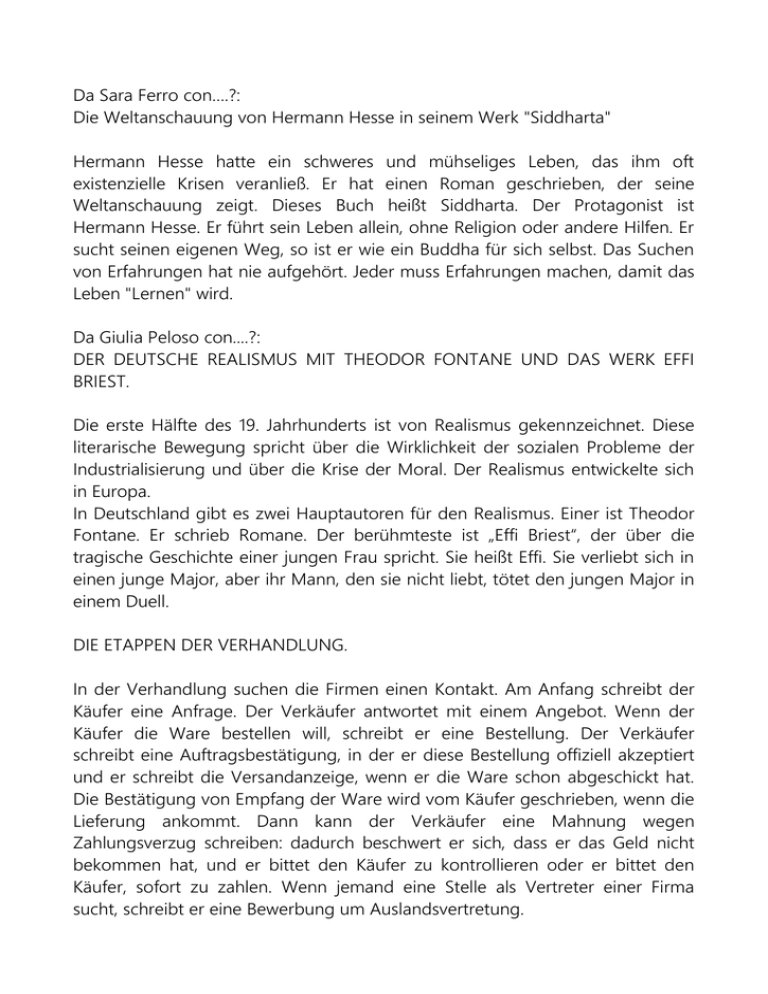 Da Sara Ferro con….?: Die Weltanschauung von Hermann Hesse in seinem Werk "Siddharta" Hermann Hesse hatte ein schweres und mühseliges Leben, das ihm oft existenzielle Krisen veranließ. Er hat einen Roman geschrieben, der seine Weltanschauung zeigt. Dieses Buch heißt Siddharta. Der Protagonist ist Hermann Hesse. Er führt sein Leben allein, ohne Religion oder andere Hilfen. Er sucht seinen eigenen Weg, so ist er wie ein Buddha für sich selbst. Das Suchen von Erfahrungen hat nie aufgehört. Jeder muss Erfahrungen machen, damit das Leben "Lernen" wird. Da Giulia Peloso con....?: DER DEUTSCHE REALISMUS MIT THEODOR FONTANE UND DAS WERK EFFI BRIEST. Die erste Hälfte des 19. Jahrhunderts ist von Realismus gekennzeichnet. Diese literarische Bewegung spricht über die Wirklichkeit der sozialen Probleme der Industrialisierung und über die Krise der Moral. Der Realismus entwickelte sich in Europa. In Deutschland gibt es zwei Hauptautoren für den Realismus. Einer ist Theodor Fontane. Er schrieb Romane. Der berühmteste ist „Effi Briest“, der über die tragische Geschichte einer jungen Frau spricht. Sie heißt Effi. Sie verliebt sich in einen junge Major, aber ihr Mann, den sie nicht liebt, tötet den jungen Major in einem Duell. DIE ETAPPEN DER VERHANDLUNG. In der Verhandlung suchen die Firmen einen Kontakt. Am Anfang schreibt der Käufer eine Anfrage. Der Verkäufer antwortet mit einem Angebot. Wenn der Käufer die Ware bestellen will, schreibt er eine Bestellung. Der Verkäufer schreibt eine Auftragsbestätigung, in der er diese Bestellung offiziell akzeptiert und er schreibt die Versandanzeige, wenn er die Ware schon abgeschickt hat. Die Bestätigung von Empfang der Ware wird vom Käufer geschrieben, wenn die Lieferung ankommt. Dann kann der Verkäufer eine Mahnung wegen Zahlungsverzug schreiben: dadurch beschwert er sich, dass er das Geld nicht bekommen hat, und er bittet den Käufer zu kontrollieren oder er bittet den Käufer, sofort zu zahlen. Wenn jemand eine Stelle als Vertreter einer Firma sucht, schreibt er eine Bewerbung um Auslandsvertretung. Da Giorgia Perinoni con...?: 1) Der Naturalismus in Deutschland und Europa am Beispiel von Hauptmanns Werk „Die Weber“. Im zweiten Hälften des 19. Jahrhunderts entwickelte sich in Frankreich die literarische Bewegung des Naturalismus und der Begründer war Emile Zola. In dieser Zeit muss der Schriftsteller objektiv sein. In Deutschland haben die Werke von Gerhart Hauptmann genau dieses Merkmal. Im Werk „Die Weber“ - von diesem wichtigen Vertreter des deutschen Naturalismus - spricht er über typische Inhalte des Naturalismus wie z.B. Wirklichkeit, Gesellschaft und Proletariat. In der Zeit des Naturalismus gibt es viele soziale Probleme, so schriebt der Schriftsteller nicht Poesie bzw. Gedichte, sondern Epik, weil epische Texte (d.h. Prosa) besser sind, um die Realität mit ihren Problemen zu beschreiben. 2) Problematische Situationen in der Verhandlung: der Widerruf der Bestellung und das Gegenangebot des Verkäufer. In der Verhandlung haben wir zwei typische problematische Situationen: den Widerruf der Bestellung und das Gegenangebot des Verkäufer. Das erste Problem ergibt sich, wenn der Käufer eine Bestellung gesendet hat, aber er merkt, dass er die Ware nicht mehr braucht. In diesem Fall kann er einen Widerruf der Bestellung schreiben. Darin bittet er den Verkäufer, seine Bestellung zu annullieren. Das zweite Problem kann passieren, wenn der Verkäufer nicht in der Lage ist, die Bestellung des Käufers zu den vereinbarten Bedingungen zu erledigen: z.B. wenn die Ware nicht mehr lieferbar ist, oder wenn er die Ware innerhalb des vereinbarten Termins nicht liefern kann. Es kann auch passieren, dass der Verkäufer die bestellte Ware zu den angebotenen Preisen nicht liefern kann. In diesem Fall kann der Verkäufer dem Käufer ein Gegenangebot schicken, in dem er ein neues Modell, Termin oder die Ware zu einem anderen Preis anbietet. Da Jonida Gjergji & Mariarosa Pasquali : 1) Die Bewegungen des Impressionismus und des Symbolismus auch mit Bezug auf die Rolle Wiens. Der Impressionismus und der Symbolismus sind zwei künstlerische Bewegungen, die in dem 19. Jahrhundert in Frankreich entstanden. Das Wort "Impressionismus" stammt aus dem Titel des Bildes von Monet "Impression Soleil Levant". Das heißt, dass der Impressionismus die Gefühle und die Eindrücke des Künstlers zeigt. Diese Bewegung entwickelte sich vor allem in der Malerei aber auch in der Musik. Der Symbolismus stellte durch Symbole die versteckten Bedeutungen dar, weil die Künstler an der Wirklichkeit nicht interessiert waren. Diese Bewegung entwickelte sich hauptsächlich in der Literatur. In dieser Zeit hatte Wien eine wichtige Rolle. Diese Stadt war Zentrum und Treffpunkt von vielen Künstlern, die Dichter, Schriftsteller, Maler, Architekten und Musiker waren. Wien war wichtig auch für die Medizin und die Psychoanalyse, die von Sigmund Freud begründet wurde. 2) Das Angebot. Das Angebot wird von dem Verkäufer an den Käufer gesendet, nachdem er die Anfrage des Käufers bekommen hat. Es kann allgemein oder bestimmt sein. Das allgemeine Angebot gibt allgemeine Informationen über die Produktion des Verkäufers. Normalerweise sendet der Verkäufer einen Katalog und das Angebot ist unverbindlich für den Verkäufer. Das bestimmte Angebot gibt präzise Informationen über einige Produkte und es umfasst die Masse, die Farbe, die Lieferung und die Zahlungsbedingungen. Das detallierte Angebot ist immer verbindlich für den Verkäufer aber manchmal kann man einige Klauseln finden, die die Verbindlichkeit des Verkäufers einschränken. Diese Klauseln können die Menge der Ware, die Preise oder das Datum der Lieferung betreffen. In anderen Fallen kann man auch die allgemeine Klausel "unverbindlich" finden. Da Sara Cordioli e Deborah Adami: 1) Die Zeit zwischen dem Ende des ersten Weltkriegs und der Teilung Deutschlands. Die Zeit nach dem Ende des ersten Weltkriegs ist v