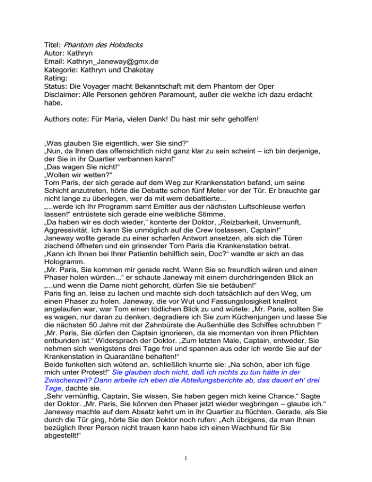 Titel: Phantom des Holodecks Autor: Kathryn Email: [email protected] Kategorie: Kathryn und Chakotay Rating: Status: Die Voyager macht Bekanntschaft mit dem Phantom der Oper Disclaimer: Alle Personen gehören Paramount, außer die welche ich dazu erdacht habe. Authors note: Für Maria, vielen Dank! Du hast mir sehr geholfen! „Was glauben Sie eigentlich, wer Sie sind?“ „Nun, da Ihnen das offensichtlich nicht ganz klar zu sein scheint – ich bin derjenige, der Sie in ihr Quartier verbannen kann!“ „Das wagen Sie nicht!“ „Wollen wir wetten?“ Tom Paris, der sich gerade auf dem Weg zur Krankenstation befand, um seine Schicht anzutreten, hörte die Debatte schon fünf Meter vor der Tür. Er brauchte gar nicht lange zu überlegen, wer da mit wem debattierte... „...werde ich Ihr Programm samt Emitter aus der nächsten Luftschleuse werfen lassen!“ entrüstete sich gerade eine weibliche Stimme. „Da haben wir es doch wieder,“ konterte der Doktor, „Reizbarkeit, Unvernunft, Aggressivität. Ich kann Sie unmöglich auf die Crew loslassen, Captain!“ Janeway wollte gerade zu einer scharfen Antwort ansetzen, als sich die Türen zischend öffneten und ein grinsender Tom Paris die Krankenstation betrat. „Kann ich Ihnen bei Ihrer Patientin behilflich sein, Doc?“ wandte er sich an das Hologramm. „Mr. Paris, Sie kommen mir gerade recht. Wenn Sie so freundlich wären und einen Phaser holen würden...“ er schaute Janeway mit einem durchdringenden Blick an „...und wenn die Dame nicht gehorcht, dürfen Sie sie betäuben!“ Paris fing an, leise zu lachen und machte sich doch tatsächlich auf den Weg, um einen Phaser zu holen. Janeway, die vor Wut und Fassungslosigkeit knallrot angelaufen war, war Tom einen tödlichen Blick zu und wütete: „Mr. Paris, sollten Sie es wagen, nur daran zu denken, degradiere ich Sie zum Küchenjungen und lasse Sie die nächsten 50 Jahre mit der Zahnbürste die Außenhülle des Schiffes schrubben !“ „Mr. Paris, Sie dürfen den Captain ignorieren, da sie momentan von ihren Pflichten entbunden ist.“ Widersprach der Doktor. „Zum letzten Male, Captain, entweder, Sie nehmen sich wenigstens drei Tage frei und spannen aus oder ich werde Sie auf der Krankenstation in Quarantäne behalten!“ Beide funkelten sich wütend an, schließlich knurrte sie: „Na schön, aber ich füge mich unter Protest!“ Sie glauben doch nicht, daß ich nichts zu tun hätte in der Zwischenzeit? Dann arbeite ich eben die Abteilungsberichte ab, das dauert eh‘ drei Tage, dachte sie. „Sehr vernünftig, Captain, Sie wissen, Sie haben gegen mich keine Chance.“ Sagte der Doktor. „Mr. Paris, Sie können den Phaser jetzt wieder wegbringen – glaube ich.“ Janeway machte auf dem Absatz kehrt um in ihr Quartier zu flüchten. Gerade, als Sie durch die Tür ging, hörte Sie den Doktor noch rufen: „Ach übrigens, da man Ihnen bezüglich Ihrer Person nicht trauen kann habe ich einen Wachhund für Sie abgestellt!“ 1 Die Türen schlossen sich. Janeway war stehengeblieben und überlegt ernsthaft, ihre Drohung mit der Luftschleuse wahr zu machen. 5 Minuten später erreichte sie ihr Quartier. Drinnen stapfte sie wütend einige Runden umher. Was bildet sich diese Lichterscheinung eigentlich ein! Ein Captain darf sein Schiff nie verlassen, auch mental nicht...dieser...dieser..... ! Leider fielen ihr die passenden Worte nicht ein. Sie ließ sich nach einigen weiteren Runden in einen Sessel fallen und dachte nach, wie sie sich am unauffälligsten den Anweisungen des Docs entziehen könnte. Wachhund – pah ! Mit diesem „Wachhund“ werde ich schon fertig werden, wäre ja gelacht! Da sie nach einigen Sekunden zu der Überzeugung kam, beim Baden würden ihr die besten Ideen kommen, entschloß sie sich für ein Schaumbad. Aber vorher.... „Kaffee, schwarz.“ wandte sie sich an den Replikator, der ihr auch prompt das gewünschte lieferte. „Endlich mal einer, der ohne Widerrede das tut, was ich sage“, murmelte sie vor sich hin, während sie genüßlich ihr Lebenselixier trank. Eine Stunde später, nach einem sehr entspannenden Schaumbad das ihr leider aber auch keine Ideen brachte, saß Kathryn mit einem weißen Leinenkleid bekleidet gemütlich auf ihrer Couch, eine Tasse Kaffee in der Hand und wollte sich endlich an die Arbeit machen – viele viele unbearbeitete Padds lagen vor ihr. Das heißt, sie lagen auf einmal nicht mehr vor ihr! Wo zur Hölle sind die ganzen Berichte? Nachdem sie ihr ganzes Quartier auf den Kopf gestellt hatte und außer Staub nichts gefunden hatte, beschloß sie, ihren 1. Offizier zu Rate zu ziehen. „Janeway an Chakotay. “ „Chakotay hier.“ „Chakotay, wissen Sie zufälligerweise, wo die ganzen Padds mit den Statusberichten geblieben sind?“ „Ähm, wenn Sie mich so fragen, naja, ja, ich weiß wo sie sind...“ „Und wo sind sie?“ „Ähhhh, ........ bei mir !“ „Wie bitte ? Wo sind sie? Wie kommen Sie zu MEINEN Padds????“ „Moment mal, Kathryn, zuerst einmal sind das nicht ihre Padds, sondern die der Sternenflotte und zweitens sind sie, soweit ich informiert bin, für die nächsten 3 Tage beurlaubt.“ „CHAKOTAY! Sie Verräter!“ „Ich handle nur auf Befehl! Auch übrigens, der Doktor hat mich gebeten, etwas auf Sie aufzupassen, damit Sie auch wirklich zu Ihrer Entspannung kommen – deshalb habe ich mir auch die nächsten 3 Tage frei genommen!“ „Ach, dann sind Sie wohl mein Wachhund? Dann gewöhnen Sie sich schon mal daran, daß Hunde immer einen Maulkorb tragen und an der Leine geführt werden.“ „Aber aber, wer wird denn gleich sauer sein?“ „Das reicht. Janeway Ende.“ Sie unterbrach die Comverbindung mit ihrem ersten Offizier. Ausgerechnet Chakotay hatte der Doktor beauftragt, seinetwegen hatte sie jeden Abend Probleme beim einschlafen, ständig mußte sie an ihn denken, sie war einfach bis über beide Ohren in ihn verknallt. Sie stellte sich vor, das Bett mit ihm zu teilen und.... Halt! Soweit darf es nie kom