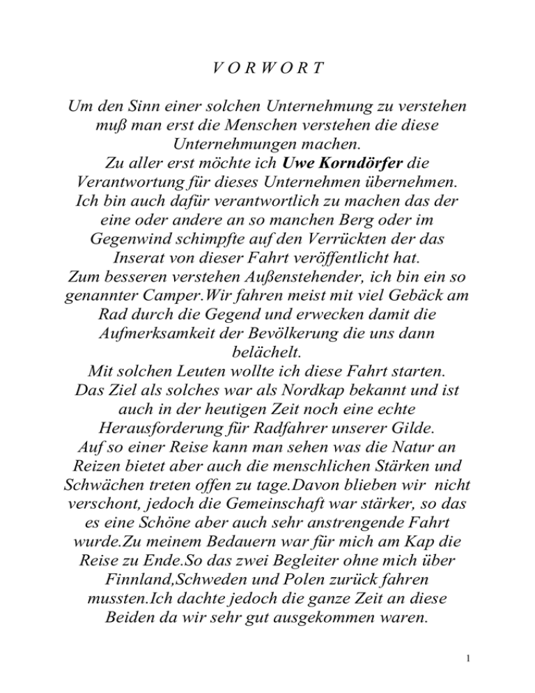 VORWORT Um den Sinn einer solchen Unternehmung zu verstehen muß man erst die Menschen verstehen die diese Unternehmungen machen. Zu aller erst möchte ich Uwe Korndörfer die Verantwortung für dieses Unternehmen übernehmen. Ich bin auch dafür verantwortlich zu machen das der eine oder andere an so manchen Berg oder im Gegenwind schimpfte auf den Verrückten der das Inserat von dieser Fahrt veröffentlicht hat. Zum besseren verstehen Außenstehender, ich bin ein so genannter Camper.Wir fahren meist mit viel Gebäck am Rad durch die Gegend und erwecken damit die Aufmerksamkeit der Bevölkerung die uns dann belächelt. Mit solchen Leuten wollte ich diese Fahrt starten. Das Ziel als solches war als Nordkap bekannt und ist auch in der heutigen Zeit noch eine echte Herausforderung für Radfahrer unserer Gilde. Auf so einer Reise kann man sehen was die Natur an Reizen bietet aber auch die menschlichen Stärken und Schwächen treten offen zu tage.Davon blieben wir nicht verschont, jedoch die Gemeinschaft war stärker, so das es eine Schöne aber auch sehr anstrengende Fahrt wurde.Zu meinem Bedauern war für mich am Kap die Reise zu Ende.So das zwei Begleiter ohne mich über Finnland,Schweden und Polen zurück fahren mussten.Ich dachte jedoch die ganze Zeit an diese Beiden da wir sehr gut ausgekommen waren. 1 Reisetagebuch Norwegen 2003 Begleiter:Ulrich(Uli)Käppel Ralph Ludwig Hans Karnikowski Start: 13508 Km Strecke: 2397,8 Km Ende:15906 Km Zeit: 155 h Durchschnitt:15,47 km/h Höhenmeter:28306 m http://gallerie.nordkapfahrerpedalritter.de/albums/upload/norwegen/norwegen-urlaub03.jpg Datum: 21.07.2003 Start: 20.07.2003 13.30 Uhr Kiel Fährhafen Ankunft: 21.07.2003 12.05 Camping Bokstad Zeit: 1.38 h (Fährhafen Oslo-Campingplatz) Km: 16,2 Durchs. 11,74 km/h Strecke:Fährhafen Oslo-Stadtgebiet –Camping Bokstad 2 Besonderheiten:Zum ersten Mal erlebten wir die Natur von Norwegen pur.Leider sahen wir auch die ersten Berge die auf unseren Weg zum ständigen Begleiter werden sollten.Vor dem Campingplatz wurden wir von einem Gewitterguss überrascht der es in sich hatte.Nachdem es vorbei war begann ich mit der Suche von Uli und Ralph die schon da sein wollten und nach einer Platzrunde es auch waren.Mir gingen gemeinsam Essen um uns besser kennen zu lernen da wir uns fremd waren.Die meisten brauchten es nicht da wir wussten was zu tun war.Camper bleibt Camper. http://gallerie.nordkapfahrerpedalritter.de/albums/upload/norwegen/norwegen-urlaub014.jpg Datum:22.07.2003 Start Ankunft Zeit: Km: Durchschn. 08.15 Camping Bokstad 18.00 Jönnes 7.09 h 110,0 15,5 km/h Strecke:Camping Bokstad-Oslo-E168-E 16-Hohnefoss über die E 35 zur E245 Richtung Dokka. Besonderheiten:Um für uns “Neue”unangenehme Steigungen zu vermeiden wurde kurzerhand die Route geändert und wir fuhren nicht durch den Wald sondern wählten E-Straßen.Das Ersparte uns unangenehme Anstiege ,hatte aber zur Folge, das Hans uns in den Ohren lag die Autos führen ihm die Pedale ab. Wir also wieder einen anderen weg gesucht wo wir fern von Hauptstraßen waren jedoch ging es ihm dann nicht schnell genug so das wir E-Straßen wieder benutzen durften.BisHonefoss war zum Glück nur eine einzige Steigung vorhanden und diese war 63,0 km lang es ging stetig Berg auf.In Honefoss wurde eine Rast an einer Bäckerei gemacht wo wir neugierigen Blicken ausgesetzt waren Für die Nacht fanden wir bei Norwegern einen Platz zum Schlafen an ihrer Hofauffahrt.Wir schliefen alle sehr beruhigt ein den ersten Tag überstanden zu haben. http://gallerie.nordkapfahrerpedalritter.de/albums/upload/norwegen/norwegen-urlaub022.jpg 3 Datum: 23.07.2003 Start: 08.30 Jönnes Ankunft: 18.15Lillehammer Zeit: 8.04 h Km: 104,0 Durchschn.:13,61 km/h Strecke:Jönnes-Dokka-Lillehammer Besonderheiten:Obwohl diese Etappe als Landschaftlich wundervoll einzustufen war der Weg führte die letzten 40 km an dem Fjört von Honefoss bis Dokka entlang und wahr sehenswert.Uns waren auch noch Gedanken fremd das das Buch welches mir als Ratgeber diente nicht die Wahrheit sagen könnte das war unser Fehler.Im Buch waren 10 km sanfte Anstiege beschrieben das trieb uns auch dazu die ersten 10 km voll zu fahren das war unser nächster Fehler der sich böse rächte.Leider sagte das Buch nichts über die nachfolgenden 12 km Steigungen von 7-10%.Wir waren den Tränen nahe wenn wir um eine Kurve kamen und der Berg ging immer noch weiter es war zum Heulen zu den Bergen kam auch noch ein Hungerloch dazu das einfach nichts mehr ging.Meine Platten von den Radschuhen blendeten mich schon da sich zwischen meinem Mund und den Schuhen nur ein großes Loch befand..Das Wetter war wunderbar kein Regen oder Gegenwind. Morgen geht es nach Ringebü damit beginnt die Route die Uli ausgearbeitet hat. Wir (Camper)sprachen am Abend immer die Strecke für den nächsten Tag ab. http://gallerie.nordkapfahrerpedalritter.de/albums/upload/norwegen/norwegen-urlaub041.jpg Datum: 24.07.2003 Start: 09.00 Uhr Lillehammer Ankunft: 18.00 Uhr Mäsaplassen Zeit: 6,40 h Km: 76,0 Durchschn.:11,88 km/h Strecke:Lillehammert-Faberg-Ringebü-Mäsaplassen Besonderheiten:Die Stadt Lillehammer ist wunderbar da die Altstadt sehr gut erhalten wurde.Sie lädt zum Bummeln ein leider trifft diese Aussage nicht für den Campingplatz zu.Für sowenig Service wollten die Betreiber auch noch Geld für das Laden vom Handy haben. 4 http://gallerie.nordkapfahrerpedalritter.de/albums/upload/norwegen/norwegen-urlaub039.jpg Es ging gemütlich von hier über Faberg nach Ringebü.Fahren ließ es sich gut obwohl der Belag alles andere als gut war.Hier begann der Ernst der Reise,knallharte Berge 13 km lang und bis zu 10%Steigung.Stillschweigend und von den Fehlern des Vortages gelernt gingen wir mit unserer Energie nicht mehr so sorglos um und begannen zu schieben wenn es über 9% wurden.Wie man so schön sagt,lernt man die Kameraden erst in der Not kennen.Uli und Ralph gehören zu der Klasse von Menschen die man kennen sollteMan mag mir nachsagen was man will 
