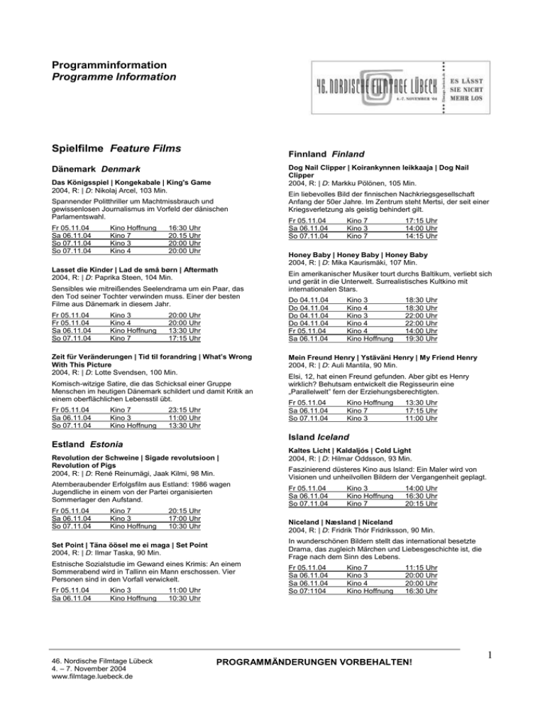 Programminformation Programme Information Spielfilme Feature Films Finnland Finland Dog Nail Clipper | Koirankynnen leikkaaja | Dog Nail Clipper 2004, R: | D: Markku Pölönen, 105 Min. Dänemark Denmark Das Königsspiel | Kongekabale | King's Game 2004, R: | D: Nikolaj Arcel, 103 Min. Spannender Politthriller um Machtmissbrauch und gewissenlosen Journalismus im Vorfeld der dänischen Parlamentswahl. Fr 05.11.04 Sa 06.11.04 So 07.11.04 So 07.11.04 Kino Hoffnung Kino 7 Kino 3 Kino 4 16:30 Uhr 20.15 Uhr 20:00 Uhr 20:00 Uhr Sensibles wie mitreißendes Seelendrama um ein Paar, das den Tod seiner Tochter verwinden muss. Einer der besten Filme aus Dänemark in diesem Jahr. Kino 3 Kino 4 Kino Hoffnung Kino 7 20:00 Uhr 20:00 Uhr 13:30 Uhr 17:15 Uhr Zeit für Veränderungen | Tid til forandring | What’s Wrong With This Picture 2004, R: | D: Lotte Svendsen, 100 Min. Komisch-witzige Satire, die das Schicksal einer Gruppe Menschen im heutigen Dänemark schildert und damit Kritik an einem oberflächlichen Lebensstil übt. Fr 05.11.04 Sa 06.11.04 So 07.11.04 Kino 7 Kino 3 Kino Hoffnung 23:15 Uhr 11:00 Uhr 13:30 Uhr Revolution der Schweine | Sigade revolutsioon | Revolution of Pigs 2004, R: | D: René Reinumägi, Jaak Kilmi, 98 Min. Atemberaubender Erfolgsfilm aus Estland: 1986 wagen Jugendliche in einem von der Partei organisierten Sommerlager den Aufstand. Kino 7 Kino 3 Kino Hoffnung 20:15 Uhr 17:00 Uhr 10:30 Uhr 46. Nordische Filmtage Lübeck 4. – 7. November 2004 www.filmtage.luebeck.de Ein amerikanischer Musiker tourt durchs Baltikum, verliebt sich und gerät in die Unterwelt. Surrealistisches Kultkino mit internationalen Stars. Do 04.11.04 Do 04.11.04 Do 04.11.04 Do 04.11.04 Fr 05.11.04 Sa 06.11.04 Kino 3 Kino 4 Kino 3 Kino 4 Kino 4 Kino Hoffnung 18:30 Uhr 18:30 Uhr 22:00 Uhr 22:00 Uhr 14:00 Uhr 19:30 Uhr Mein Freund Henry | Ystäväni Henry | My Friend Henry 2004, R: | D: Auli Mantila, 90 Min. Elsi, 12, hat einen Freund gefunden. Aber gibt es Henry wirklich? Behutsam entwickelt die Regisseurin eine „Parallelwelt” fern der Erziehungsberechtigten. Fr 05.11.04 Sa 06.11.04 So 07.11.04 Kino Hoffnung Kino 7 Kino 3 13:30 Uhr 17:15 Uhr 11:00 Uhr 11:00 Uhr 10:30 Uhr Kaltes Licht | Kaldaljós | Cold Light 2004, R: | D: Hilmar Oddsson, 93 Min. Faszinierend düsteres Kino aus Island: Ein Maler wird von Visionen und unheilvollen Bildern der Vergangenheit geplagt. Fr 05.11.04 Sa 06.11.04 So 07.11.04 Kino 3 Kino Hoffnung Kino 7 14:00 Uhr 16:30 Uhr 20:15 Uhr In wunderschönen Bildern stellt das international besetzte Drama, das zugleich Märchen und Liebesgeschichte ist, die Frage nach dem Sinn des Lebens. Estnische Sozialstudie im Gewand eines Krimis: An einem Sommerabend wird in Tallinn ein Mann erschossen. Vier Personen sind in den Vorfall verwickelt. Kino 3 Kino Hoffnung 17:15 Uhr 14:00 Uhr 14:15 Uhr Niceland | Næsland | Niceland 2004, R: | D: Fridrik Thór Fridriksson, 90 Min. Set Point | Täna öösel me ei maga | Set Point 2004, R: | D: Ilmar Taska, 90 Min. Fr 05.11.04 Sa 06.11.04 Kino 7 Kino 3 Kino 7 Island Iceland Estland Estonia Fr 05.11.04 Sa 06.11.04 So 07.11.04 Fr 05.11.04 Sa 06.11.04 So 07.11.04 Honey Baby | Honey Baby | Honey Baby 2004, R: | D: Mika Kaurismäki, 107 Min. Lasset die Kinder | Lad de små børn | Aftermath 2004, R: | D: Paprika Steen, 104 Min. Fr 05.11.04 Fr 05.11.04 Sa 06.11.04 So 07.11.04 Ein liebevolles Bild der finnischen Nachkriegsgesellschaft Anfang der 50er Jahre. Im Zentrum steht Mertsi, der seit einer Kriegsverletzung als geistig behindert gilt. Fr 05.11.04 Sa 06.11.04 Sa 06.11.04 So 07:1104 Kino 7 Kino 3 Kino 4 Kino Hoffnung 11:15 Uhr 20:00 Uhr 20:00 Uhr 16:30 Uhr PROGRAMMÄNDERUNGEN VORBEHALTEN! 1 Das Erbe | Arven | Inheritance 2003, R: | D: Per Fly, 115 Min. Norwegen Norway Bázo | Bázo | Bázo 2003, R: | D: Lars Göran Pettersson, 100 Min. Ein samisches Roadmovie mit Krimi-Appeal: eine hervorragend besetzte Odyssee durch den Norden Norwegens, Schwedens und Finnlands. Fr 05.11.04 Sa 06.11.04 So 07.11.04 So 07.11.04 Kino Hoffnung Kino 7 Kino 3 Kino 4 10:30 Uhr 11:15 Uhr 17:00 Uhr 17:00 Uhr Kino 7 20:15 Uhr Ein Feelgood-Movie der feinsten Sorte: Das Leben der frustrierten Hausfrau Hannah ändert sich schlagartig, als in ihrem Ort eine Gospeltruppe eintrifft. Do 04.11.2004 Starkes Großstadtdrama um einen jungen Mann im Kleinkriminellenmilieu, der für eine neue Chance kämpft. Regiedebüt des norwegischen Stars Aksel Hennie. Kino 7 Kino 3 Kino 4 Kino Hoffnung Do 04.11.04 Oh Happy Day | Oh Happy Day | Oh Happy Day 2004, R: | D: Hella Joof, 93 Min. Uno | Uno | Uno 2004, R: | D: Aksel Hennie, 103 Min. Fr 05.11.04 Sa 06.11.04 Sa 06.11.04 So 07.11.04 Per Flys Spielfilm über einen Unternehmenserben, der in die Mühlen familiärer Strukturen und sozialer Zwänge gerät. Gewinner des NDR-Förderpreises 2003. 14:15 Uhr 23:00 Uhr 23:00 Uhr 19:30 Uhr Kino 6 22:30 Uhr Schweden Sweden Drowning Ghost | Strandvaskaren | The Drowning Ghost 2004, R: | D: Mikael Håfström, 100 Min. Atemberaubender Gruselthriller von Erfolgsregisseur Mikael Håfström („Evil") über den Geist eines Mörders, der eine Schule heimsucht. Schweden Sweden Do 04.11.04 Illusive Tracks | Skenbart | Illusive Tracks 2003, R: | D: Peter Dalle, 97 Min. Dokumentarfilme Documentary Films Turbulente Kriminalkomödie und Film-Noir-Hommage um einen Schweden, der Ende 1945 eine waghalsige Zugreise nach Berlin antritt. Fr 05.11.04 Fr 05.11.04 Sa 06.11.04 So 07.11.04 Kino 3 Kino 4 Kino Hoffnung Kino 7 Kino 3 Kino 4 Kino 7 23:15 Uhr Dänemark Denmark 110 % Greve | 110% Greve | 110% Suburbia 2004, R: | D: Jesper Jack, Vibe Mogensen, Mette-Ann Schepelern, Anja Hauberg Mortensen, 88 Min. 17:00 Uhr 17:00 Uhr 22:30 Uhr 11:15 Uhr Ein Loch in meinem Herzen | Ett håll i mitt hjärta | A Hole in My Heart 2004, R: | D: Lukas Moodysson, 98 Min. Ein auf engstem Raum spielendes Psychodrama um einen Porno-Filmer, sein Darsteller-Pärchen und seinen TeenagerSohn. Nichts für schwache Nerven. Fr 05.11.04 Fr 05.11.04 Sa 06.11.04 K