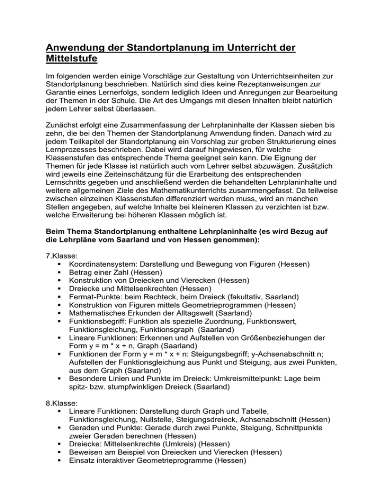 Anwendung der Standortplanung im Unterricht der Mittelstufe Im folgenden werden einige Vorschläge zur Gestaltung von Unterrichtseinheiten zur Standortplanung beschrieben. Natürlich sind dies keine Rezeptanweisungen zur Garantie eines Lernerfolgs, sondern lediglich Ideen und Anregungen zur Bearbeitung der Themen in der Schule. Die Art des Umgangs mit diesen Inhalten bleibt natürlich jedem Lehrer selbst überlassen. Zunächst erfolgt eine Zusammenfassung der Lehrplaninhalte der Klassen sieben bis zehn, die bei den Themen der Standortplanung Anwendung finden. Danach wird zu jedem Teilkapitel der Standortplanung ein Vorschlag zur groben Strukturierung eines Lernprozesses beschrieben. Dabei wird darauf hingewiesen, für welche Klassenstufen das entsprechende Thema geeignet sein kann. Die Eignung der Themen für jede Klasse ist natürlich auch vom Lehrer selbst abzuwägen. Zusätzlich wird jeweils eine Zeiteinschätzung für die Erarbeitung des entsprechenden Lernschritts gegeben und anschließend werden die behandelten Lehrplaninhalte und weitere allgemeinen Ziele des Mathematikunterrichts zusammengefasst. Da teilweise zwischen einzelnen Klassenstufen differenziert werden muss, wird an manchen Stellen angegeben, auf welche Inhalte bei kleineren Klassen zu verzichten ist bzw. welche Erweiterung bei höheren Klassen möglich ist. Beim Thema Standortplanung enthaltene Lehrplaninhalte (es wird Bezug auf die Lehrpläne vom Saarland und von Hessen genommen): 7.Klasse: Koordinatensystem: Darstellung und Bewegung von Figuren (Hessen) Betrag einer Zahl (Hessen) Konstruktion von Dreiecken und Vierecken (Hessen) Dreiecke und Mittelsenkrechten (Hessen) Fermat-Punkte: beim Rechteck, beim Dreieck (fakultativ, Saarland) Konstruktion von Figuren mittels Geometrieprogrammen (Hessen) Mathematisches Erkunden der Alltagswelt (Saarland) Funktionsbegriff: Funktion als spezielle Zuordnung, Funktionswert, Funktionsgleichung, Funktionsgraph (Saarland) Lineare Funktionen: Erkennen und Aufstellen von Größenbeziehungen der Form y = m * x + n, Graph (Saarland) Funktionen der Form y = m * x + n: Steigungsbegriff; y-Achsenabschnitt n; Aufstellen der Funktionsgleichung aus Punkt und Steigung, aus zwei Punkten, aus dem Graph (Saarland) Besondere Linien und Punkte im Dreieck: Umkreismittelpunkt: Lage beim spitz- bzw. stumpfwinkligen Dreieck (Saarland) 8.Klasse: Lineare Funktionen: Darstellung durch Graph und Tabelle, Funktionsgleichung, Nullstelle, Steigungsdreieck, Achsenabschnitt (Hessen) Geraden und Punkte: Gerade durch zwei Punkte, Steigung, Schnittpunkte zweier Geraden berechnen (Hessen) Dreiecke: Mittelsenkrechte (Umkreis) (Hessen) Beweisen am Beispiel von Dreiecken und Vierecken (Hessen) Einsatz interaktiver Geometrieprogramme (Hessen) Anwendungsbeispiele zu Linearen Funktionen aus dem Alltag (Saarland) Lineare Gleichungssysteme mit zwei Gleichungen und zwei Variabeln (Saarland) Quadratwurzelterme (Saarland) Satz von Pythagoras (Saarland) Haus der Vierecke: Fermat-Punkt (Saarland) 9.Klasse: Lineare Gleichungssysteme: Systeme von zwei linearen Gleichungen in zwei Variablen (Hessen) Quadratwurzeln: Begriff der Quadratwurzel, Rechnen mit Quadratwurzeln Satz des Pythagoras (Hessen) Formulieren eines Lösungsalgorithmus (fakultativ, Saarland) 10.Klasse: Algorithmen (Hessen) Ideen zur Anwendung des Center Standortproblems im Unterricht Unterrichtseinheit zur Vorstellung des Center Standortproblems (geeignet für Klassenstufe 7 – 10) (Zeiteinschätzung: 45 min) Vorschlag zum groben Verlauf der Unterrichtseinheit: Die Schüler sollen zunächst mit der allgemeinen Problemstellung (Suchen eines Standorts für die Basis eines Notfallhubschraubers) vertraut gemacht werden; mögliche Materialien: Unfallbericht aus der Zeitung, Karte mit eingezeichneten Unfallorten. Daraufhin könnten sich die Lernenden selbst weitere Alltagssituationen mit analoger Problemstellung überlegen (z.B. Planung eines Feuerwehrhauses, Standortwahl einer Rettungsdienststelle usw.) Anschließend sollte die mathematische Modellierung des Problems erarbeitet werden; als Übung empfiehlt sich, die Schüler selbständig gegebene Einsatzorte bzw. festgelegte Hubschrauberstandorte in ein Koordinatensystem eintragen und die Entfernung von Punkten bestimmen zu lassen. Weiterhin sollte der Zielfunktionswert anhand mehrerer Beispiele berechnet werden. Zusatz: man kann den Schülern in einem Beispiel mehrere Alternativstandorte anbieten und anschließen eine Diskussion über die Qualität der Standorte durchführen. Vereinfachung für die 7. und 8. Klasse: Die Zielfunktion sollte als Beispiel eines Funktionsbegriffs eingeführt werden, allerdings in einer für die Schüler verständlichen Art (also eventuell ohne den Term für die euklidische Entfernung). Wurden Quadratwurzelterme noch nicht behandelt, kann auf die exakte Formulierung der euklidischen Entfernung, sowie auf die Herleitung dieses Terms mit Hilfe des Satzes von Pythagoras verzichtet werden. Alternativ kann die Entfernung zweier Punkte näherungsweise im Koordinatensystem abgelesen werden. Behandelte Lehrplaninhalte und weitere Ziele des Mathematikunterrichts: Verständnis von einfachen Modellierungsprozessen Mathematisches Erkunden der Alltagswelt (7. Klasse) Umgang mit dem Koordinatensystem (7.Klasse) Quadratwurzelterme (8. bzw. 9. Klasse) Satz von Pythagoras (8. bzw. 9. Klasse) Unterrichtseinheit zur geometrischen Lösung von Center Standortproblemen bei zwei gegebenen Einsatzorten (geeignet für Klassenstufe 7 – 10) (Zeiteinschätzung: 45 min) Vorschlag zum groben Verlauf der Unterrichtseinheit: Zunächst sollte den Schülern ein konkretes Beispiel vorgelegt werden, anhand dessen sie selbst Vermutungen über den optimalen Standort anstellen können (dies kann zum Beispiel auch in Gruppenarbeit erfolgen). Die Bestimmung des optimalen Standortes als Mittelpunkt der Verbindungsstrecke sollte dann erarbeitet werden (bei Durchführung einer Gruppenarbeit eventuell durch Ergebnispräsentation oder 