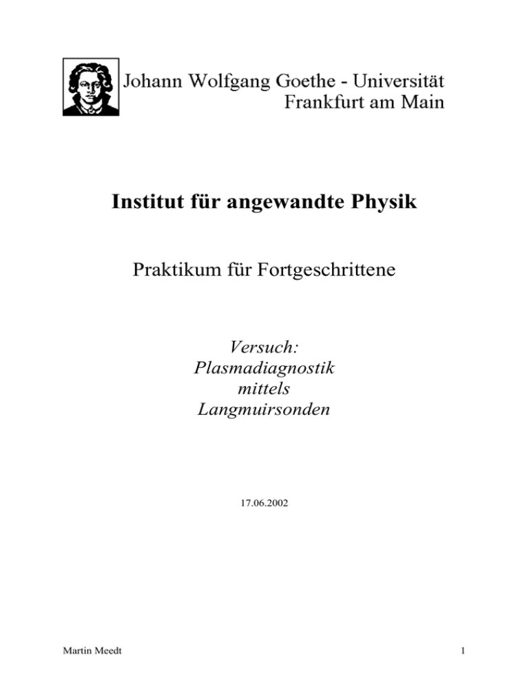 Institut für angewandte Physik Praktikum für Fortgeschrittene Versuch: Plasmadiagnostik mittels Langmuirsonden 17.06.2002 Martin Meedt 1 Inhaltsverzeichnis: GRUNDLAGEN UND THEORIE ....................................................................................................................... 3 PLASMA .............................................................................................................................................................. 3 LANGMUIR-SONDE .............................................................................................................................................. 5 VAKUUMPUMPEN ................................................................................................................................................ 6 VERSUCHSAUFBAU .......................................................................................................................................... 7 SKIZZE ................................................................................................................................................................ 7 BESCHREIBUNG ................................................................................................................................................... 7 VERSUCHSDURCHFÜHRUNG ........................................................................................................................ 8 BESTIMMUNG DES ENDDRUCKES ........................................................................................................................ 8 MESSUNG DER AUSPUMPKURVE ......................................................................................................................... 9 BESTIMMUNG DER LECKRATE ........................................................................................................................... 11 PLASMAVERSUCH.............................................................................................................................................. 12 LITERATURVERZEICHNIS ........................................................................................................................... 13 ANHANG ............................................................................................................................................................. 13 MITSCHRIFT ...................................................................................................................................................... 13 Martin Meedt 2 Grundlagen und Theorie Die Plasmatechnologie wird heute in Produktionsanlagen unterschiedlicher Bereiche benutzt. Unter dem Einsatz von Plasmen wird gereinigt, beleuchtet, geätzt und vieles mehr. Mit Hilfe der Plasmadiagnostik werden Produktionsanlagen die Plasma verwenden überwacht. Zu den wichtigsten Plasma-Parametern gehören die Plasmadichte, die Elektronentemperatur, die Debye-Länge und die Plasmafrequenz. Die Möglichkeiten zur Messung der Plasma-Parameter kann man in zwei grundlegend unterschiedlich Verfahren aufteilen. Die invasiven Messverfahren beruhen auf einem direkten Kontakt zu dem zu messendem Plasma. Hierzu gehören Verfahren, die auf elektrostatischen bzw. mechanischen Sonden oder auf der Massenspektroskopie beruhen. Nachteilig bei diesen Verfahren ist, dass sie nicht berührungslos sind. Bei den nicht invasiven Messverfahren tritt dieses Problem nicht auf. Zu diesen Messverfahren zählen Pyrometrie, Emissionsspektroskopie, und andere. In dem vorliegenden Versuch werden wir die Langmuirsonde verwenden. Dieses ist eine elektrostatische Sonde. Wir werden also ein invasives Messverfahren verwenden. Plasma Plasma ist ein hoch ionisiertes Gas, das aus einem Gemisch aus freien Elektronen, neutralen Teilchen und Ionen besteht. Es wirkt nach außen quasineutral. Plasma wird auch als vierter Aggregatszustand bezeichnet. Um diesen Aggregatszustand zu erreichen muss man das Gas auf mehrere tausend Kelvin erhitzen. Dann steigt der Ionisationsgrad des Gases auf beinahe 1. Der ideale Zustand eines Plasmas liegt bei dem VTG vor, dem vollständigen thermodynamischen Gleichgewicht. Die physikalischen Eigenschaften eines Gases im Plasmazustand unterscheiden sich stark von denen eines normalen Gases. So sind z. B. Gasströmungen stets mit elektrischen Strömen und folglich mit magnetischen Feldern verknüpft, die auf den Strömungsvorgang zurückwirken; aerodynamische Schwingungen im Plasma führen zur Ausstrahlung elektromagnetischer Wellen. Um Plasma zu beschreiben sind verschiedene Kenngrößen vorhanden. Dazu gehören Ionisationsgrad, die Verteilungsfunktionen des Plasmas, der Energieinhalt des Plasmas, die Elektrische Leitfähigkeit von Plasma, die Wärmeleitfähigkeit des Plasmas, die Plasmaschwingungsfrequenz, die Abschirmung und Debye-Länge, die Elektronentemperatur und die Plasmadichte. Der Ionisationsgrad xr gibt an, wie hoch der Anteil der Ionen der Kernladung Z in einem Plasma ist, das aus Atomen und positiv geladenen Ionen besteht, die mindestens r-fach ionisiert sind. Der Ionisationsgrad ist immer zwischen 0 und 1. Bei einem Ionisationsgrad von 0 ist der Stoff überhaupt nicht ionisiert. Martin Meedt 3 Z xr n i n i i r Z i 0 (1) Die Plasmaschwingungsfrequenz wird auch Langmuir-Frequenz genannt, wenn sie gleich der Eigenfrequenz der Plasmaschwingung ist. Die Plasmaschwingung ist eine kollektive Bewegung des Plasmas, die durch Raumladungsschwankungen bedingt wird. wP e 2 ne 0 me (2) Die Debye-Länge λD ist die charakteristische Länge für die Abschirmung eines Potentials. In einer Debye-Länge fällt das Potential auf das 1/e-fache ab. D 0 k BT 2 2e0 ne (3) Hierfür braucht man aber die Elektronentemperatur. Diese berechnet sich aus der BolzmannVerteilung. e U s U P kTe I I e Te eU s U P I k ln Ie (4) Die Plasmadichte errechnet sich aus: ne Ie eF 2me kTe (5) Plasma tritt nicht nur in künstlich erzeugt Umgebungen auf der Erde auf. Der überwiegende Teil der im All sich befindenden Materie be