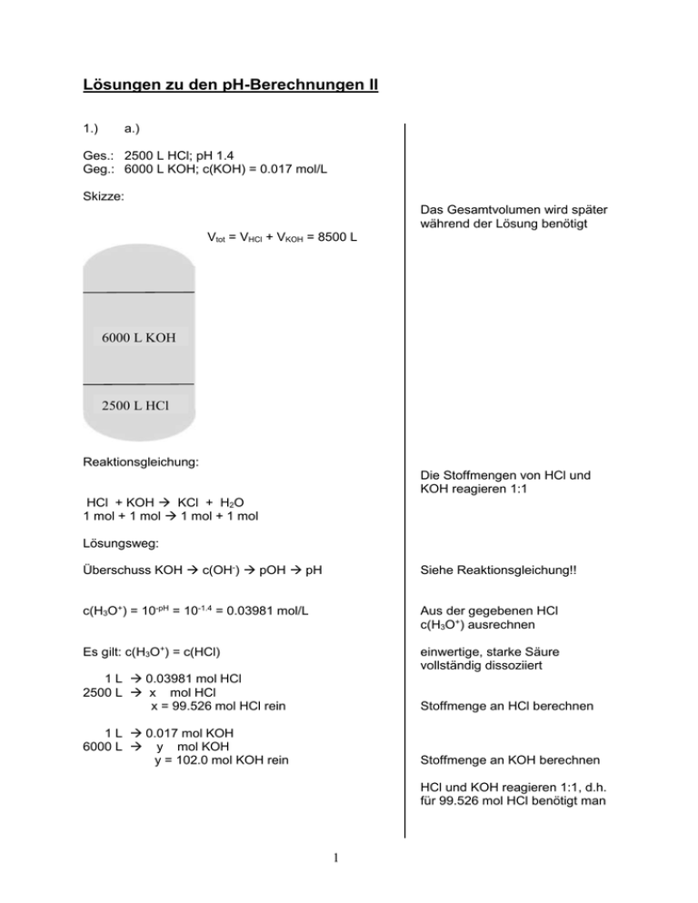 Lösungen zu den pH-Berechnungen II 1.) a.) Ges.: 2500 L HCl; pH 1.4 Geg.: 6000 L KOH; c(KOH) = 0.017 mol/L Skizze: Das Gesamtvolumen wird später während der Lösung benötigt Vtot = VHCl + VKOH = 8500 L 6000 L KOH 2500 L HCl Reaktionsgleichung: Die Stoffmengen von HCl und KOH reagieren 1:1 HCl + KOH KCl + H2O 1 mol + 1 mol 1 mol + 1 mol Lösungsweg: Überschuss KOH c(OH-) pOH pH Siehe Reaktionsgleichung!! c(H3O+) = 10-pH = 10-1.4 = 0.03981 mol/L Aus der gegebenen HCl c(H3O+) ausrechnen Es gilt: c(H3O+) = c(HCl) einwertige, starke Säure vollständig dissoziiert 1 L 0.03981 mol HCl 2500 L x mol HCl x = 99.526 mol HCl rein Stoffmenge an HCl berechnen 1 L 0.017 mol KOH 6000 L y mol KOH y = 102.0 mol KOH rein Stoffmenge an KOH berechnen HCl und KOH reagieren 1:1, d.h. für 99.526 mol HCl benötigt man 1 Überschuss an KOH: 102.0 mol – 99.526 mol = 2.474 mol Wichtig: Überschuss ist Im Gesamtvolumen von 8500 L!!! 99.526 mol KOH! c(KOH) für 1 L Lösung ausrechnen 8500 L Lsg. 2.474 mol KOH 1 L Lsg. z mol KOH z = 0.000291 mol KOH Es gilt: c(KOH) = c(OH-) einwertige, starke Base, vollständig dissoziiert pOH = - log·c(OH-) = - log 0.000291 = 3.536 pH = 14 – pOH = 14 – 3.536 = 10.464 = 10.46 1.) b.) siehe Teilaufgabe 1a! Ges.: Wieviele kg KCl entstehen? Geg.: 99.526 mol HCl Reaktionsgeichung: HCl + KOH KCl + H2O 1 mol + 1 mol 1 mol + 1 mol Lösungsweg: Reaktionsgleichung n(HCl) n(KCl) Masse KCl HCl + KOH KCl + H2O 1 mol + 1 mol 1 mol + 1 mol Stoffmengen reagieren 1:1!!! 99.526 mol x mol KCl x = 99.526 mol KCl 1 mol KCl 0.07456 kg 99.526 mol KCl y kg y = 7.42 kg KCl 2 2.) Ges.: pH-Wert der Natronlaugemischung nach der Reaktion Geg.: 16050 L HBr rein 500 kg NaOH, w = 2% 800 kg NaOH, w = 2.34% k (Natronlaugemischung) = 1.333 g/mL Reaktionsgleichung: HBr + NaOH NaBr + H2O 1 mol + 1 mol 1mol + 1 mol HBr und NaOH reagieren 1:1 Lösungsweg: Mischungsgleichung wm Masse NaOH rein n(HBr)+n(NaOH Überschuss NaOH c(OH-) pOH pH m1 • w1 + m2 • w2 = (m1 + m2) • wm Mischungsgleichung allgemein formulieren, dann ausrechnen 500 • 2 + 800 • 2.34 = (500 + 800) • x 1000 + 1872 = 500x + 800x 2872 = 1300x //:1300 2.209 = x wm = 2.209% Massenanteil der NaOHMischung ist 2.209%!!! 100.0 kg NaOH-Lsg. 2.209 kg NaOH rein 1300 kg NaOH-Lsg. y kg NaOH rein y = 28.72 kg NaOH rein Befindet sich in der Mischung 0.040 kg NaOH 1 mol 28.72 kg NaOH z mol z = 718 mol NaOH rein 22.4 L HBr 1 mol 16050 L HBr x mol x = 716.51 mol HBr Überschuss NaOH: 718 mol - 716.51 mol = 1.482 mol NaOH Weil HBr und NaOH 1:1 reagieren, wird nicht die ganze NaOH-Menge verbraucht! 1.333 g 0.001 L NaOH-Mischung 1300000 g y L NaOH-Mischung y = 975.24 L NaOH-Mischung 975.24 L NaOH-Mischung 1.482 mol 1 L NaOH-Mischung z mol z = 0.0015196 mol NaOH pH = 14 - pOH = 14 - (-log c(OH-)) = 14 - (-log 0.0015196) = 11.18 3 Stoffmenge NaOH pro Liter Lösung 3.) Ges.: c(H3O+) im Blut Geg.: pH 7.39 Lösungsweg: PH c(H3O+) c(H3O+) = 10-pH = 10-7.39 = 4 • 10-8 mol/L 4.) Ges.: Aussage Geg.: c(H3O+) = 0.00005 mol/L Lösungsweg: c(H3O+) pH Aussage pH = -log c(H3O+) = -log 0.00005 = 5.3 Die Lösung ist sauer 5.) a.) Ges.: pH-Wert Geg.: c(HCl) = 0.23 mol/L Lösungsweg: c(HCl) c(H3O+) pH Es gilt: c(HCl) = c(H3O+) einwertige, starke Säure, vollständig dissoziiert pH = -log c(H3O+) = -log 0.23 = 0.638 5.) b.) Ges.: pH-Wert Geg.: c(NaOH) = 0.14 mol/L Lösungsweg: c(NaOH) c(OH-) c(H3O+) pH starke, einwertige Base, vollständig dissoziiert Es gilt: c(NaOH) = c(OH-) pOH = -log c(OH-) = -log 0.14 = 0.8538 pH = 14 - pOH = 14 - 0.8538 = 13.15 4 5.) c.) Ges.: pH-Wert Geg.: c(Essigsäure) = 0.89 mol/L Dissoziationsgrad = 0.4% Lösungsweg: c(Essigsäure), Dissoziationsgrad c(H3O+) pH 0.89 mol Essigsäure 100% x mol Essigsäure 0.4% x = 0.0356 mol Essigsäure 0.0356 mol Essigsäure sind dissoziiert und dementsprechend für die Berechnung des pH relevant einwertige, schwache Säure, Dissoziationsgrad berücksichtigt! Es gilt: c(Essigsäure dissoziiert) = c(H3O+) pH = -log c(H3O+) = -log 0.0356 = 2.449 = 2.45 5.) d.) Ges.: pH-Wert Geg.: k (HNO3) = 2.45 g/50 mL Lösungsweg: K (HNO3) 1 L Lösung Molmasse HNO3 c(H3O+) pH 2.45 g HNO3 rein 50 mL x g HNO3 rein 1000 mL x = 49.0 g HNO3 rein 63.0 g HNO3 rein 1 mol 49.0 g HNO3 rein y mol y = 0.7777 mol HNO3 rein Es gilt: c(HNO3) = c(H3O+) Molmasse HNO3 in 1 L Lsg. einwertige, starke Säure, vollständig dissoziiert pH = -log c(H3O+) = -log 0.7777 = 0.1091 5 6.) Ges.: pH-Wert Geg.: K3PO4 - Lsg., k = 8.29 g/150 mL Lösungsweg: k(HNO3) Masse K3PO4 in 30 mL n(H3PO4) c(H3O+) pH 8.29 g K3PO4 150 mL x g K3PO4 30 mL x = 1.658 g K3PO4 Es gilt: 1 mol K3PO4 ergeben 1mol H3PO4 im Ionenaustauscher 1 mol K3PO4 212.28 g y mol K3PO4 1.658 g y = 0.00781 mol K3PO4 0.00781 mol H3PO4 In 1000 mL Lsg. sind 0.2603 mol H3PO4 0.00781 mol H3PO4 30 mL z mol H3PO4 1000 mL z = 0.2603 mol H3PO4 1000 mL 0.2603 mol H3PO4 rein Es gilt: c(H3O+) = c(H3PO4) • 3 dreiwertige, starke Säure, vollständig dissoziiert c(H3O+) = 0.2603 mol/L • 3 = 0.7810 mol/L pH = -log c(H3O+) = -log 0.7810 = 0.1073 7.) a.) Ges.: k (HCl) in mg/mL Geg.: pH 2.2 Lösungsweg: pH c(H3O+) c(HCl) Masse HCl k (HCl) c(H3O+) = 10-pH =10-2.2 = 0.006309 mol/L 36500 mg HCl 1 mol x mg HCl 0.006309 mol x = 230.28 mg HCl Masse HCl rein 1000 mL HCl 230.28 mg 1 mL HCl y mg y = 0.230 mg HCl rein k (HCl) = 0.230 mg/mL 6 7.) b.) Ges.: c(H3O+) Geg.: pH 10.8 Lösungsweg: pH c(H3O+) c(H3O+) = 10-pH = 10-10.8 = 1.584∙10-11 mol/L 7.) c.) Ges.: k (KOH) in g/m3 Geg.: pH 8.3 Lösungsweg: pOH c(OH-) c(KOH) Masse KOH k (KOH) pOH = 14 - pH = 14 - 8.3 = 5.7 c(OH-) = 10-pOH =10-5.7 = 0.000001995 mol/L Es gilt: c(OH-) = c(KOH) einwertige, starke Base 56.11 g 1 mol KOH x g 0.000001995 mol KOH x = 0.0001119 g KOH rein Masse KOH rein 1 L 0.0001119 g KOH rein 1000 L y g KOH rein y = 0.1119 g KOH rein k (KOH) = 0.1119 g/m3 7 8.) Ges.: Wieviele kg HCl (k = 1.100 g/mL; pH -0.438) werden für die Mischung benötigt? Geg.: 500 kg NaOH; k = 1.333 g/mL; c = 10 mol/L 300 kg HCl (k = 1.054 g/mL; pH = -0.1701) Skizze: x kg HCl 